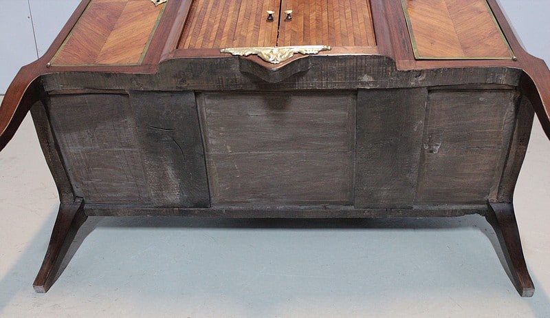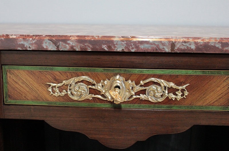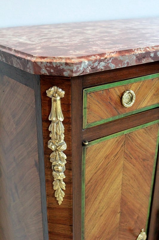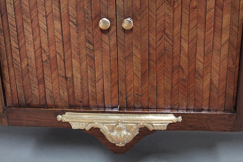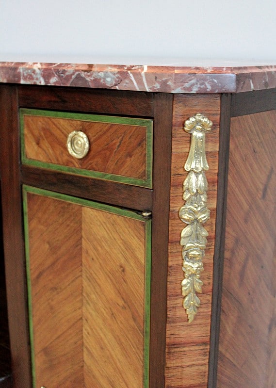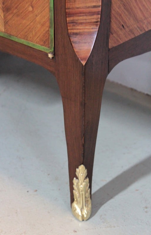 Décor marqueté d’encadrements de bois teinté vert et garnitures en bronze feuillagé.
