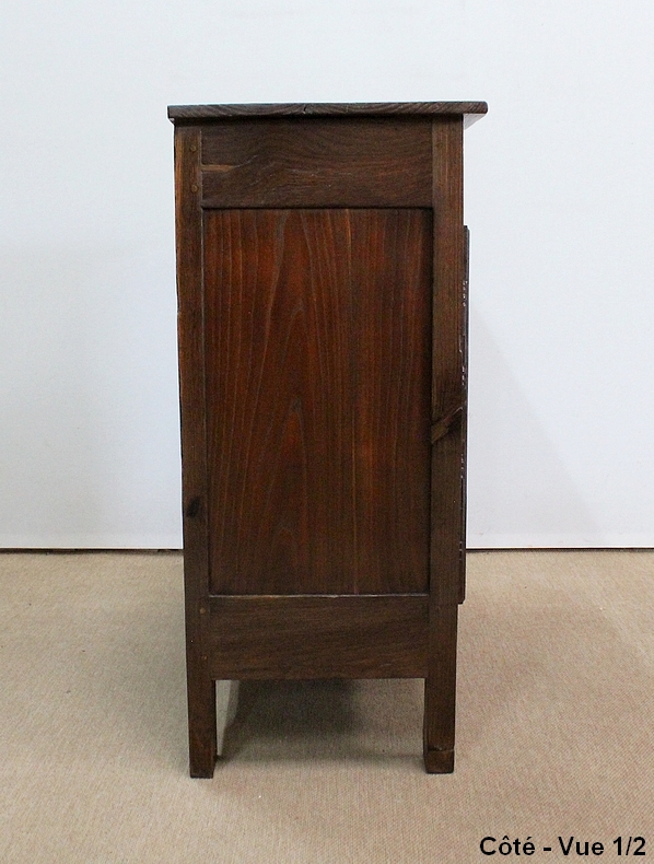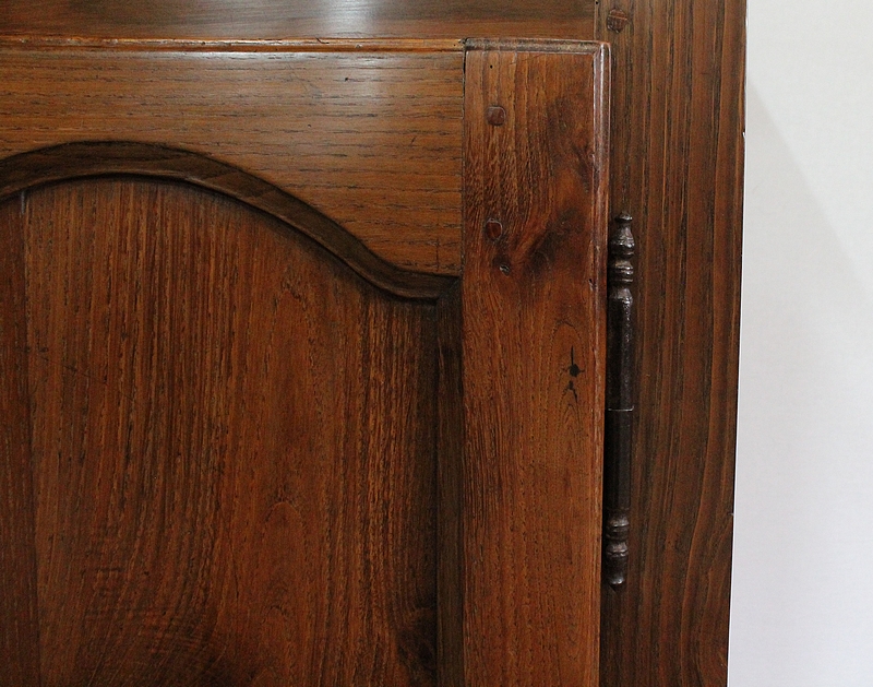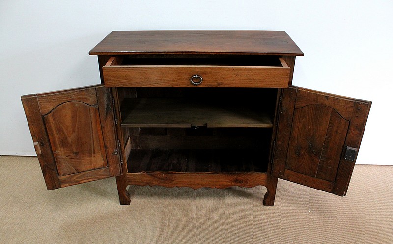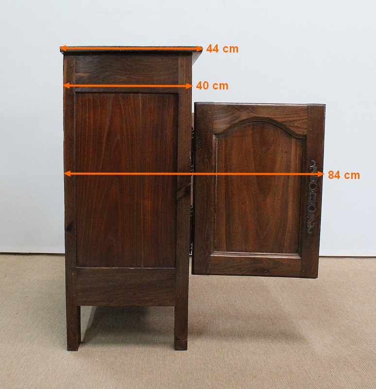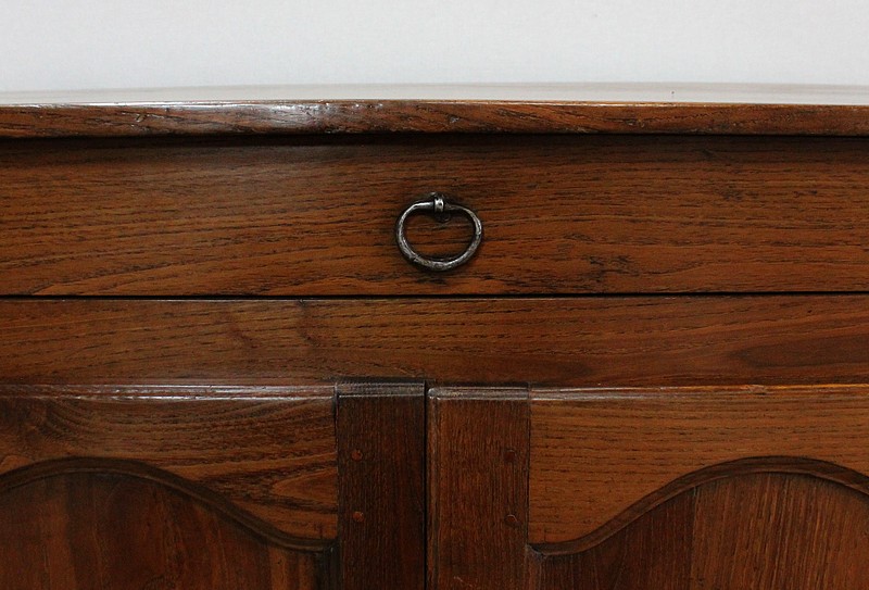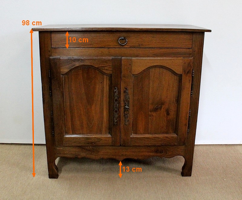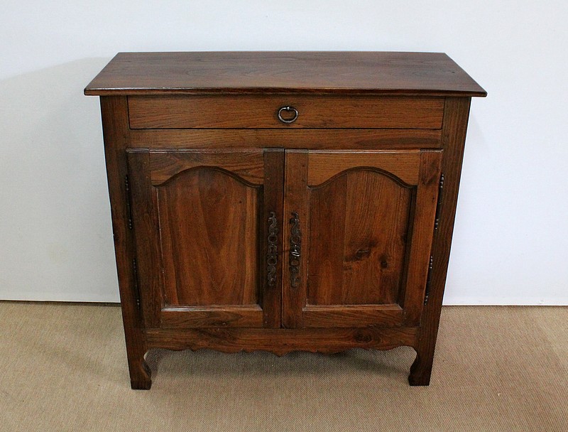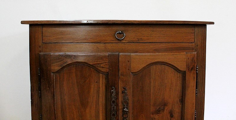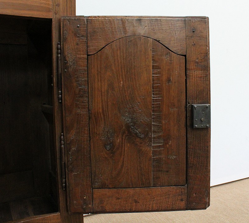 Composé d’un grand tiroir en ceinture ouvrant par une poignée avec attache en fer dans son centre, ce meuble de caractère est muni de deux portes à mouvement haut asymétrique se rejoignant au centre l’une sur l’autre sans pilastre. Ces portes présentent un intérieur à encadrement avec une légère moulure et de chaque côté des petits gonds en fer discret. Au centre deux entrées en fer élégamment ciselé bénéficient d’une serrure et d’une clé en état de fonctionnement. Cette ferronnerie est complètement authentique à cette époque. A l’intérieur de ce mobilier sobre nous découvrons une large étagère sur crémaillères.