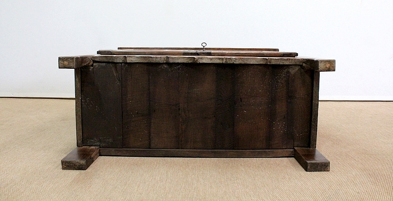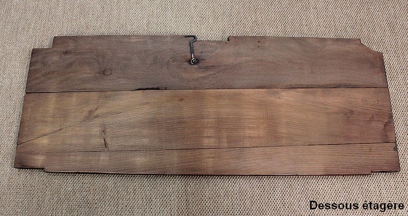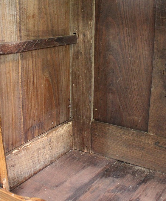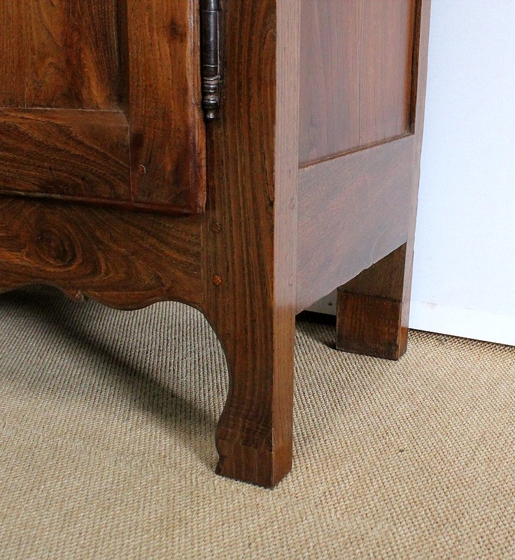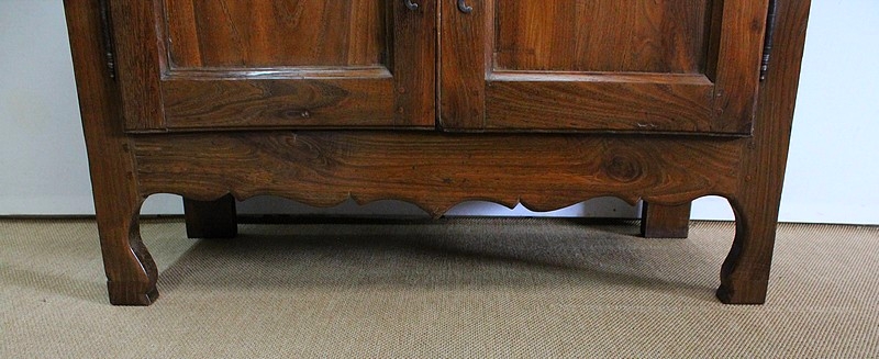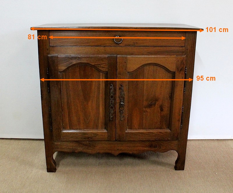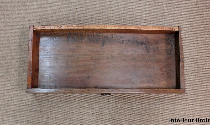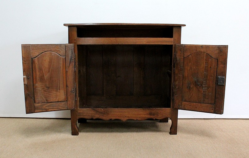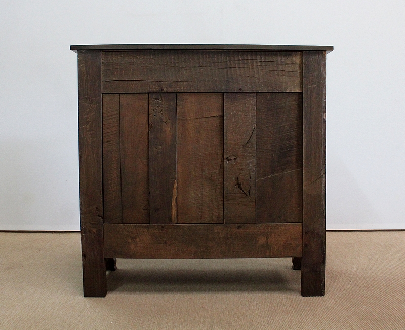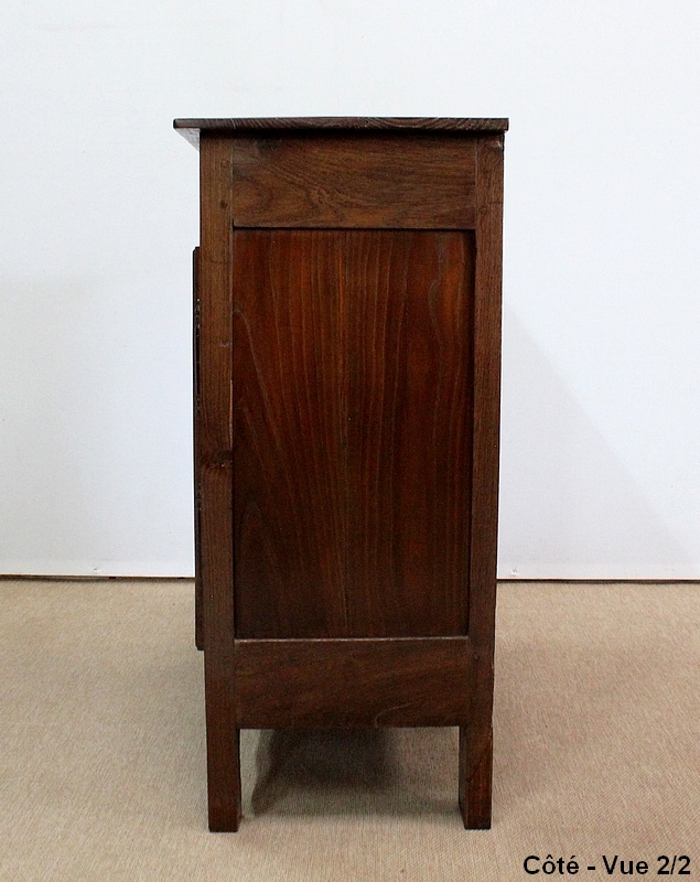 Composé d’un grand tiroir en ceinture ouvrant par une poignée avec attache en fer dans son centre, ce meuble de caractère est muni de deux portes à mouvement haut asymétrique se rejoignant au centre l’une sur l’autre sans pilastre. Ces portes présentent un intérieur à encadrement avec une légère moulure et de chaque côté des petits gonds en fer discret. Au centre deux entrées en fer élégamment ciselé bénéficient d’une serrure et d’une clé en état de fonctionnement. Cette ferronnerie est complètement authentique à cette époque. A l’intérieur de ce mobilier sobre nous découvrons une large étagère sur crémaillères.