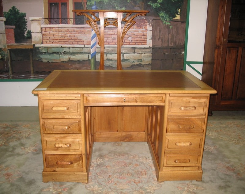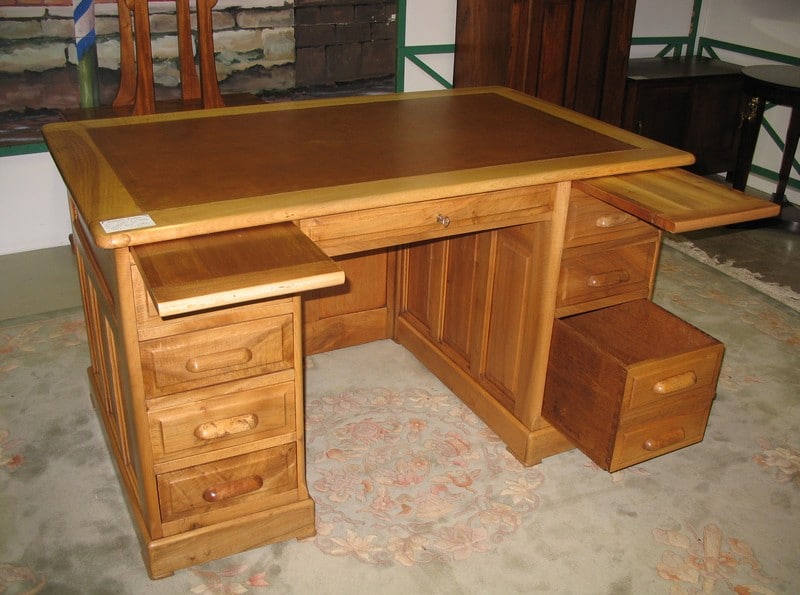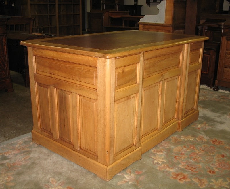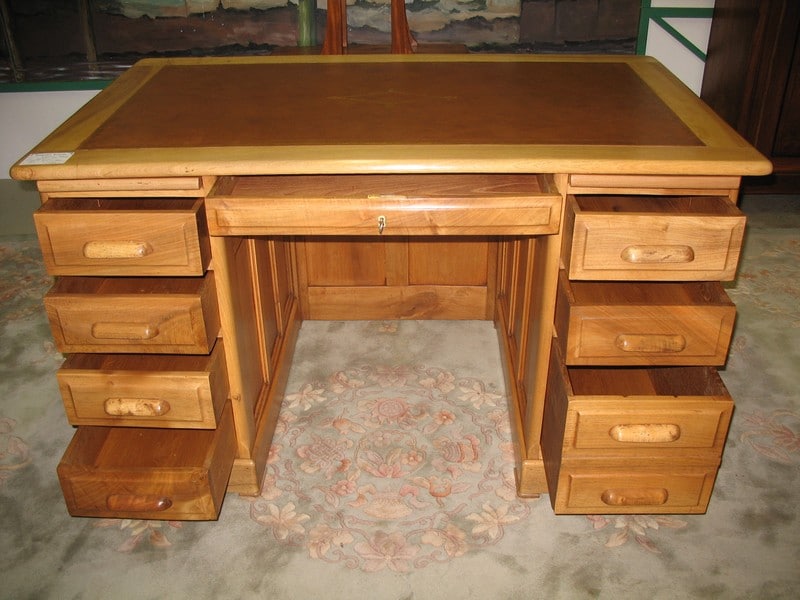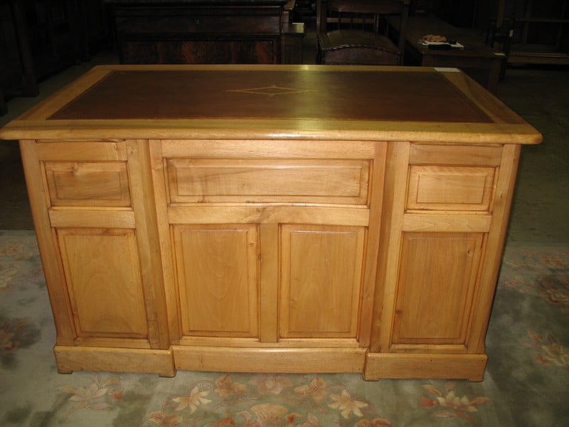 Bureau à caissons en Noyer blond ouvrant à 8 tiroirs dont 1 double et 2 tirettes. Dessus en cuir (remplacé)