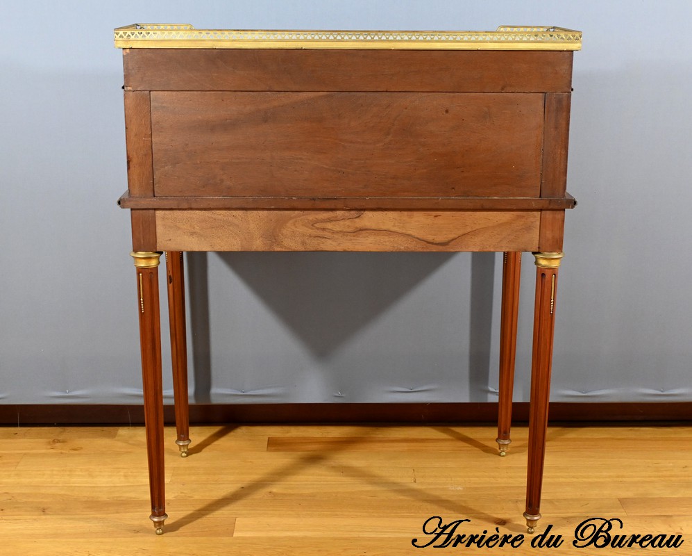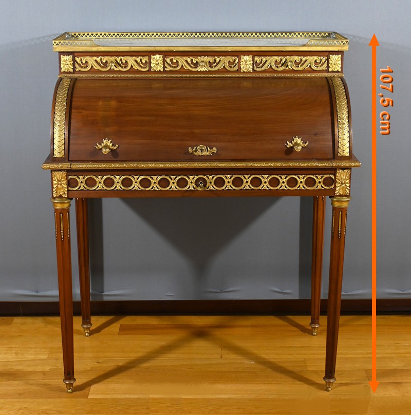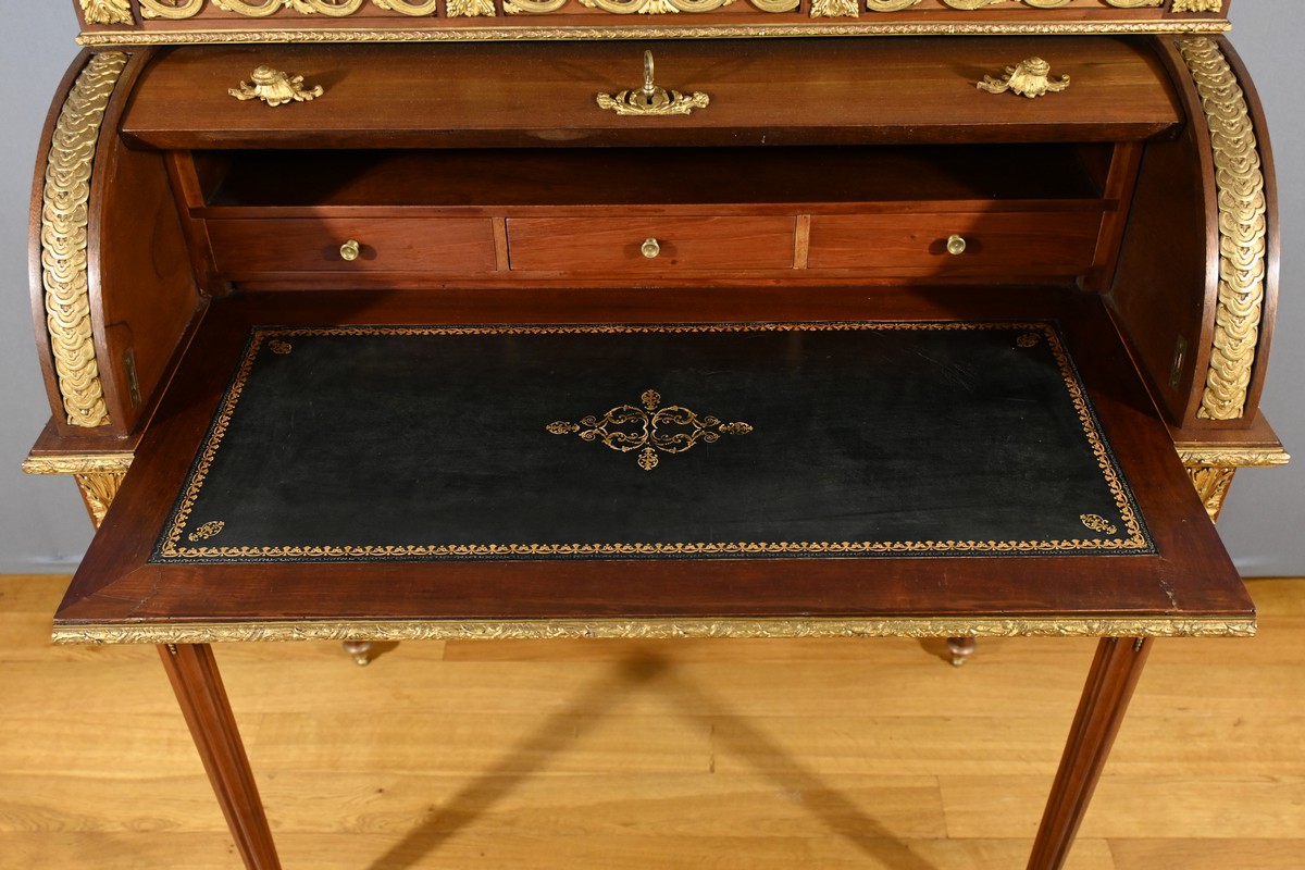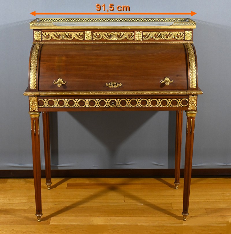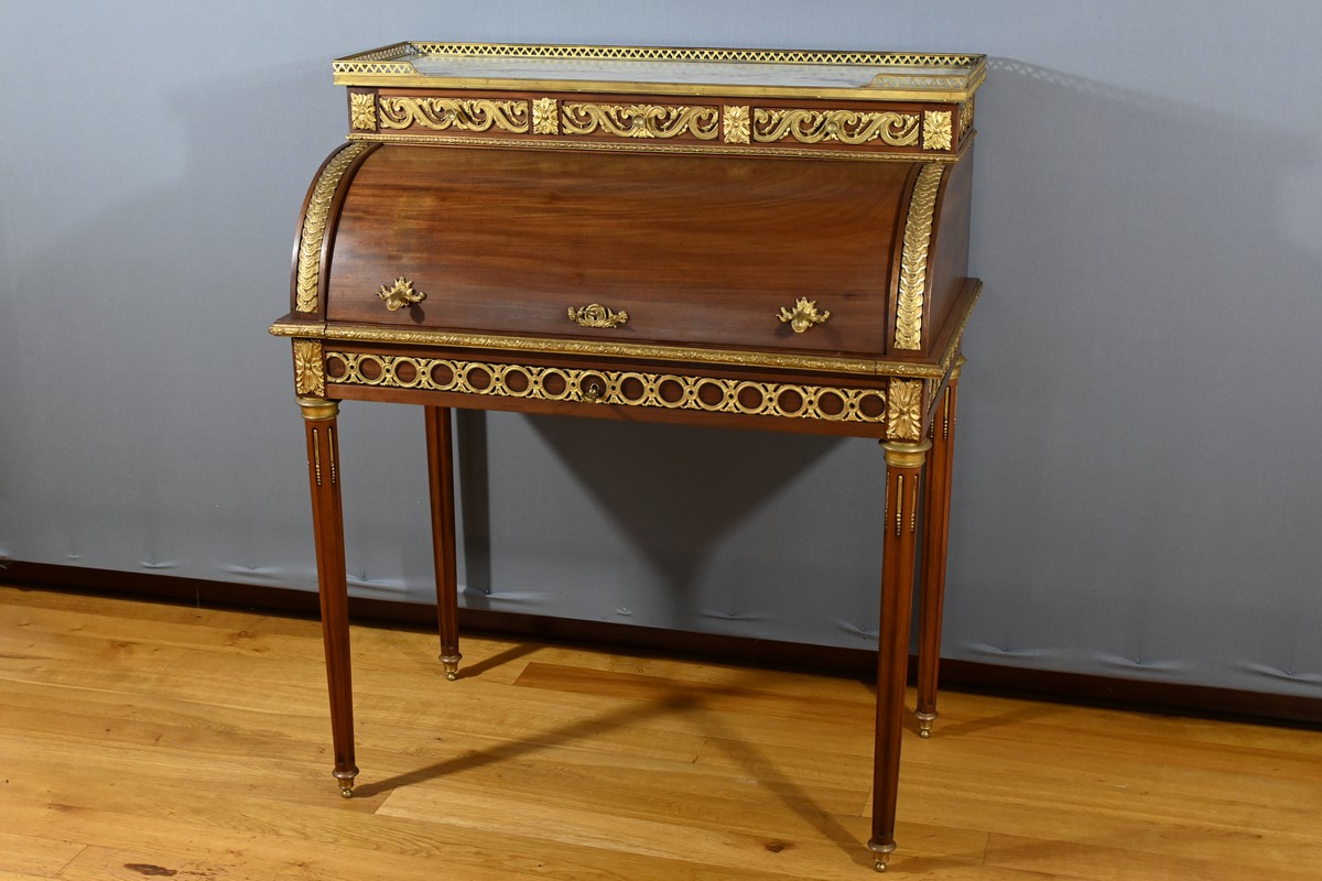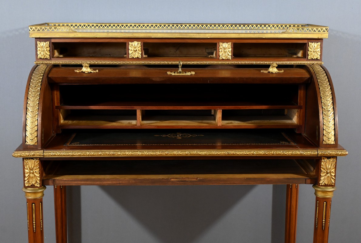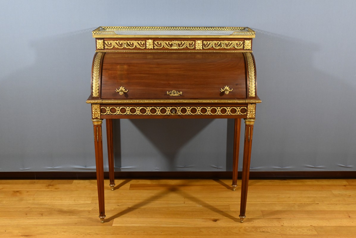 Ce petit bureau à cylindre de style Louis XVI en placage d’acajou est une pièce d’exception, alliant élégance et fonctionnalité.