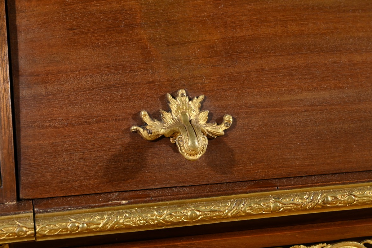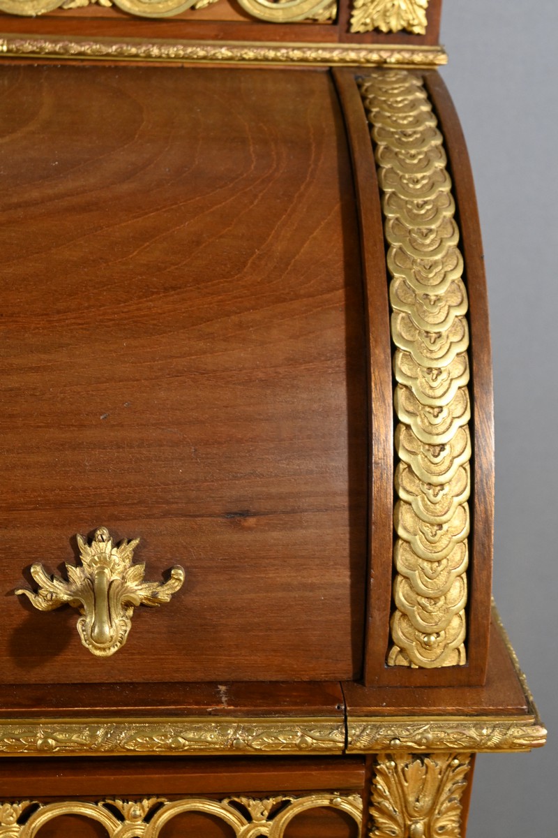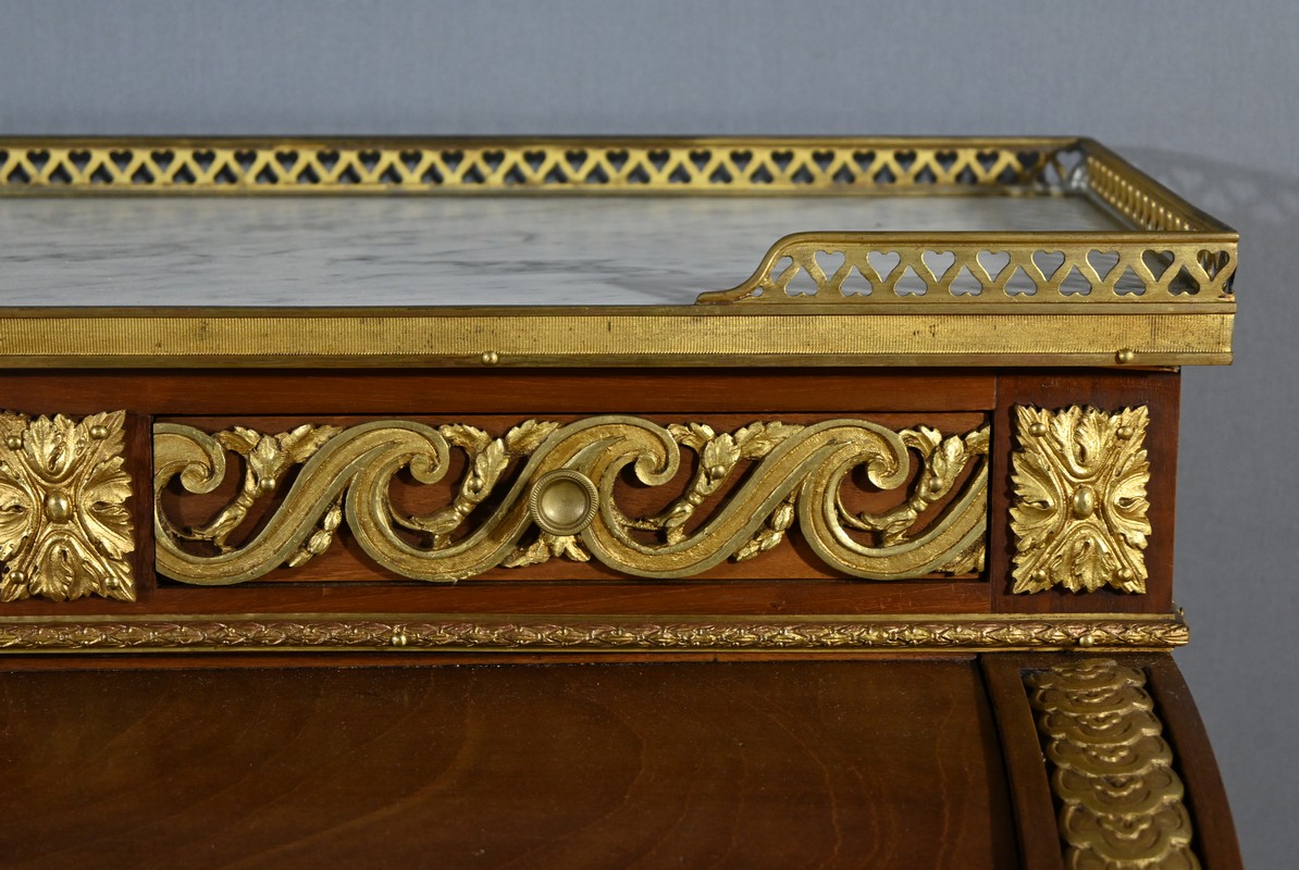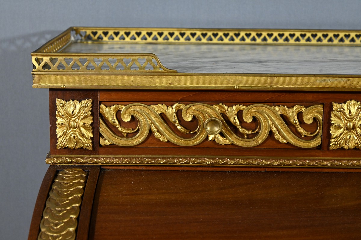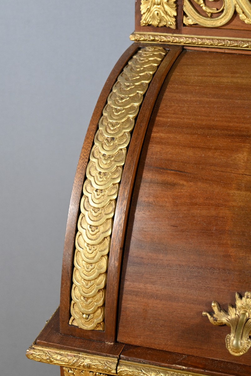 Il s’ouvre par un cylindre, un tiroir en ceinture et trois petits tiroirs en partie supérieure, offrant un espace de rangement pratique pour les documents et les objets personnels.