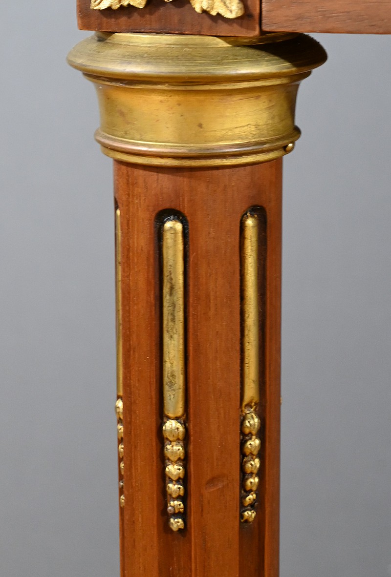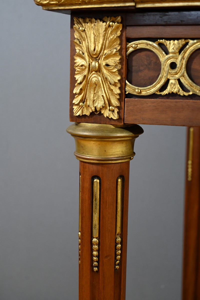 Le piètement fuselé à cannelures rudentées, terminé par des sabots de bronze, témoigne de l’artisanat exceptionnel de l’époque Louis XVI.