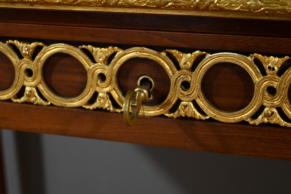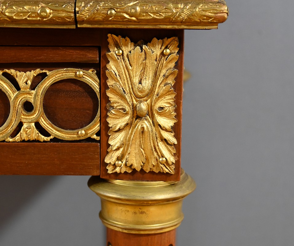 Le dessus en marbre blanc veiné de gris, ceinturé d’une galerie de laiton ajouré, ajoute une touche de sophistication et de raffinement à l’ensemble.