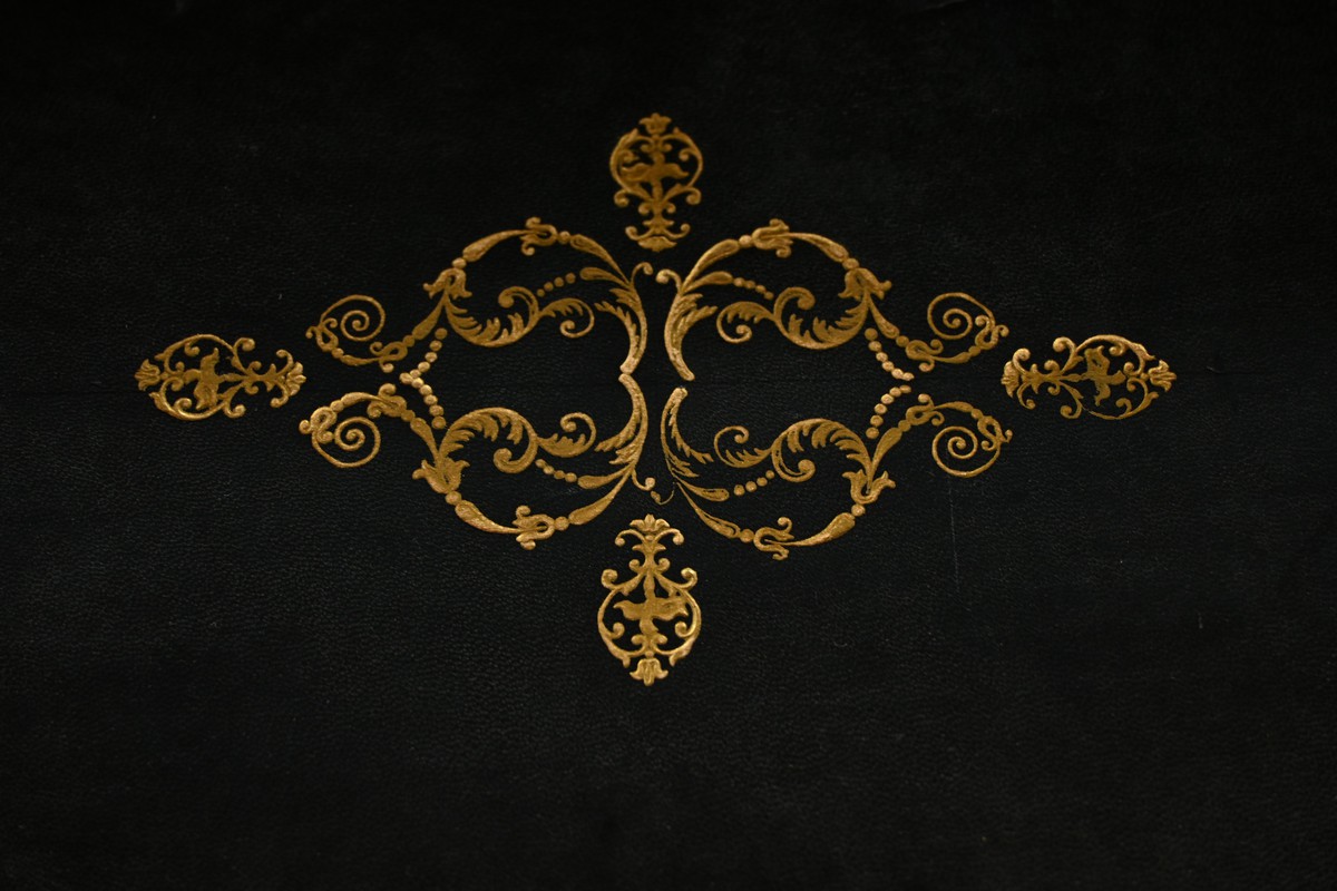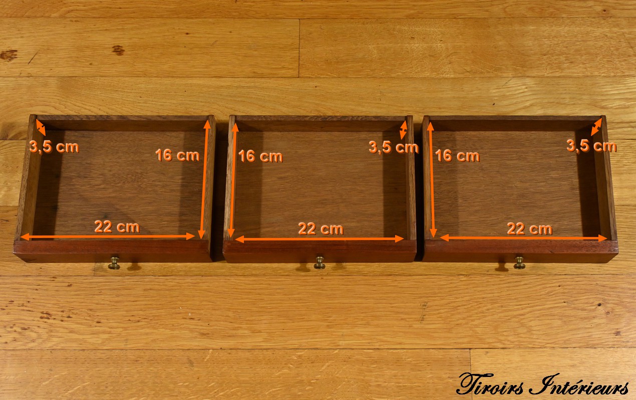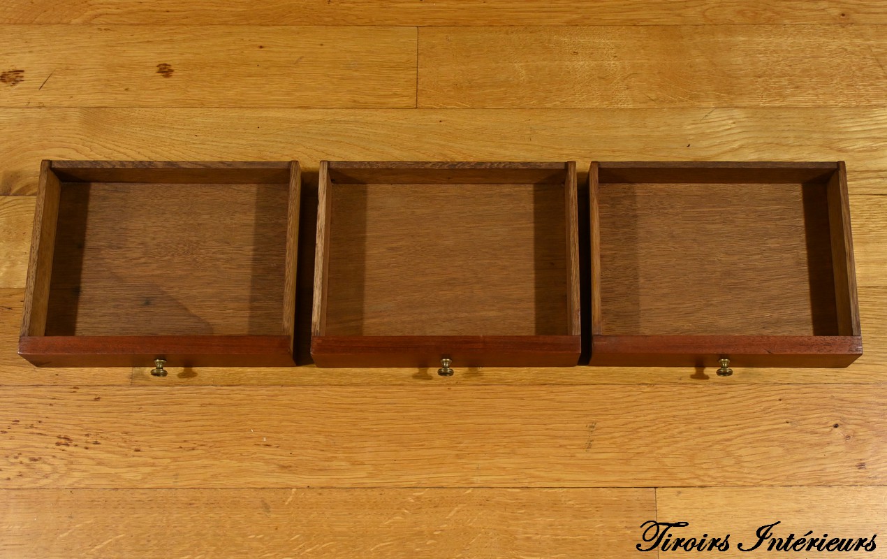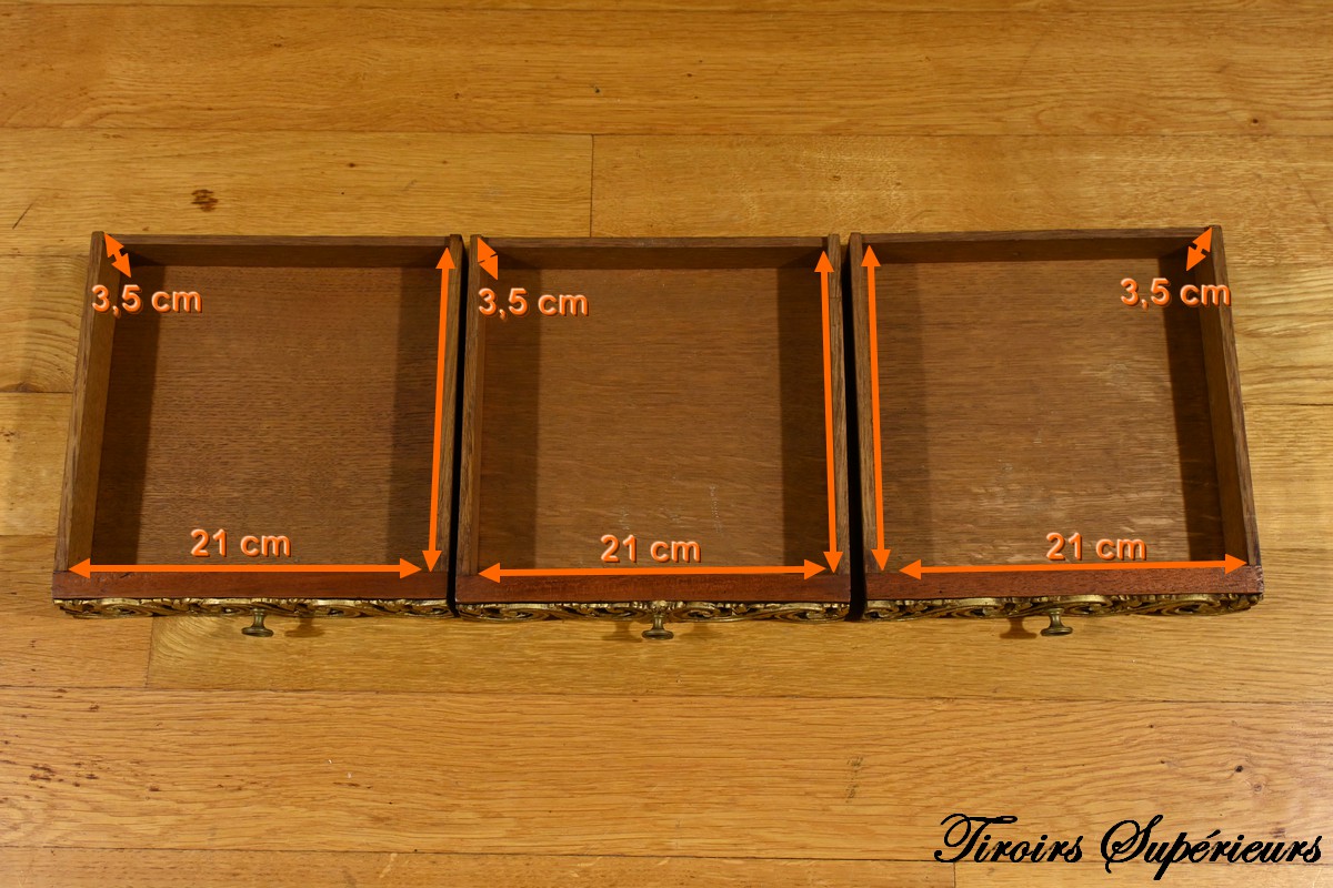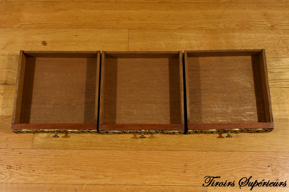 La tablette coulissante, avec son dessus de cuir noir remplacé, est surmontée de trois petits tiroirs et d’un casier, parfaits pour organiser les petits objets du quotidien.