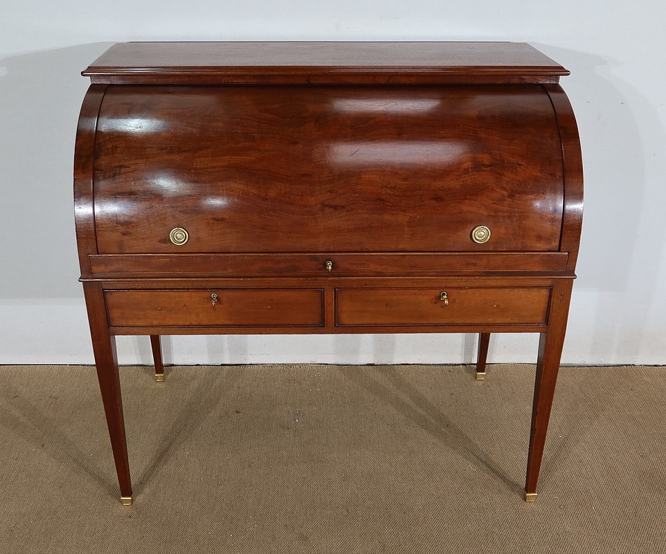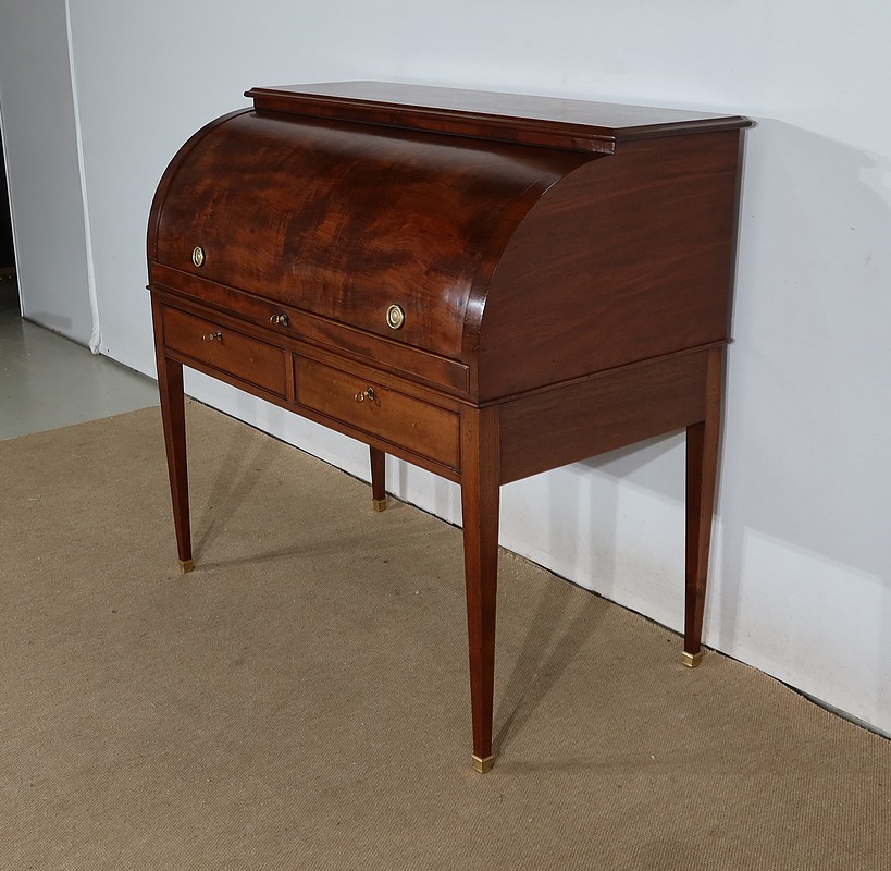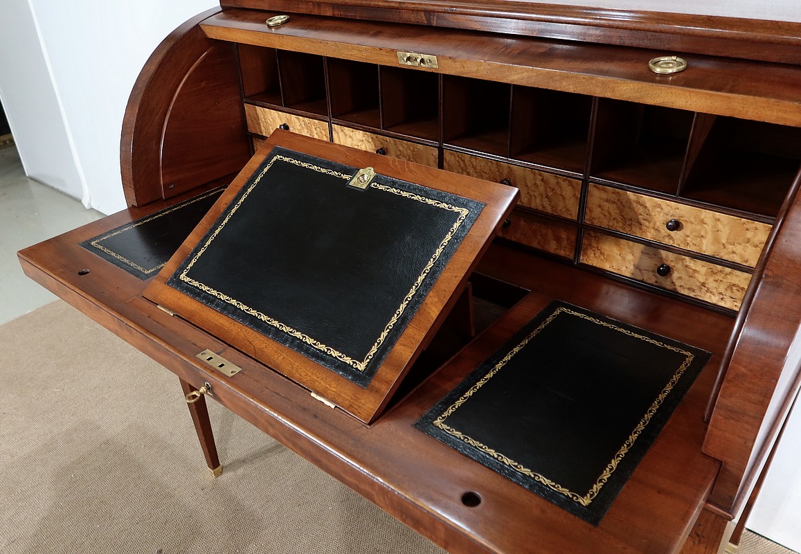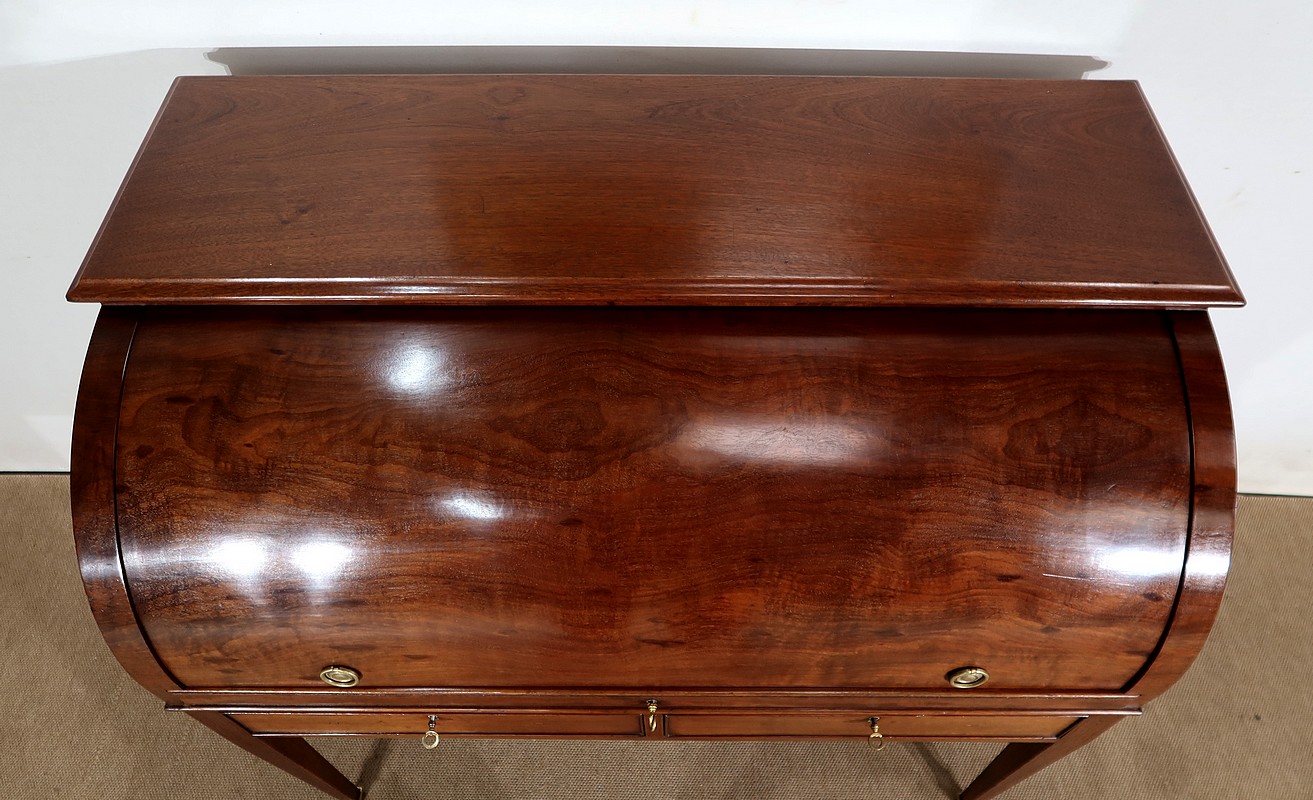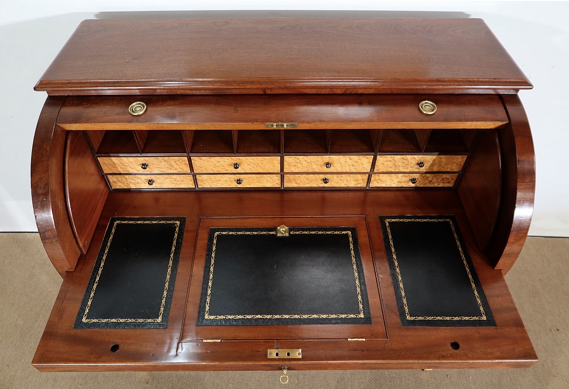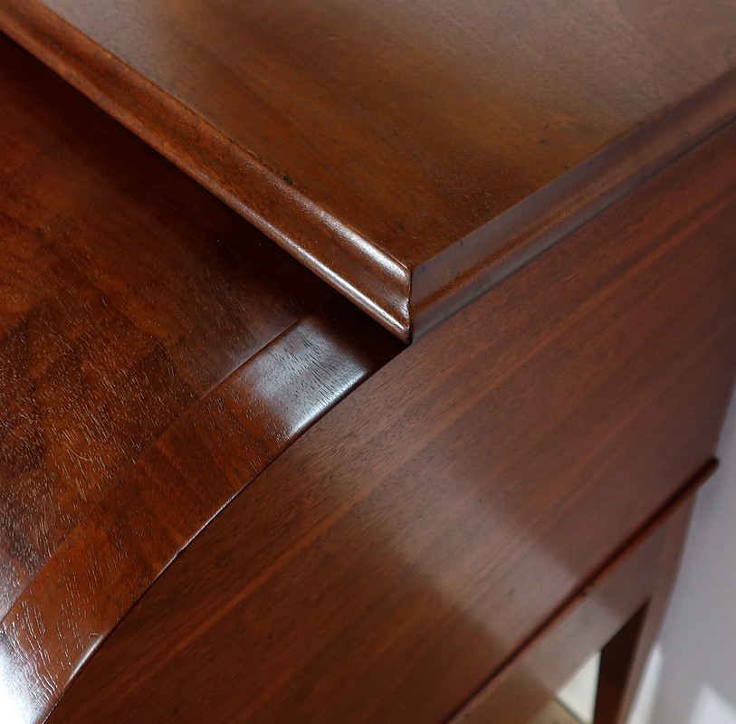 Bureau Cylindre Directoire en acajou massif et placage d’acajou comportant en ceinture deux tiroirs identiques se fermant par une serrure d’origine en état de fonctionnement, avec clé ajustée et entrée filet.