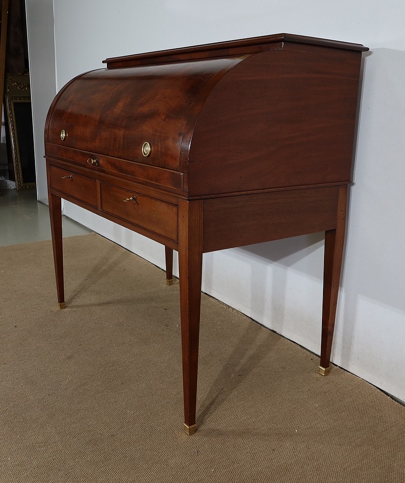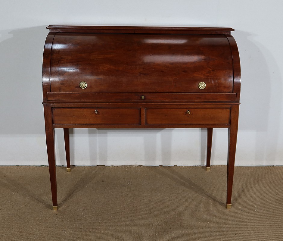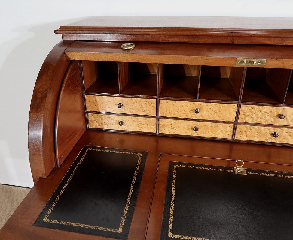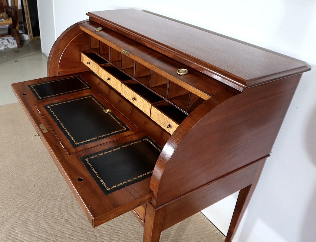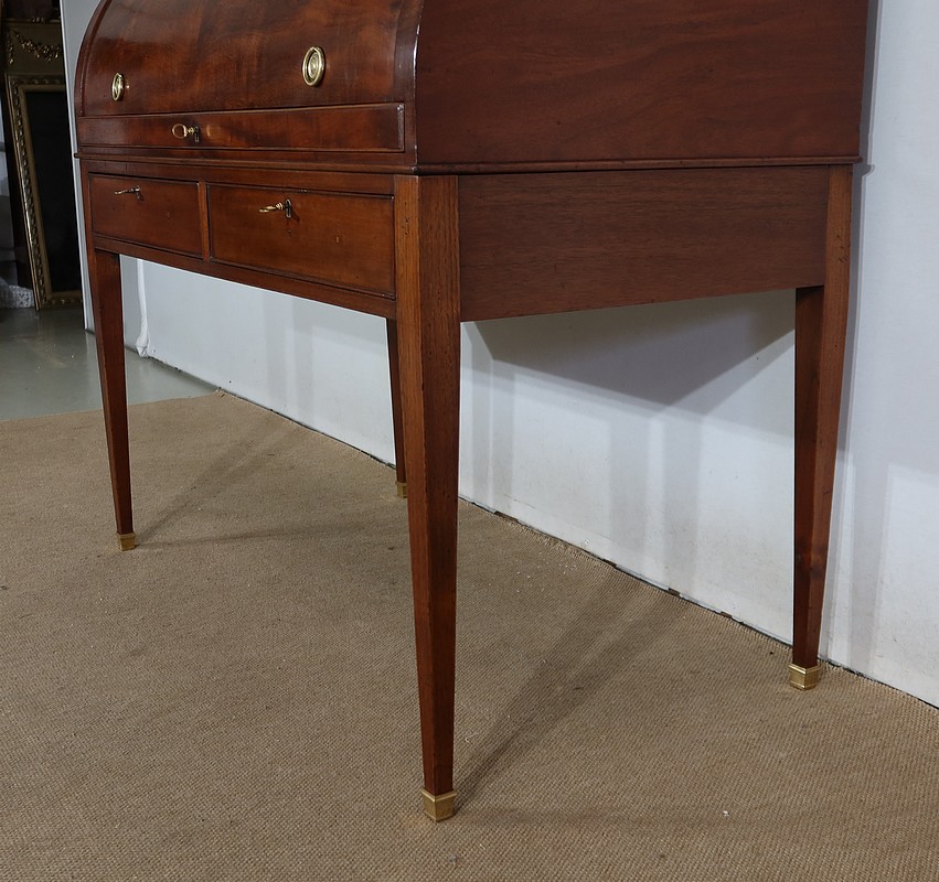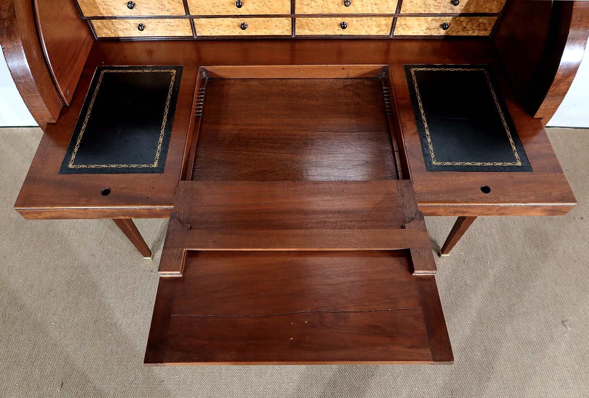 Bureau Cylindre Directoire en acajou massif et placage d’acajou comportant en ceinture deux tiroirs identiques se fermant par une serrure d’origine en état de fonctionnement, avec clé ajustée et entrée filet.