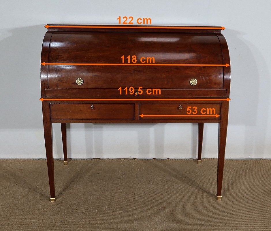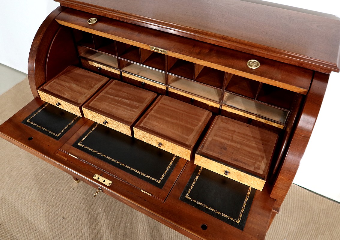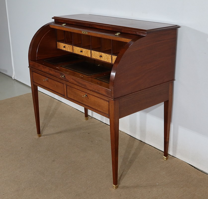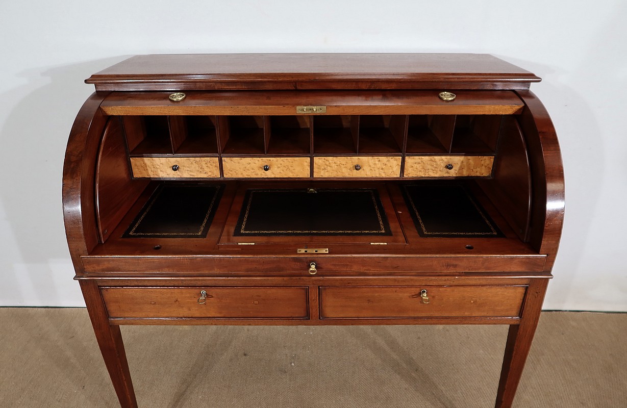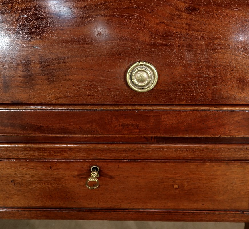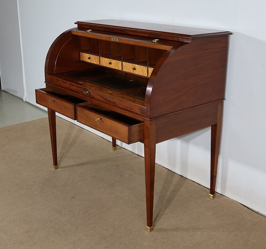 Bureau Cylindre Directoire en acajou massif et placage d’acajou comportant en ceinture deux tiroirs identiques se fermant par une serrure d’origine en état de fonctionnement, avec clé ajustée et entrée filet.