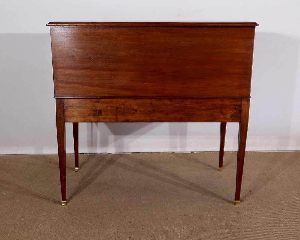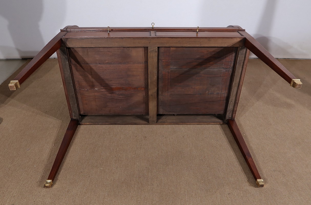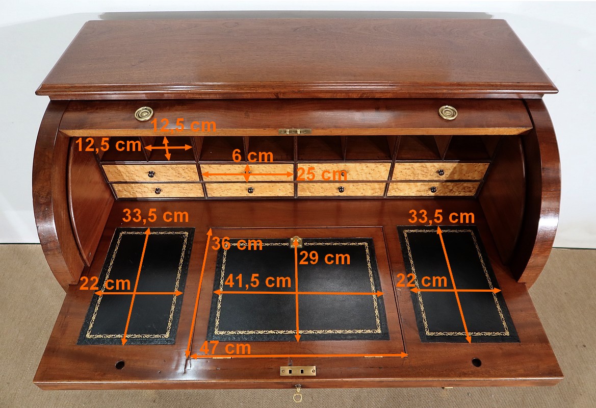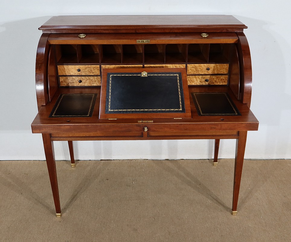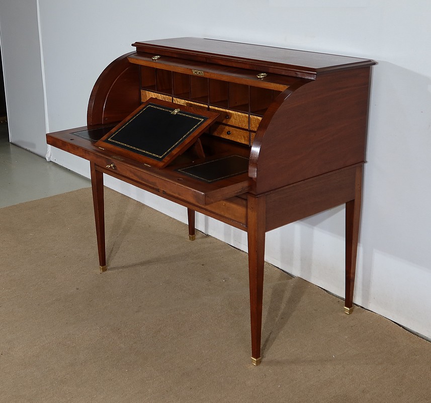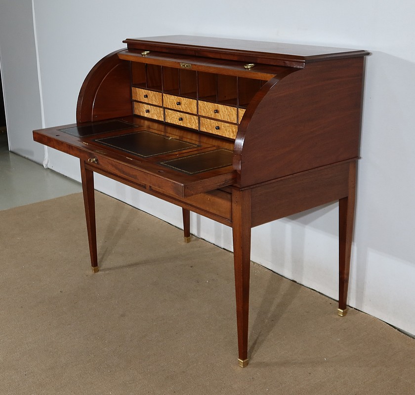 Bureau Cylindre Directoire en acajou massif et placage d’acajou comportant en ceinture deux tiroirs identiques se fermant par une serrure d’origine en état de fonctionnement, avec clé ajustée et entrée filet.