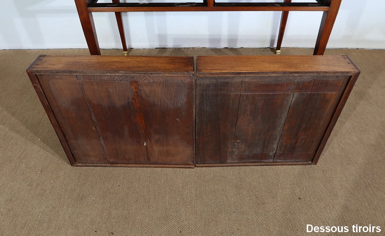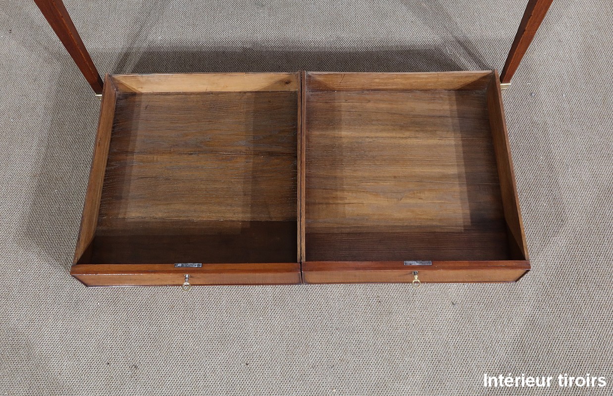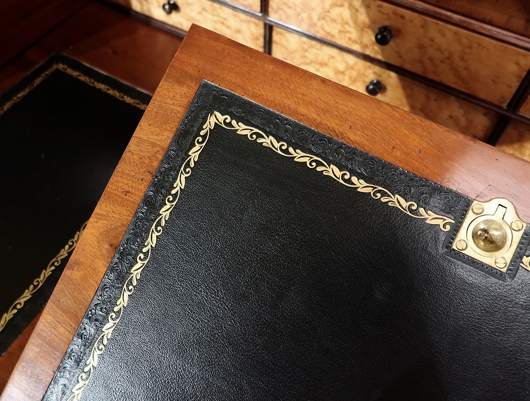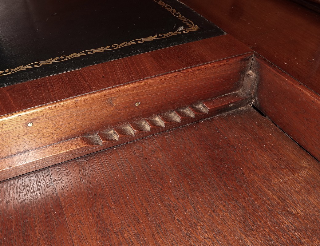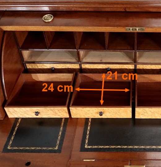 Au fond, se situent quatre tiroirs identiques munis d’une façade en loupe d’érable agrémentée d’un bouton en acajou. En dessous, quatre faux tiroirs avec une façade identique apparaissent à l’ouverture de la tablette d’écriture. Nous retrouvons également huit niches en acajou.