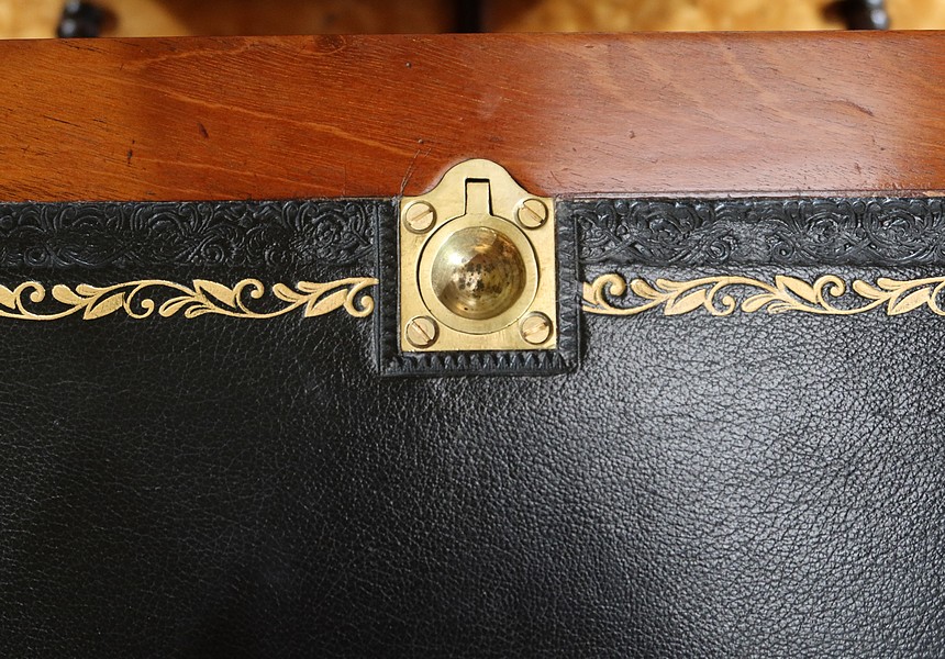 Cette tablette est garnie de trois cuirs noirs avec vignette à froid et vignette dorée. Au centre, un abattant se lève grâce à un petit anneau à doigt et se règle à l’arrière.