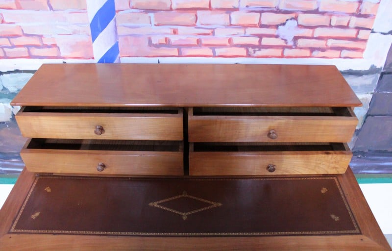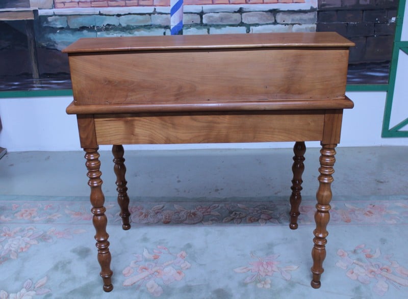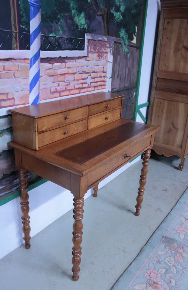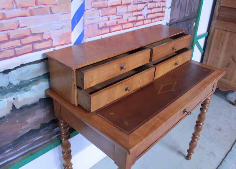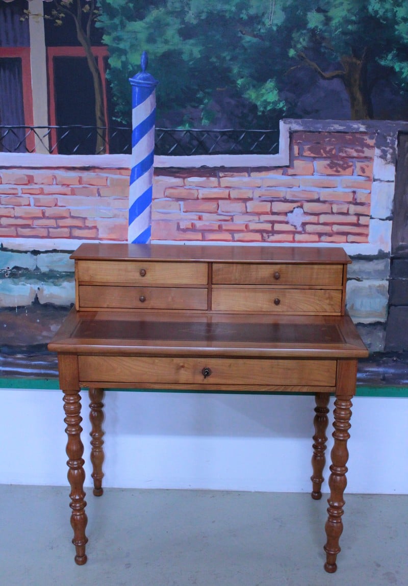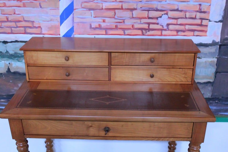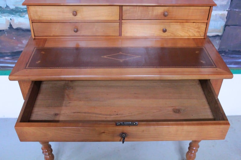 Petit bureau de dame à gradin Louis-Philippe en merisier massif, ouvrant par un grand tiroir fermant à clé en ceinture et 4 petits tiroirs dans le gradin.