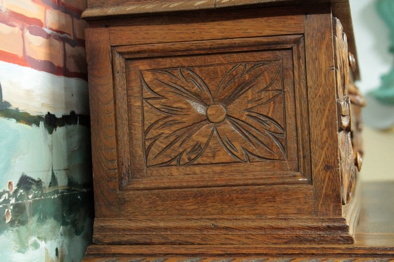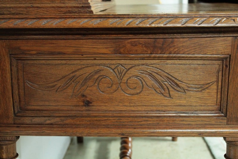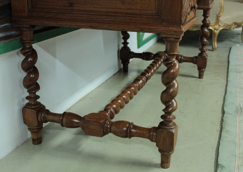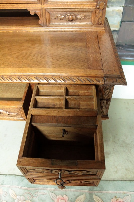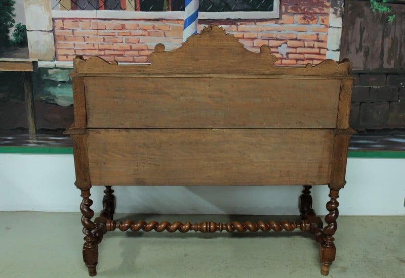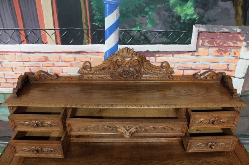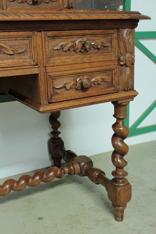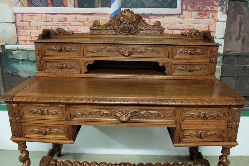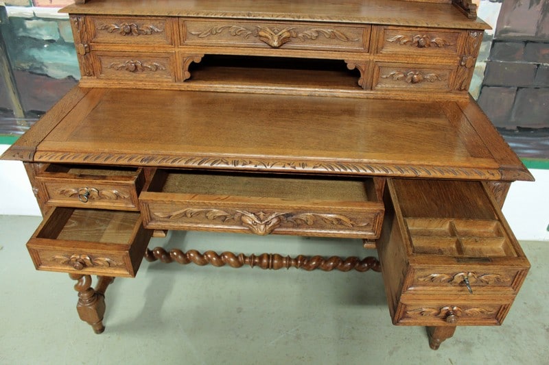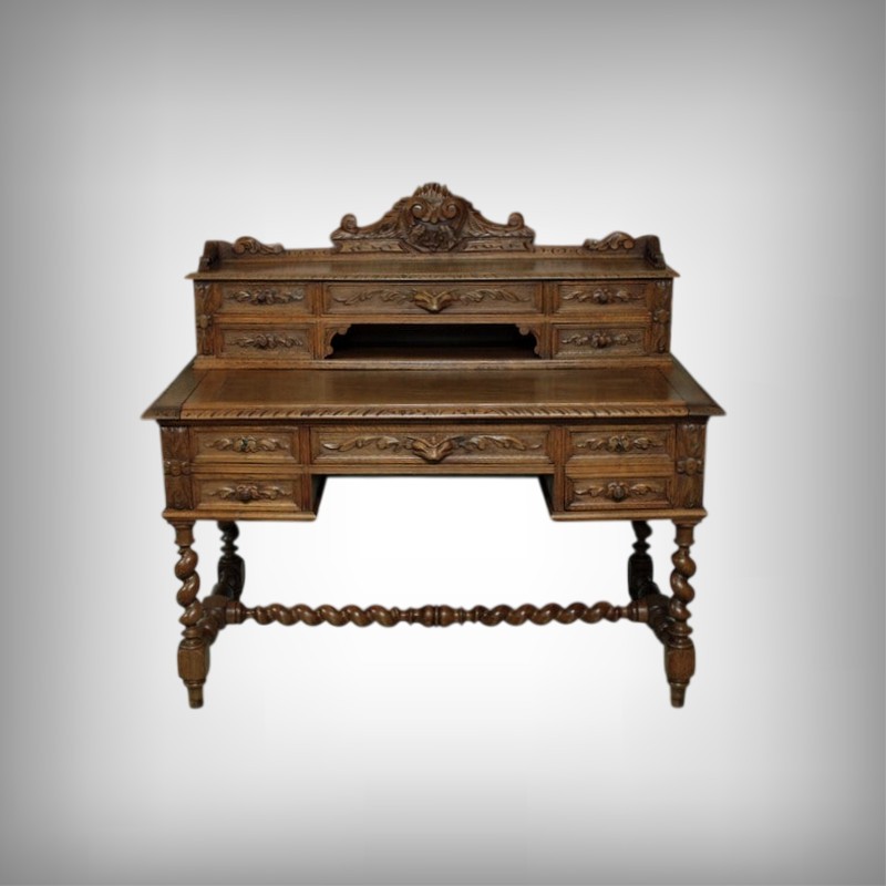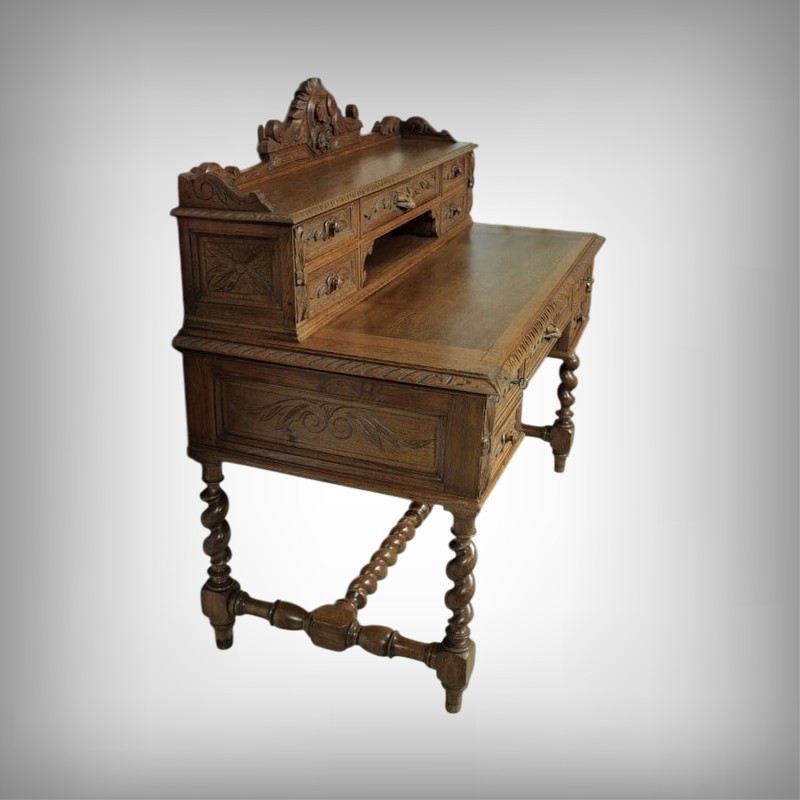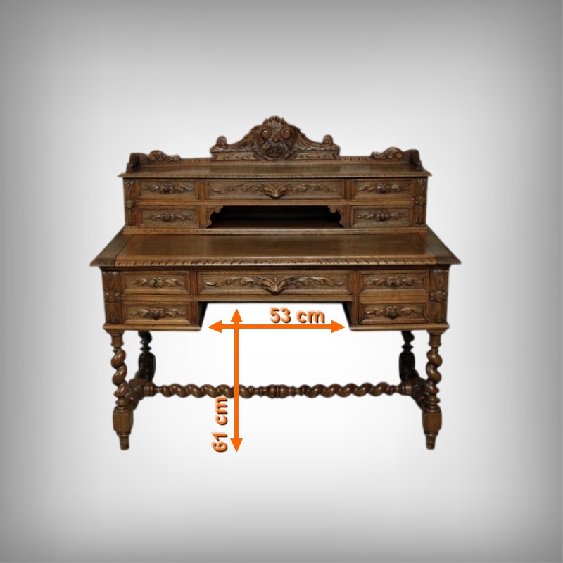 Bureau à gradin de style Louis XIII en chêne clair ouvrant dans le bandeau par 1 tiroir central, 2 tiroirs à gauche et 1 tiroir double à droite et dans le gradin par 5 tiroirs et 1 niche. Il repose sur 4 pieds torsadés réunis par une entretoise. Son plateau coulissant permet d’avoir un plan de travail de 59cm de profondeur. Finition cirée. Époque : début XXe.