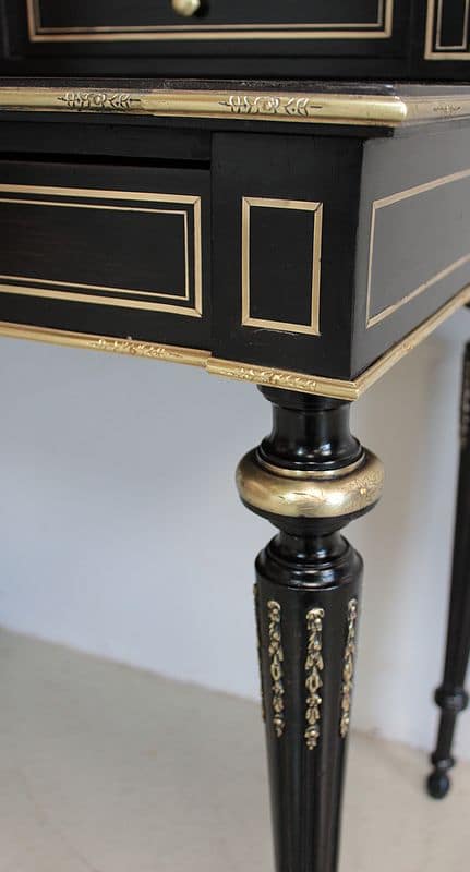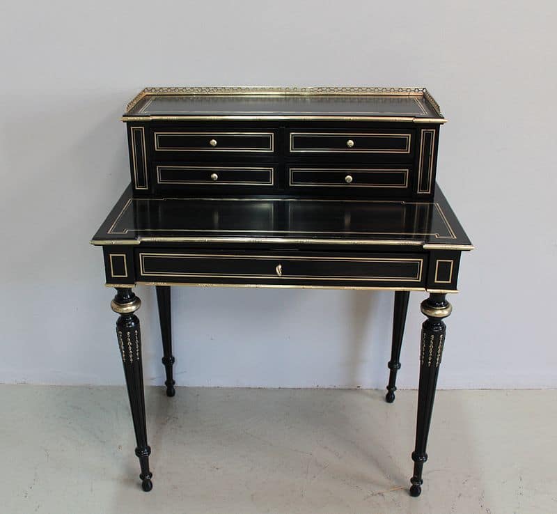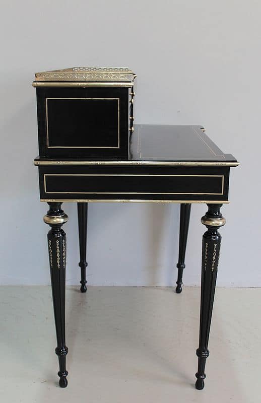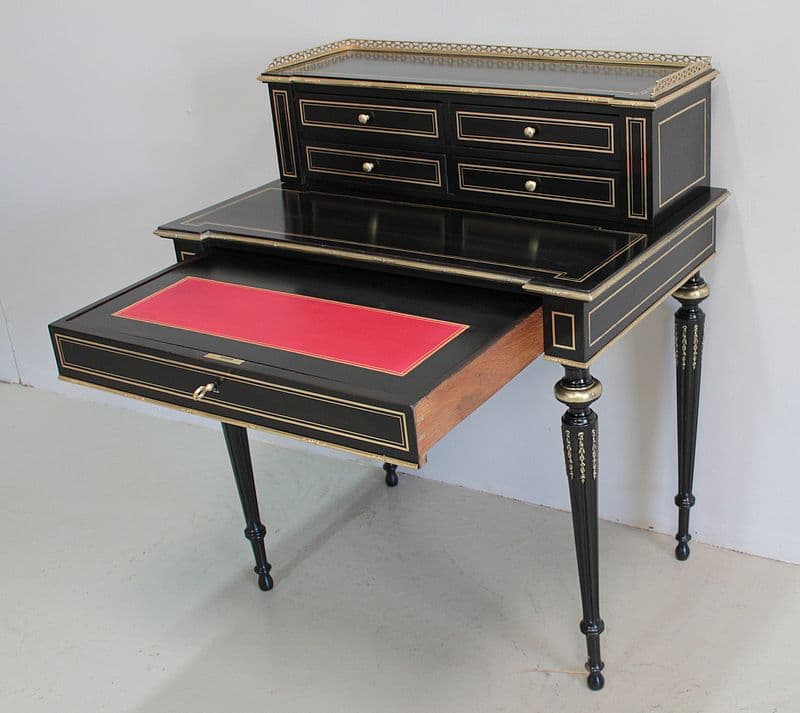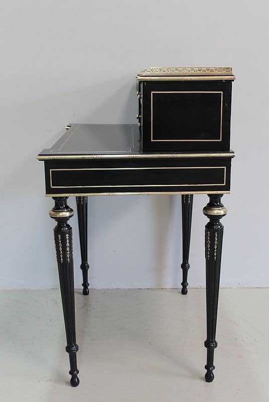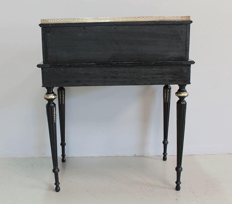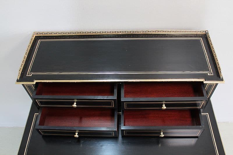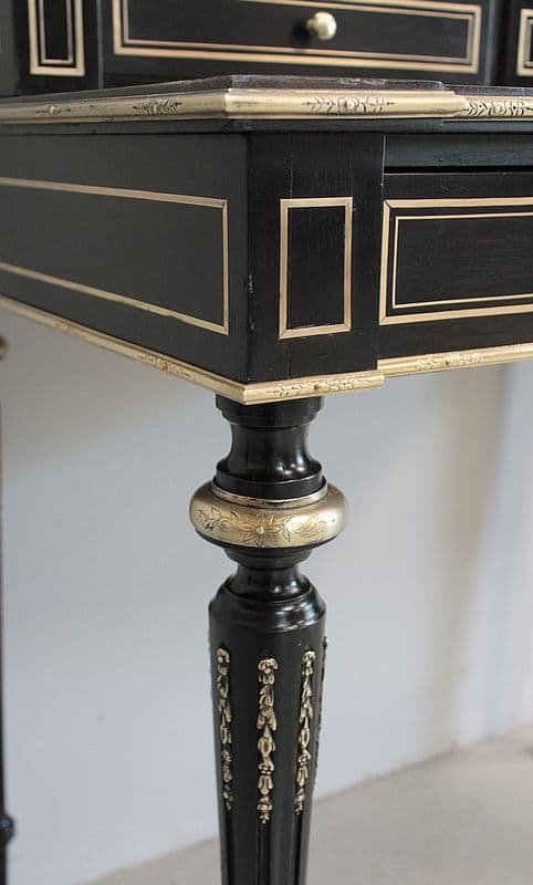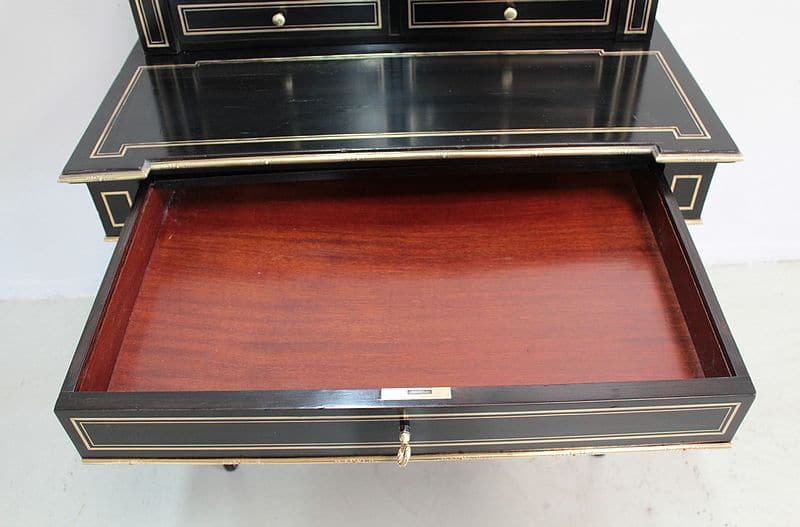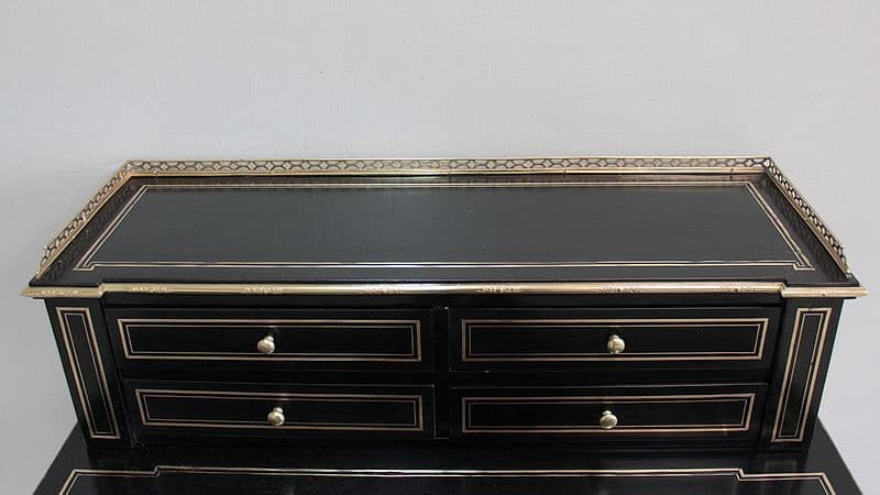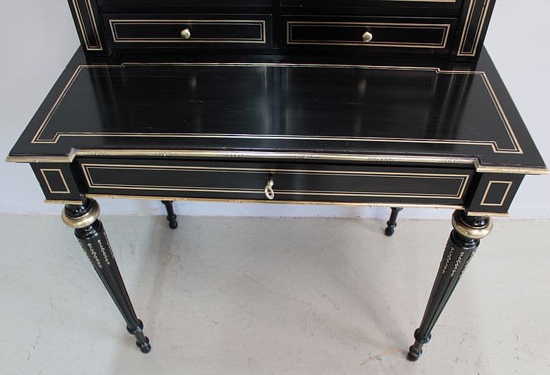 Bureau à gradin de style Louis XVI, époque NAPOLÉON III, en bois noirci avec incrustations de filets de laiton et moulures en bronze ciselé.