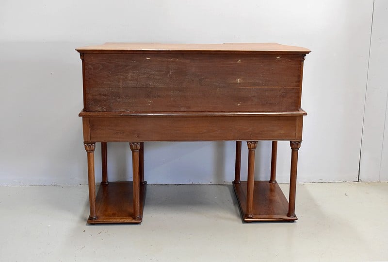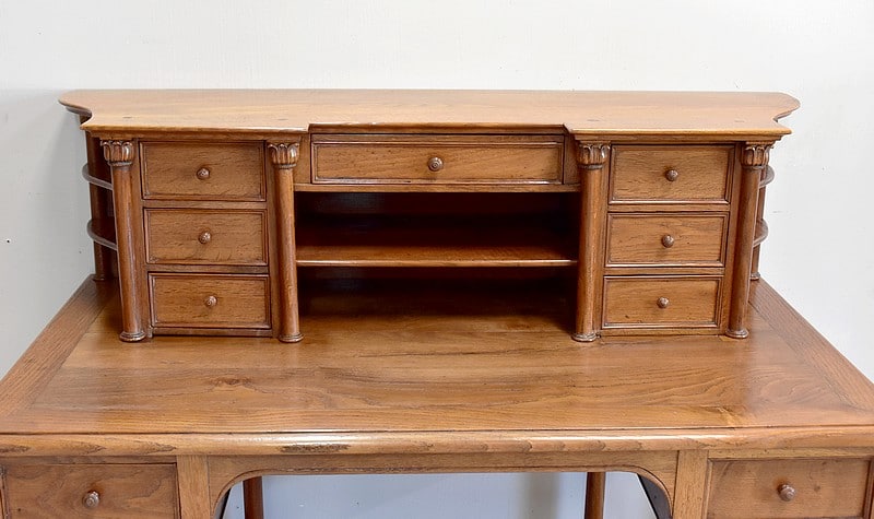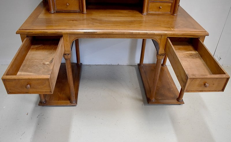 En partie haute, la rehausse ouvre à 7 tiroirs à boutons montés en queue d’aronde encadrés de 4 colonnes détachées à chapiteau palmiforme et flanqués de chaque côté de 2 étagères découpées dans une forme courbe. Le milieu dispose de 2 niches superposées l’une sur l’autre.