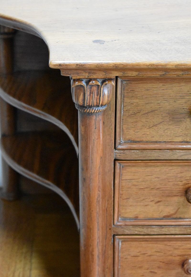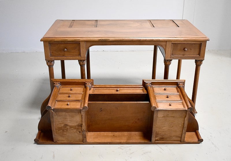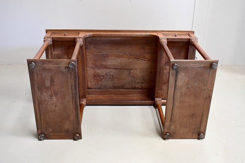 La partie basse dispose de 2 profonds tiroirs à bouton répartis de chaque côté, le tout reposant sur 8 colonnes sculptées posées sur tablettes. Le tout reposant sur 8 pieds discrets ronds et plats.