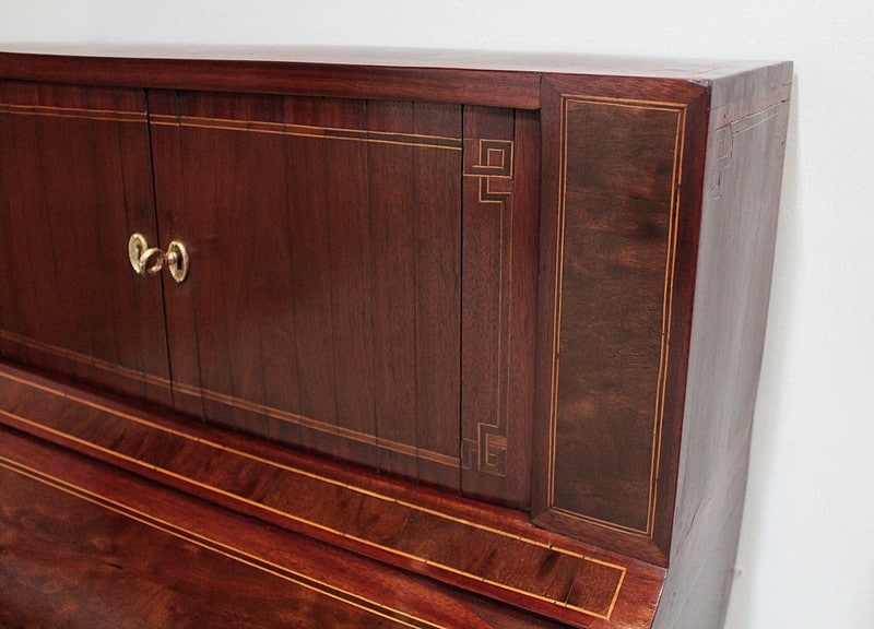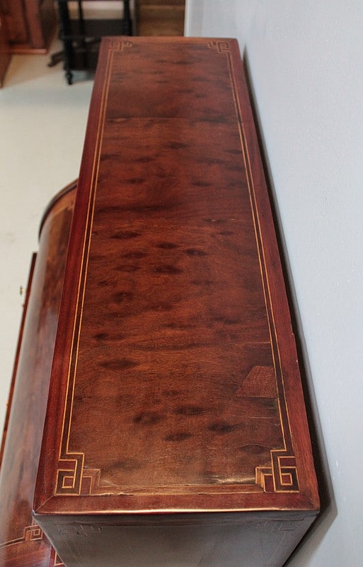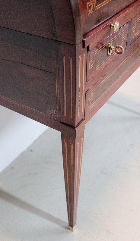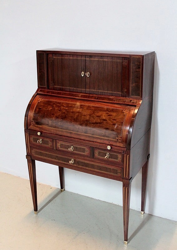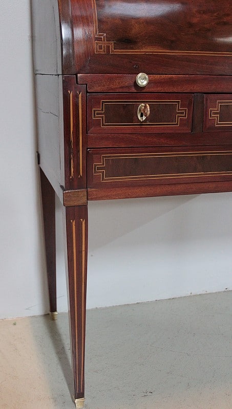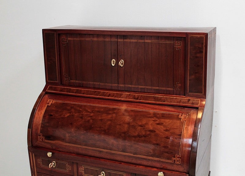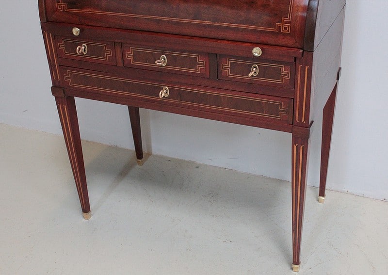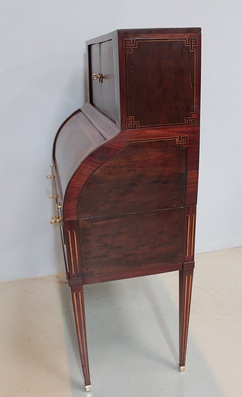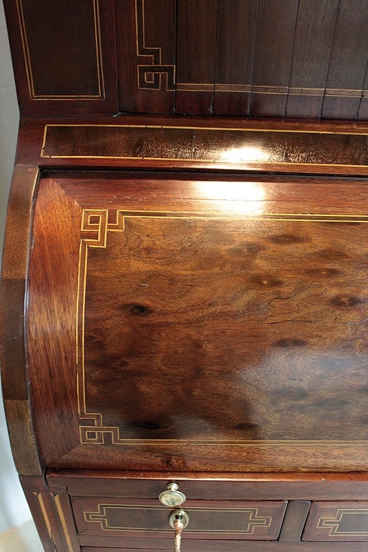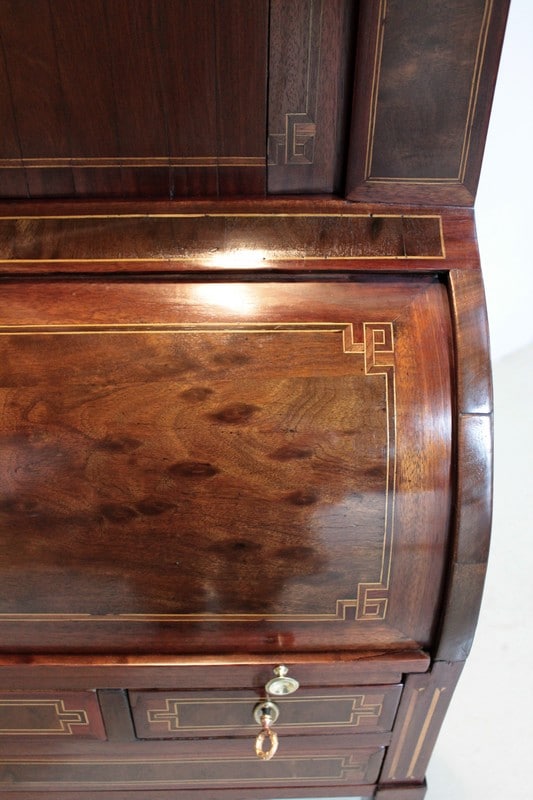 Bureau cylindre en acajou et acajou moucheté avec filets de buis.