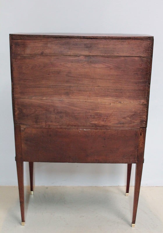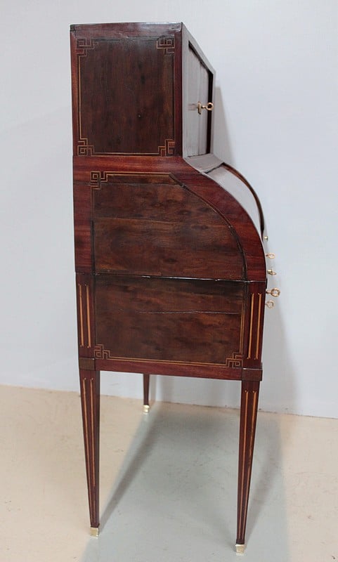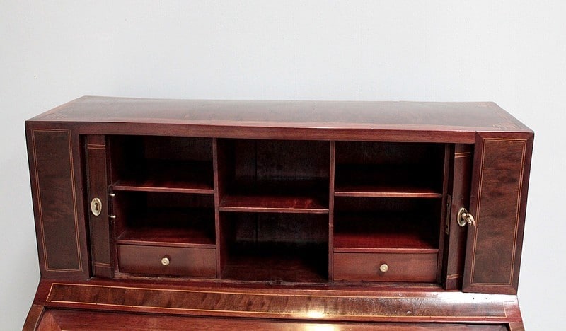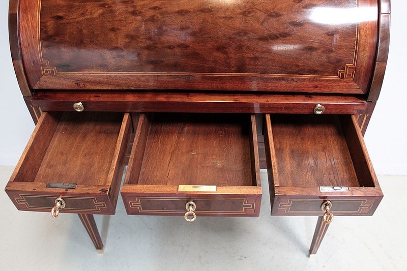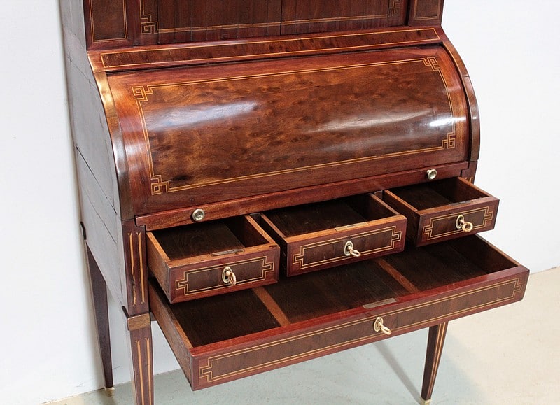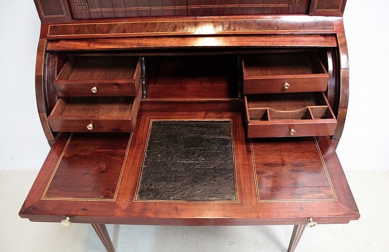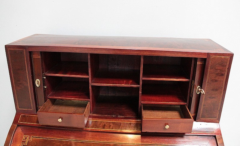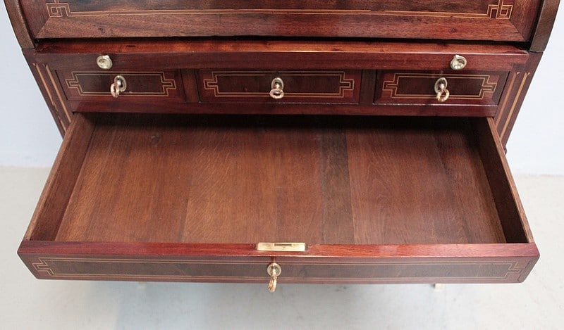 Il présente un gradin fermant par 2 rideaux et découvrant des petits casiers et 2 tiroirs, puis un cylindre découvrant 4 tiroirs et une tablette qui actionne son ouverture et enfin 4 tiroirs sur deux rangs en ceinture.