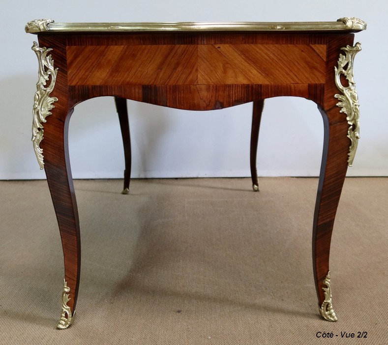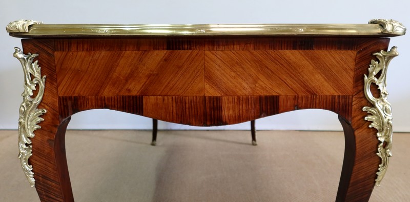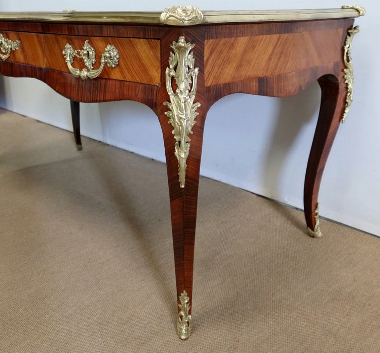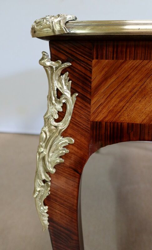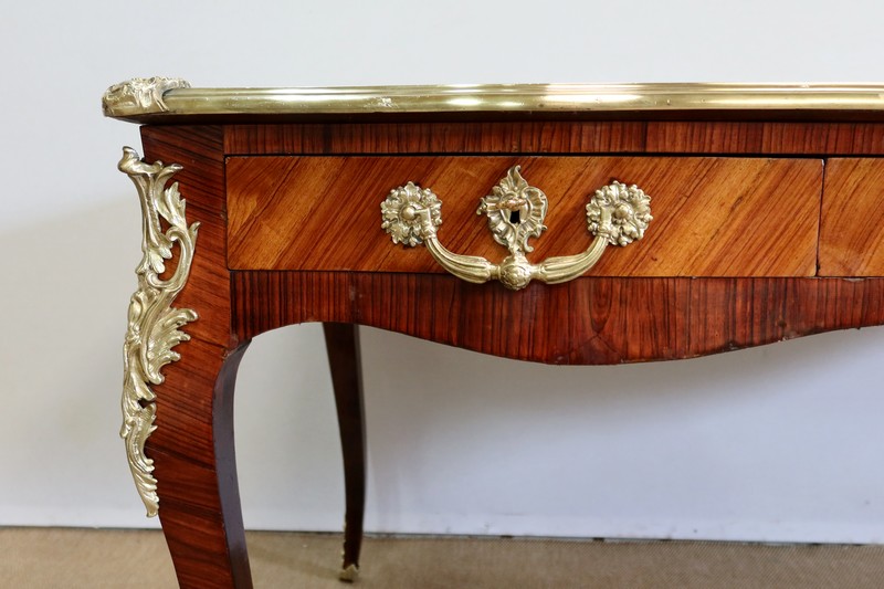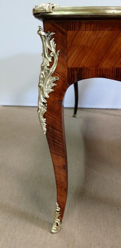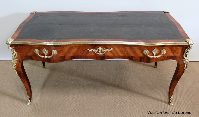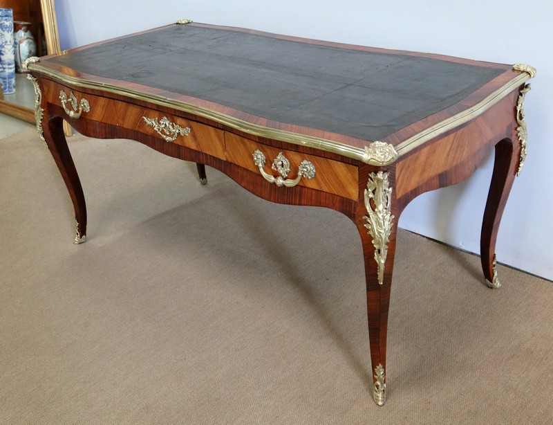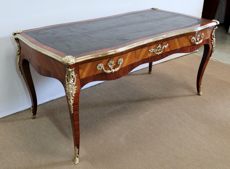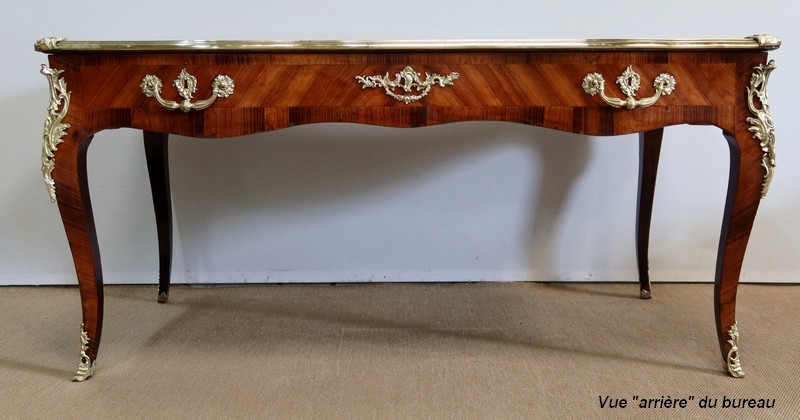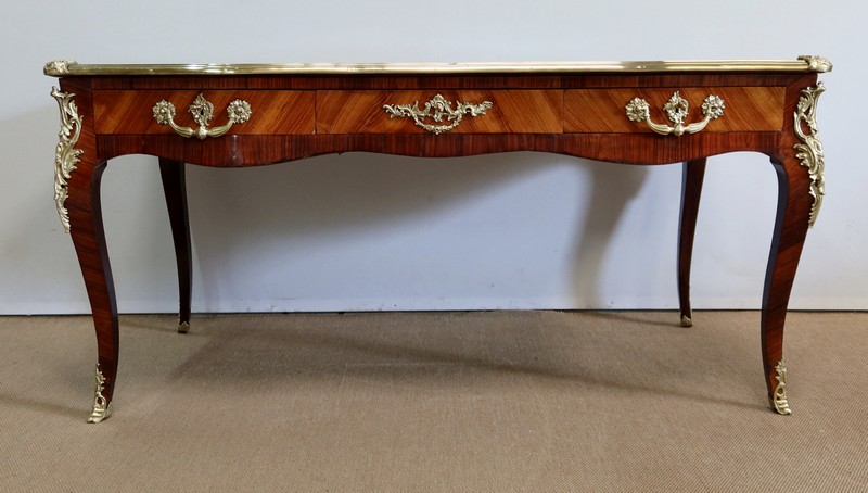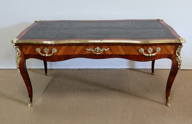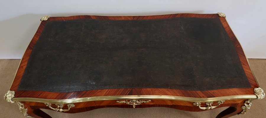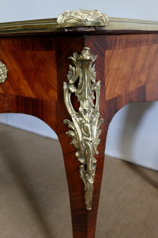 Élégant bureau de milieu à mouvement de style Louis XV, composé d’une harmonieuse structure en bois de rose et bois de violette. Son plateau à encadrement à mouvement présente une bordure en Bois de Violette, sublimé d’une moulure en bronze à profil et d’écoinçons à coquille et volutes dans chaque angle. Son dessus en cuir d’origine, avec vignette à froid dans son pourtour, comporte de légères marques du temps, qui apportent à ce meuble un authentique cachet. En façade, également mouvementée, ce bureau d’apparat ouvre par trois tiroirs, dont l’intérieur, les côtés et le fond sont en chêne : celui au centre est garni d’une importante entrée en bronze avec coquille et feuillage, tandis que ceux aux extrémités sont agrémentés en sus d’une poignée en bronze. Ces tiroirs sont munis d’une serrure d’origine en état de fonctionnement, ainsi que de leur clé. La face « arrière » est également habillée des mêmes ornements de bronzes, dans un souci d’esthétisme et d’équilibre, étant donné que les tiroirs sont factices. Ce bureau repose sur quatre pieds galbés, décorés en partie haute d’une importante chute en bronze, et en partie basse d’un sabot du même alliage. Vous serez charmés par l’agréable contraste des placages de Bois de Rose et de Bois de Violette, rehaussé par le faste et l’éclat des garnitures en bronze, qui font de ce Bureau d’Apparat un magnifique mobilier.