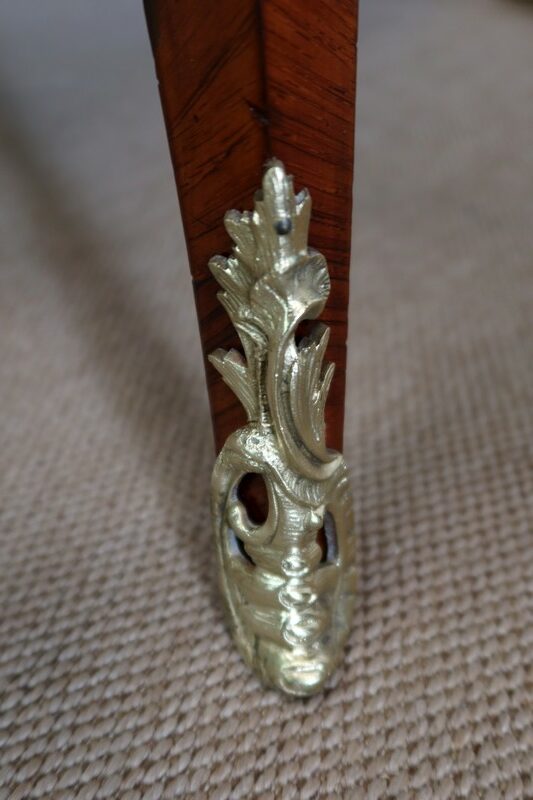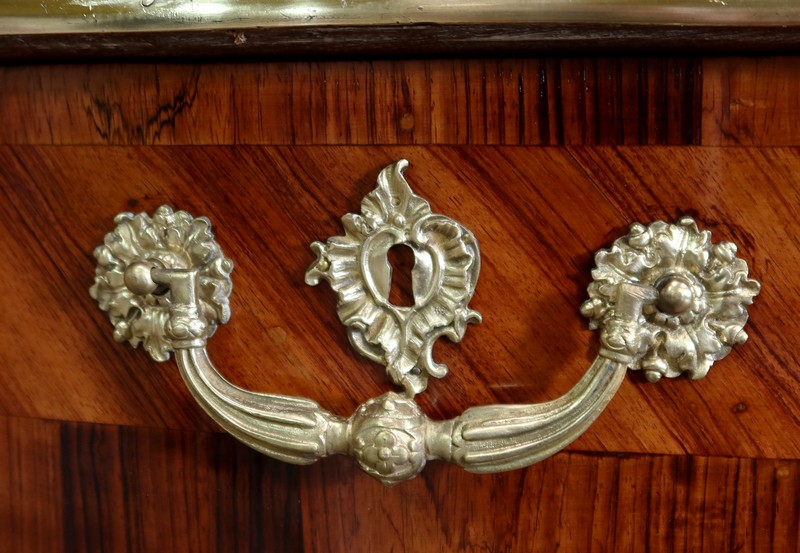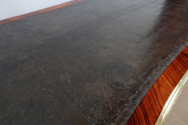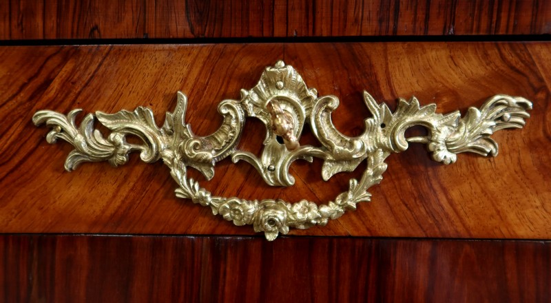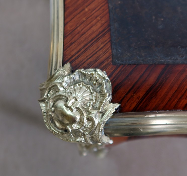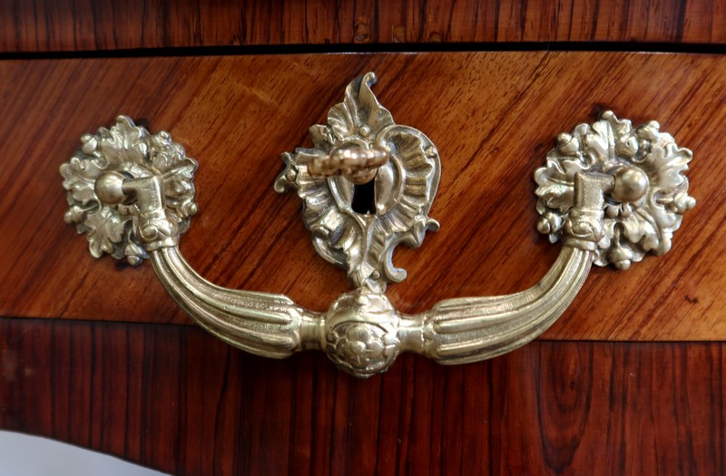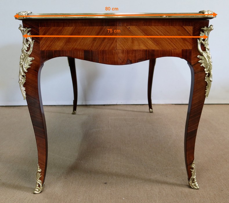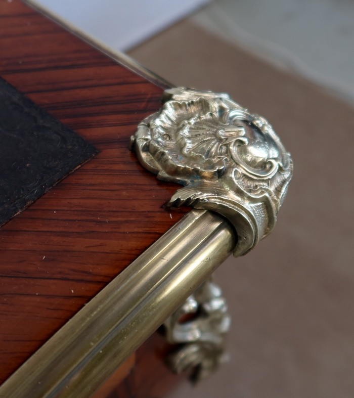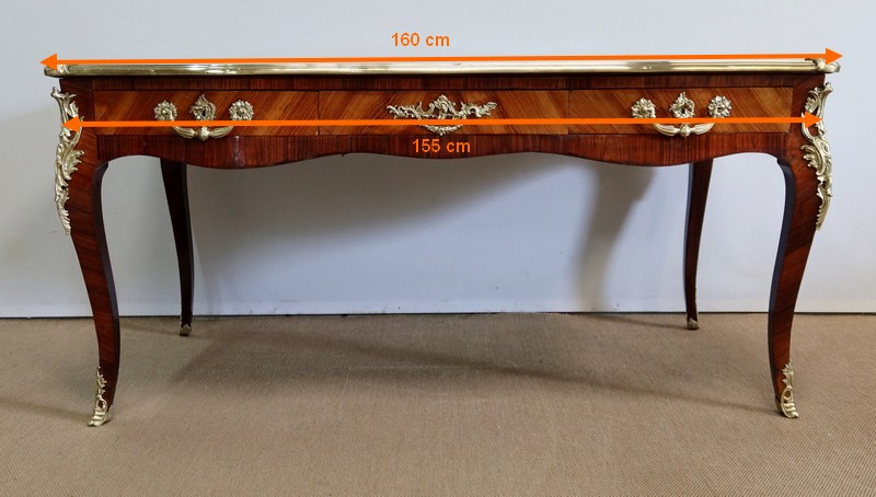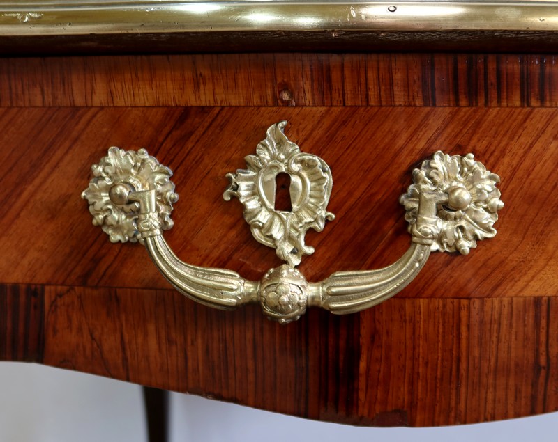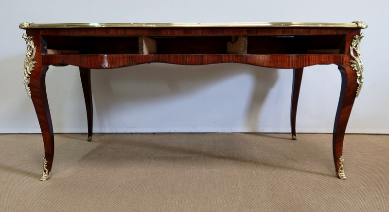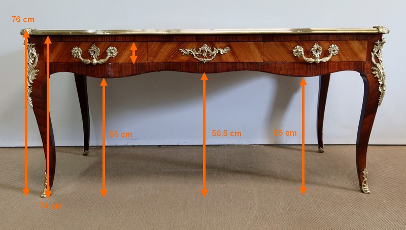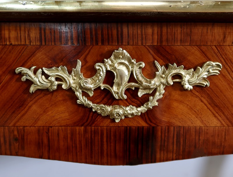 Élégant bureau de milieu à mouvement de style Louis XV, composé d’une harmonieuse structure en bois de rose et bois de violette. Son plateau à encadrement à mouvement présente une bordure en Bois de Violette, sublimé d’une moulure en bronze à profil et d’écoinçons à coquille et volutes dans chaque angle. Son dessus en cuir d’origine, avec vignette à froid dans son pourtour, comporte de légères marques du temps, qui apportent à ce meuble un authentique cachet. En façade, également mouvementée, ce bureau d’apparat ouvre par trois tiroirs, dont l’intérieur, les côtés et le fond sont en chêne : celui au centre est garni d’une importante entrée en bronze avec coquille et feuillage, tandis que ceux aux extrémités sont agrémentés en sus d’une poignée en bronze. Ces tiroirs sont munis d’une serrure d’origine en état de fonctionnement, ainsi que de leur clé. La face « arrière » est également habillée des mêmes ornements de bronzes, dans un souci d’esthétisme et d’équilibre, étant donné que les tiroirs sont factices. Ce bureau repose sur quatre pieds galbés, décorés en partie haute d’une importante chute en bronze, et en partie basse d’un sabot du même alliage. Vous serez charmés par l’agréable contraste des placages de Bois de Rose et de Bois de Violette, rehaussé par le faste et l’éclat des garnitures en bronze, qui font de ce Bureau d’Apparat un magnifique mobilier.