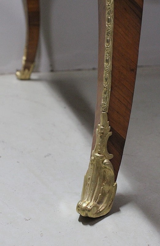 L’ensemble repose sur quatre pieds galbés enjolivés sur toute leur hauteur par des Bronzes en Bustes de femmes, qui s’effilent en perles et feuillages jusqu’au Sabots qui agrémentent les pieds.