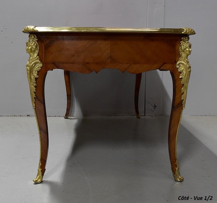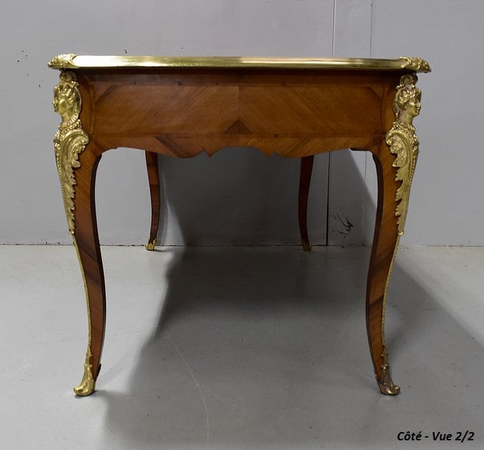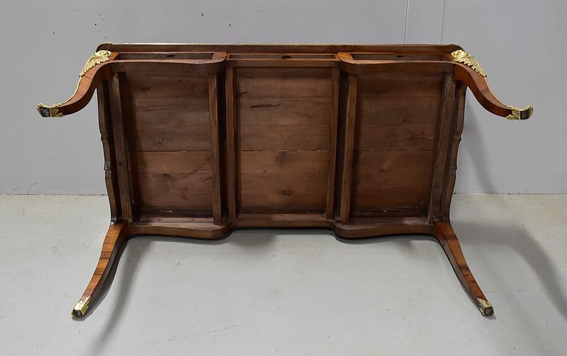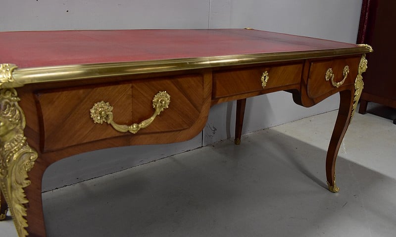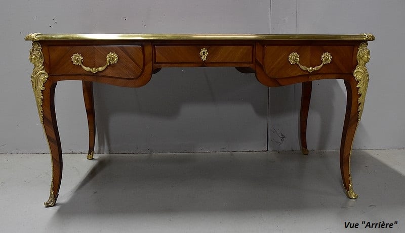 Bureau plat toutes faces de style Louis XV, avec structure en Placage de Bois de Rose formant des séries de filets harmonieusement disposées.