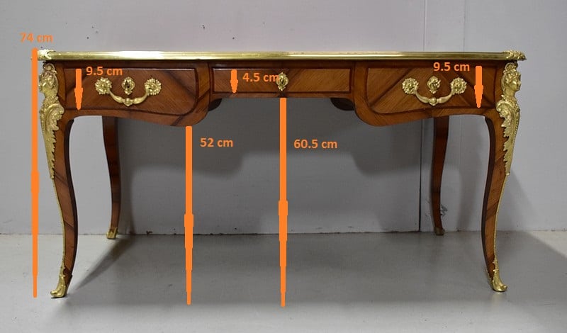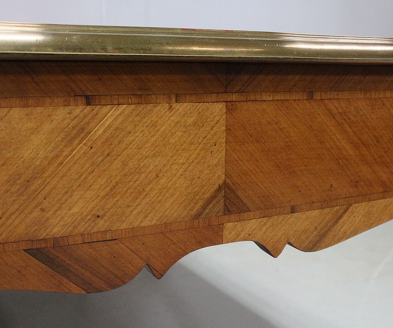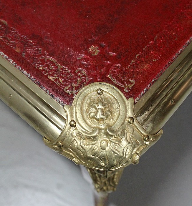 L’espace de travail aux dimensions généreuses est recouvert d’un cuir Rouge authentique. Sa grandeur explique sa composition en trois éléments, dont les jonctions sont habilement rendues presque imperceptibles par des frises sur fond dur. Ce précieux habillage est également garni de Fleurons d’angles et bordé de frises Dorés. Ce plateau est encadré d’une large baguette en laiton façonnée à Gorge et ‘Bec de Corbin’, et chacun de ses quatre coins est orné d’un Écusson ouvragé en Bronze.