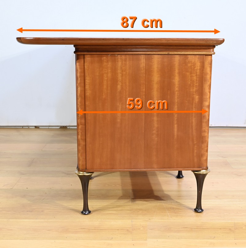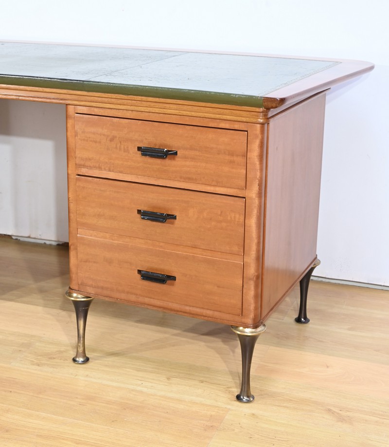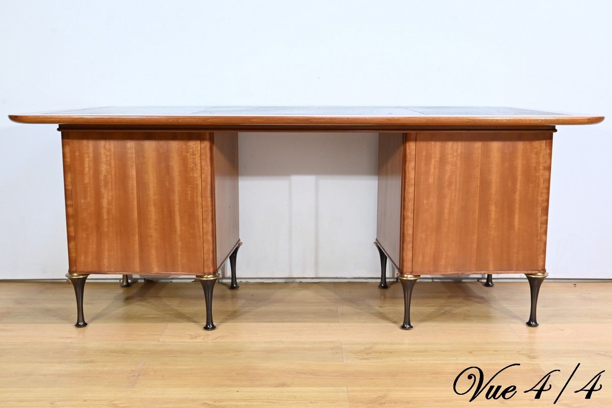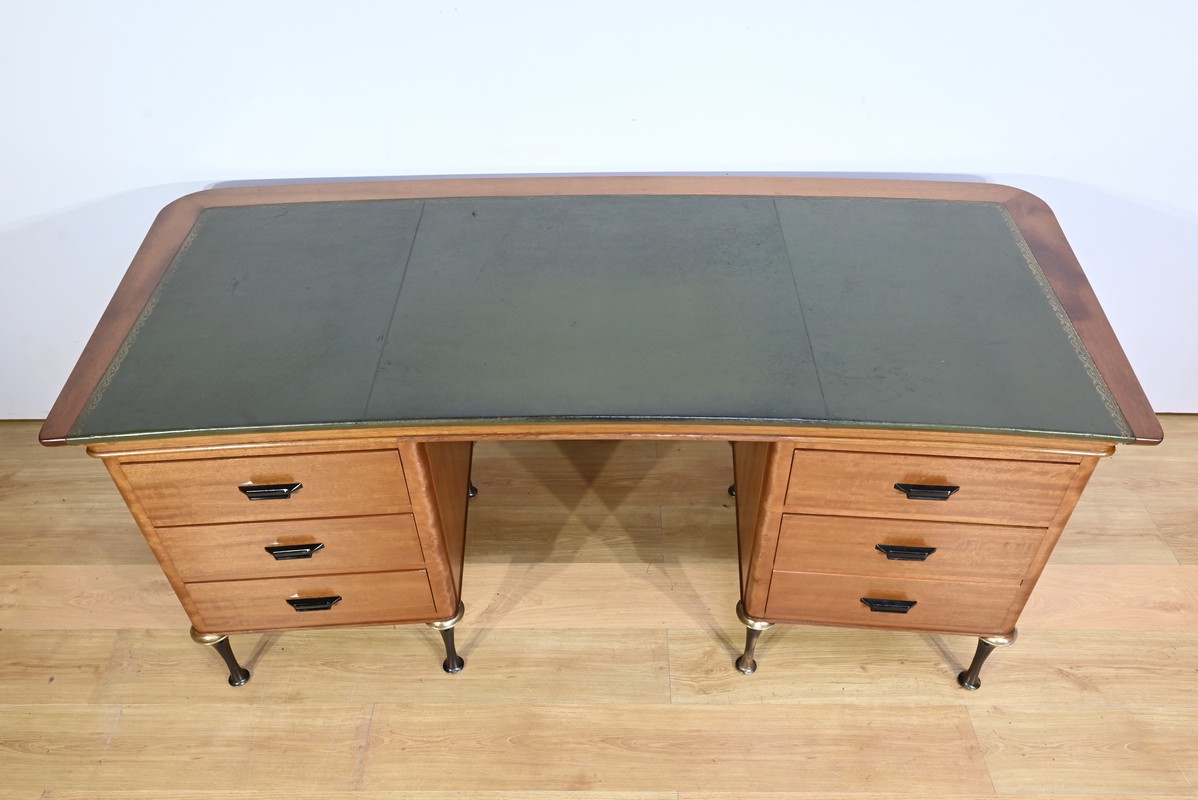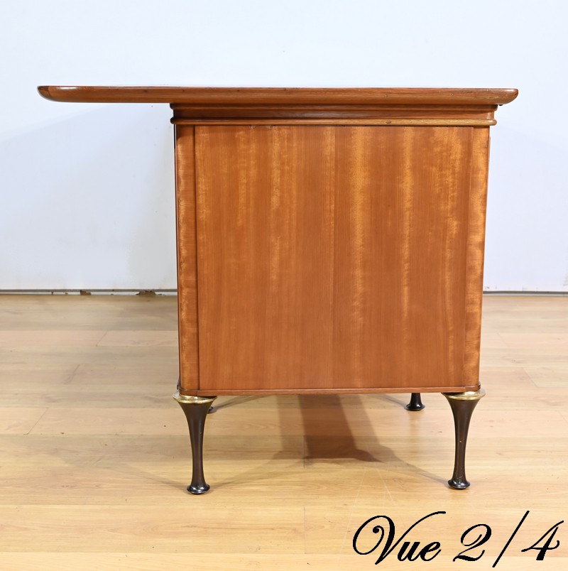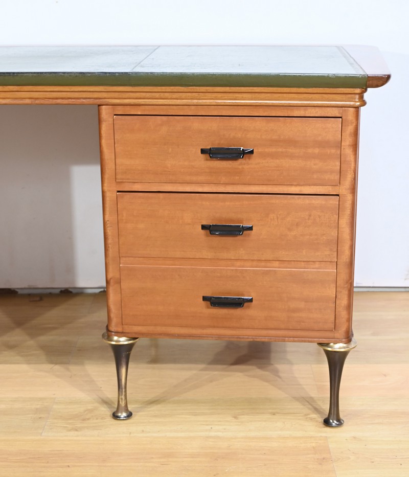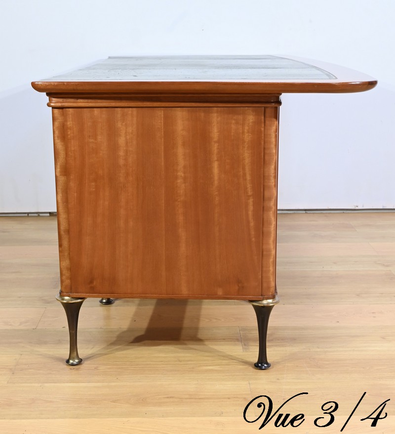 Ce bureau d’architecte en acajou massif et plaqué, légèrement concave en façade, présente un important plateau à débordement.