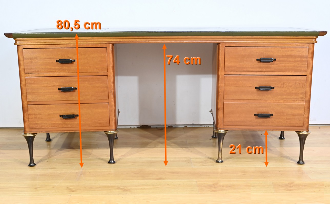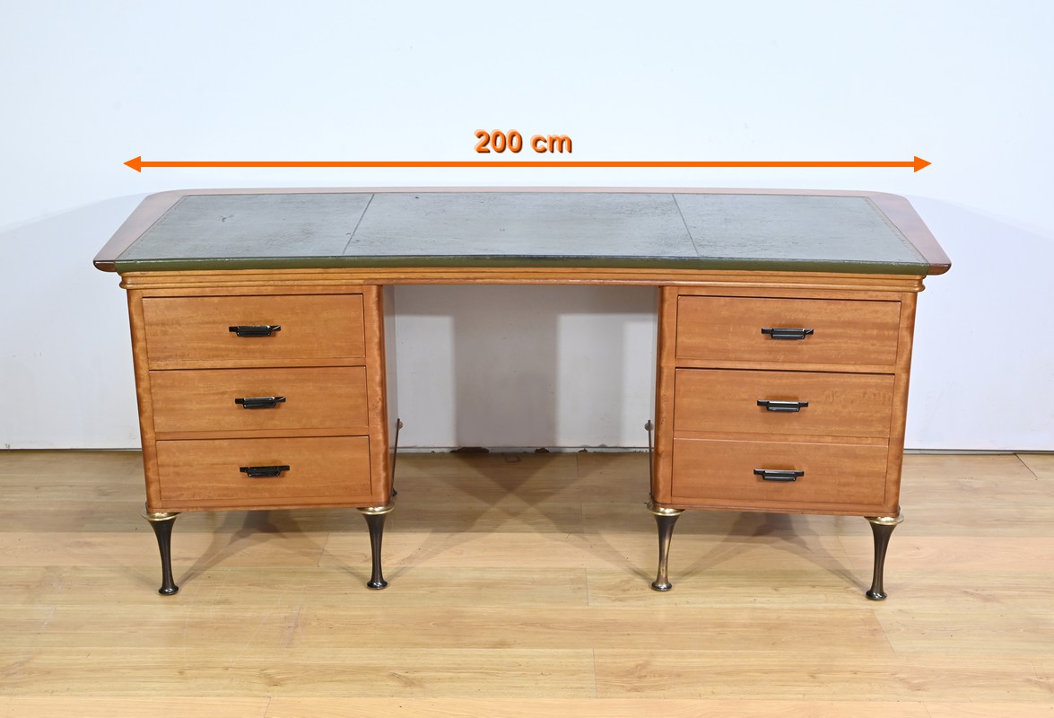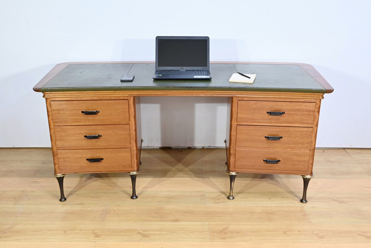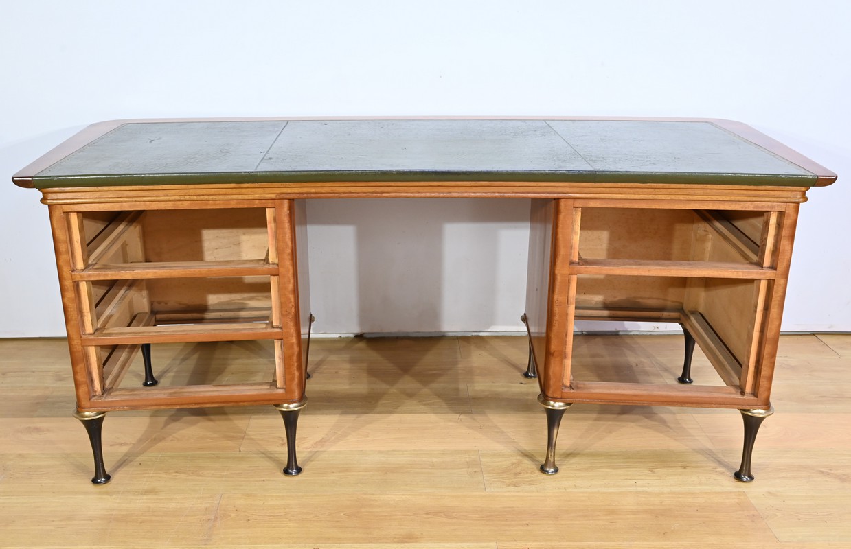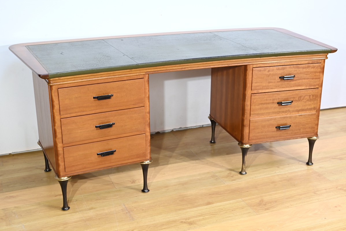 Ce bureau d’architecte en acajou massif et plaqué, légèrement concave en façade, présente un important plateau à débordement.