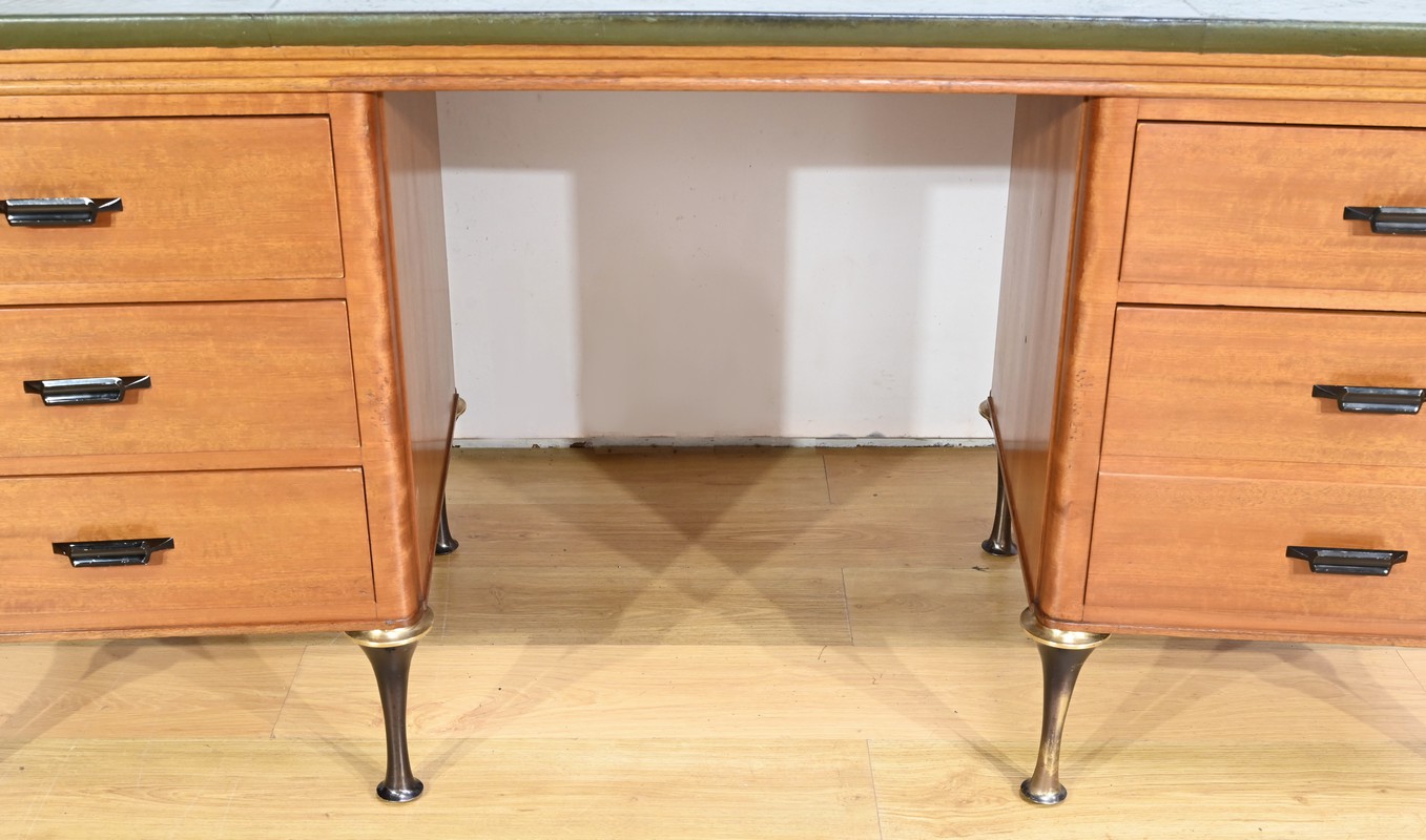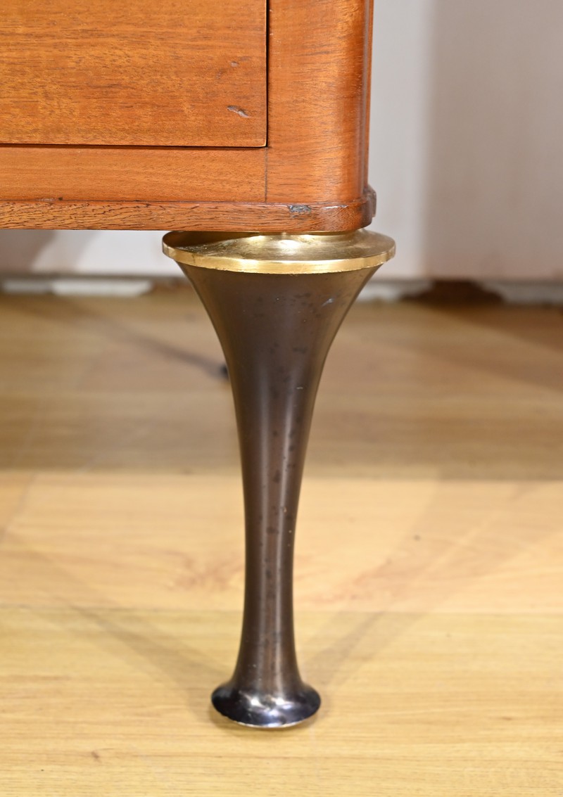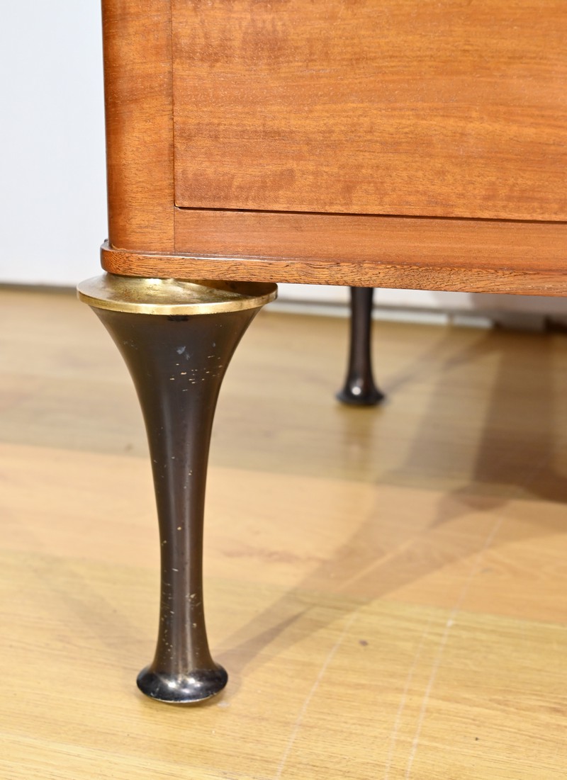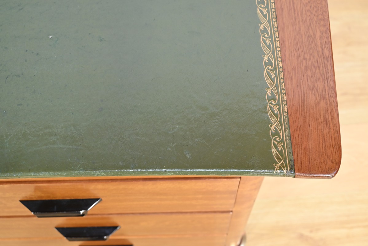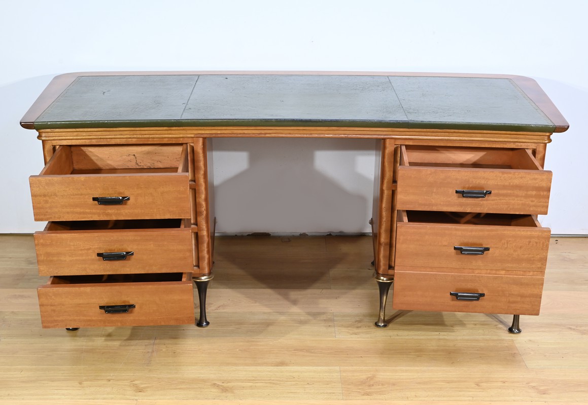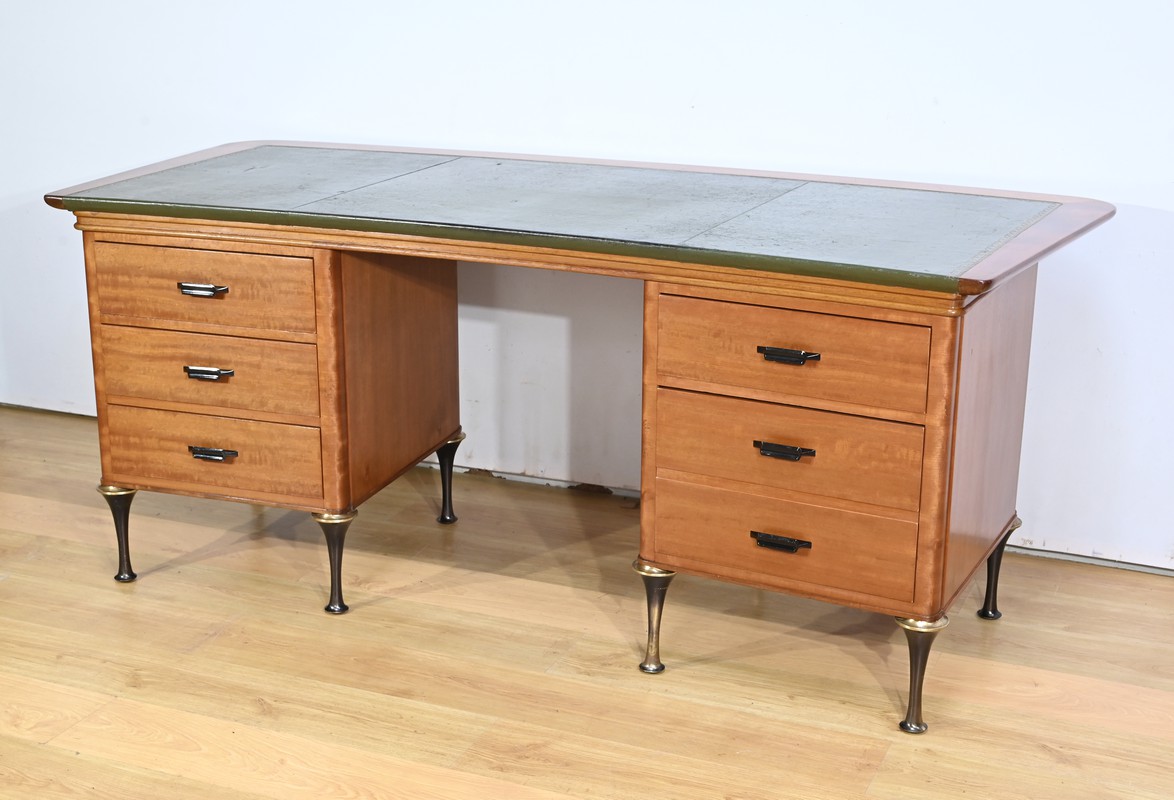 Ce bureau d’architecte en acajou massif et plaqué, légèrement concave en façade, présente un important plateau à débordement.