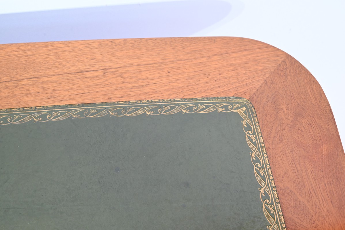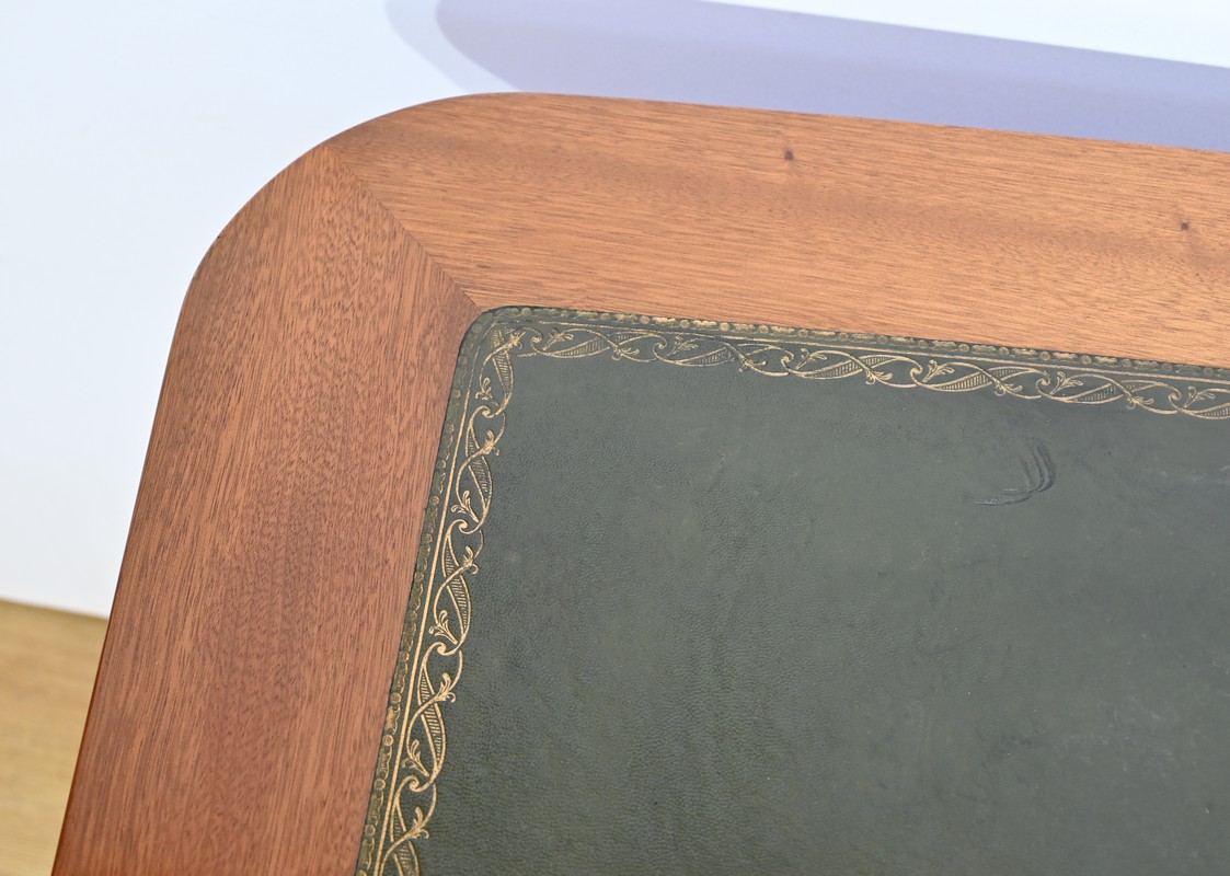 Le plateau est habillé d’un cuir vert, avec vignettes dorées, recouvrant le chant avant et souligné par un cadre à coupe d’onglet sur trois faces.