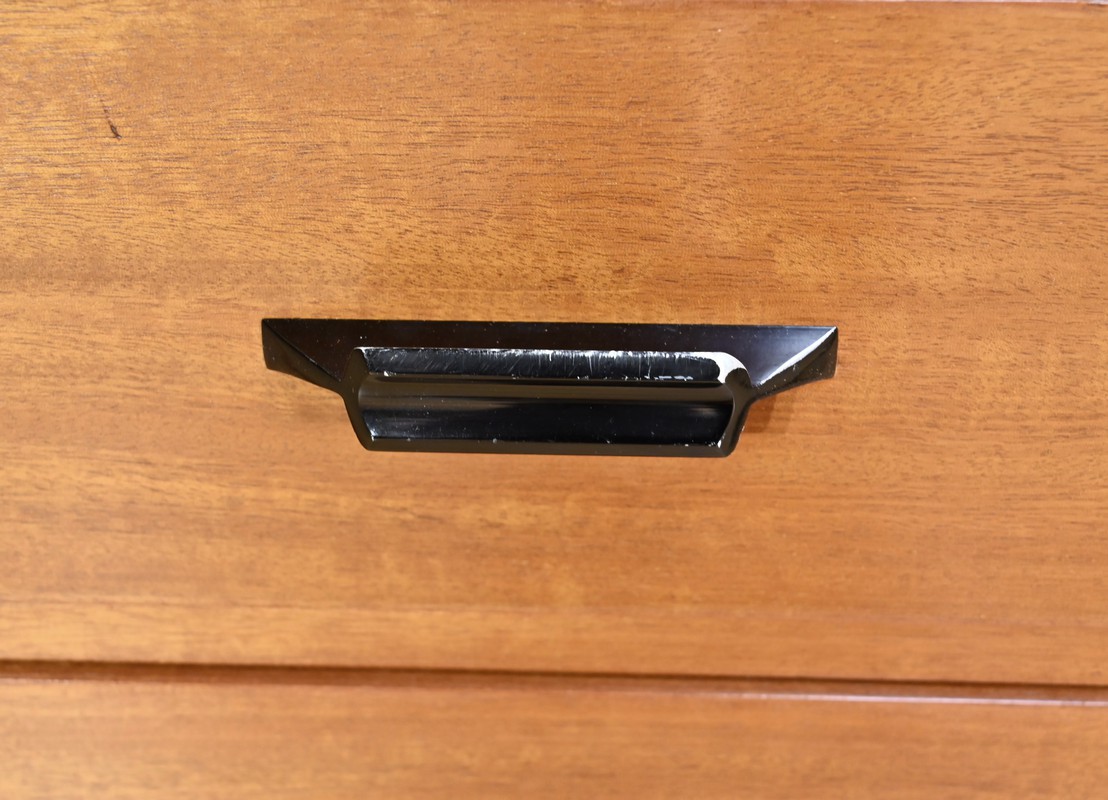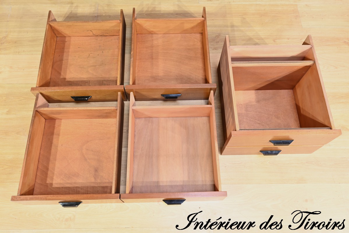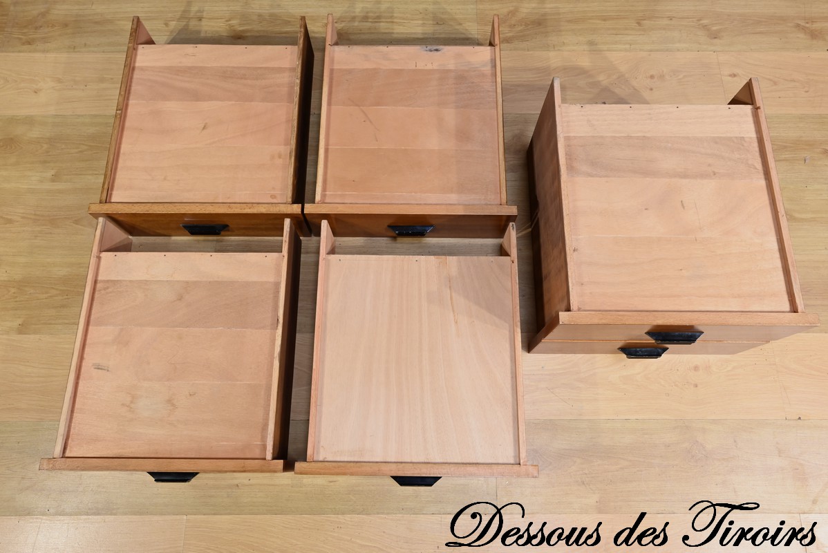 Ce dessus est porté par deux caissons avec trois tiroirs identiques à gauche et deux tiroirs à droite dont un, plus haut, à double façade.
