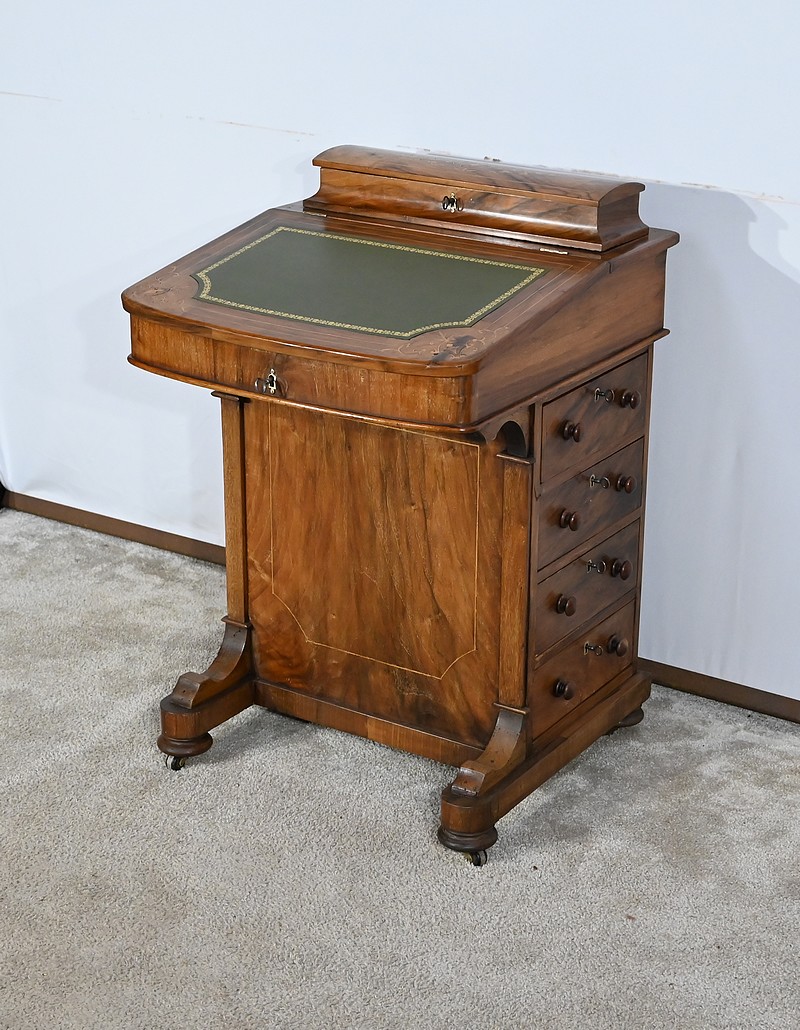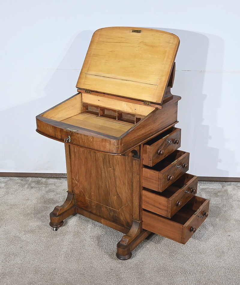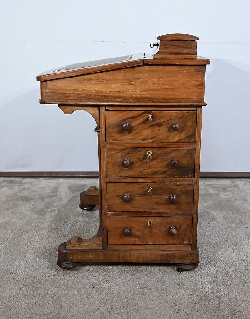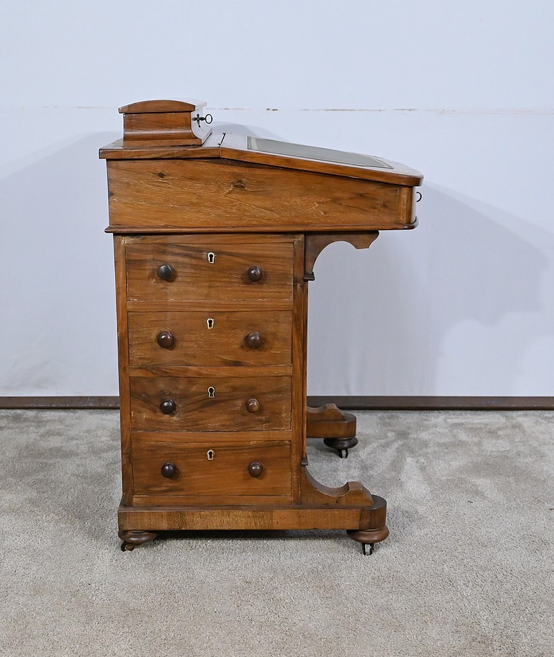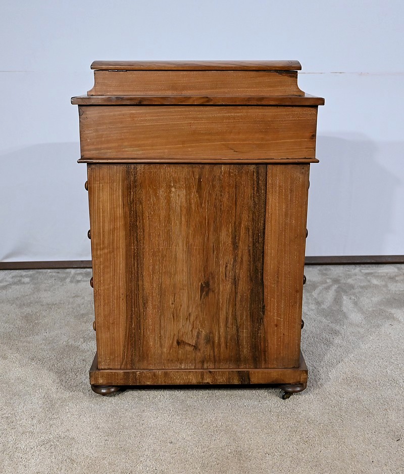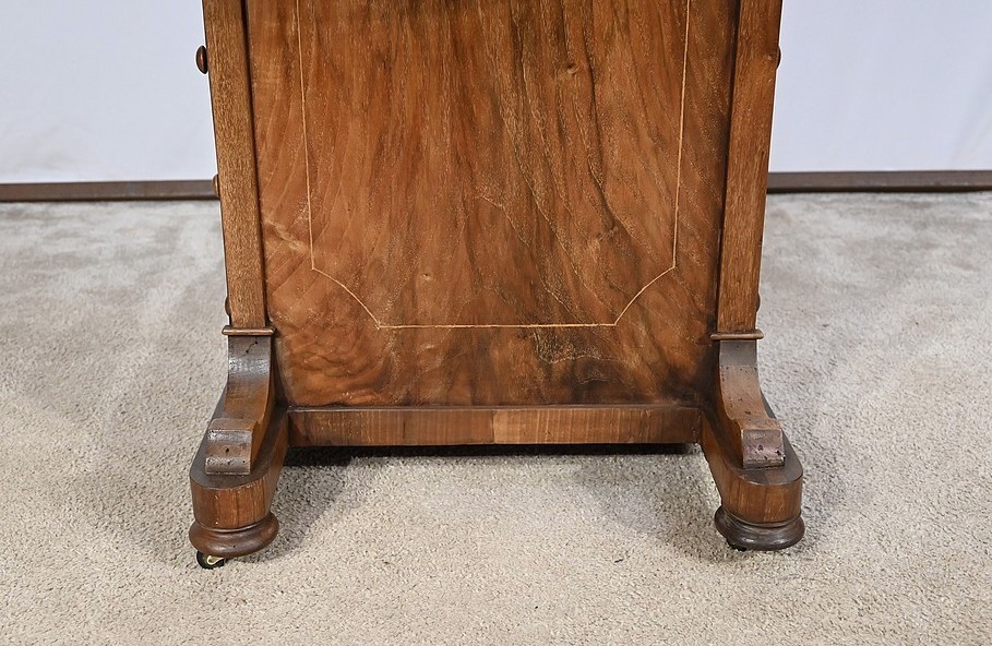 Charmant petit bureau de milieu en placage de noyer, composé en partie basse de quatre tiroirs aux dimensions identiques. Ses tiroirs situés en partie droite, s’ouvrent à l’aide de boutons de tirage en bois tourné. Ils se ferment grâce à une serrure d’origine avec clé rapportée et ajustée, en état de fonctionnement. Une entrée avec filet laiton souligne le passage de chaque clé. Chacun de ces tiroirs possède des côtés et des fonds en acajou. En partie gauche, la façade est habillée de quatre faux tiroirs dans le même esprit que leurs homologues. Ce mobilier repose sur quatre pieds galettes avec roulettes, permettant un déplacement facile dans la pièce de votre choix.