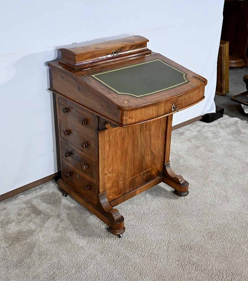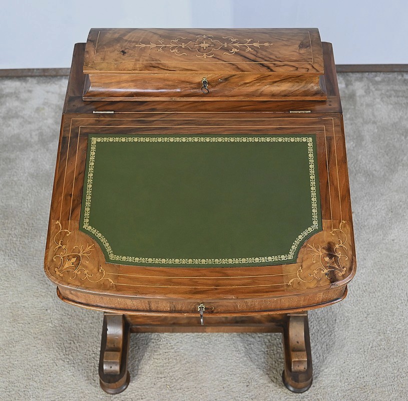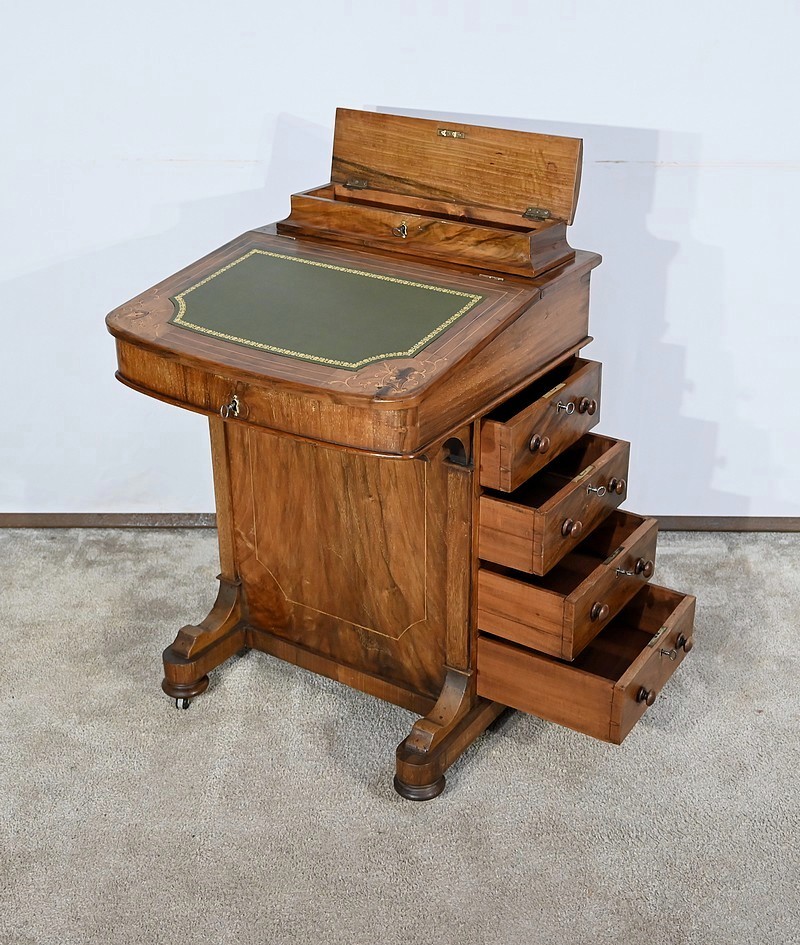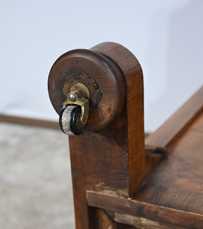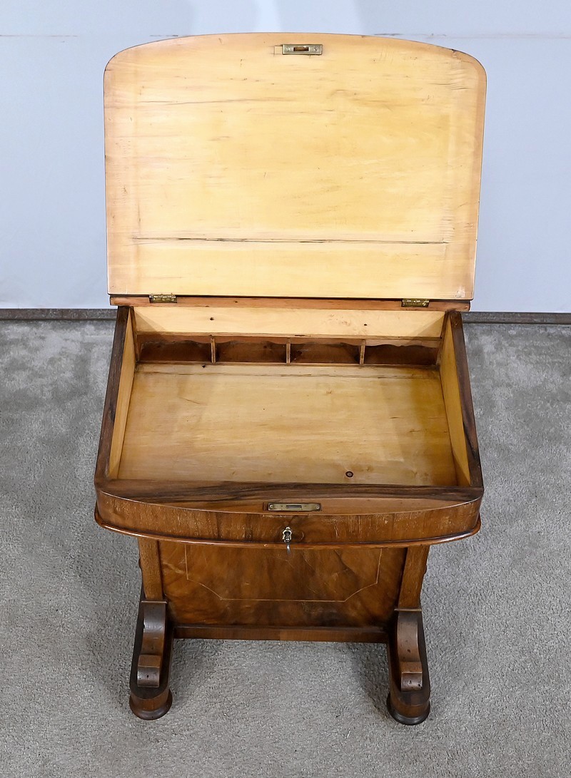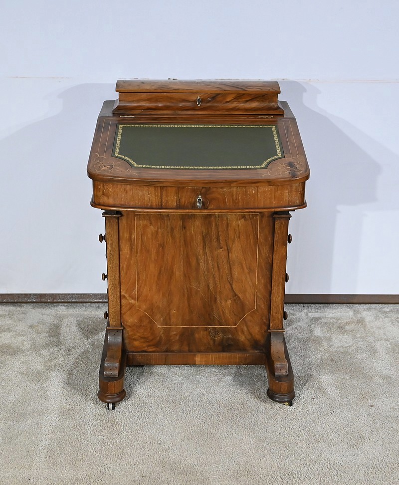 Charmant petit bureau de milieu en placage de noyer, composé en partie basse de quatre tiroirs aux dimensions identiques. Ses tiroirs situés en partie droite, s’ouvrent à l’aide de boutons de tirage en bois tourné. Ils se ferment grâce à une serrure d’origine avec clé rapportée et ajustée, en état de fonctionnement. Une entrée avec filet laiton souligne le passage de chaque clé. Chacun de ces tiroirs possède des côtés et des fonds en acajou. En partie gauche, la façade est habillée de quatre faux tiroirs dans le même esprit que leurs homologues. Ce mobilier repose sur quatre pieds galettes avec roulettes, permettant un déplacement facile dans la pièce de votre choix.