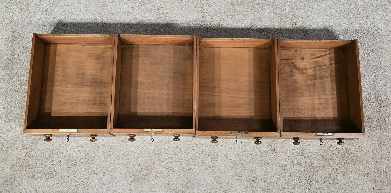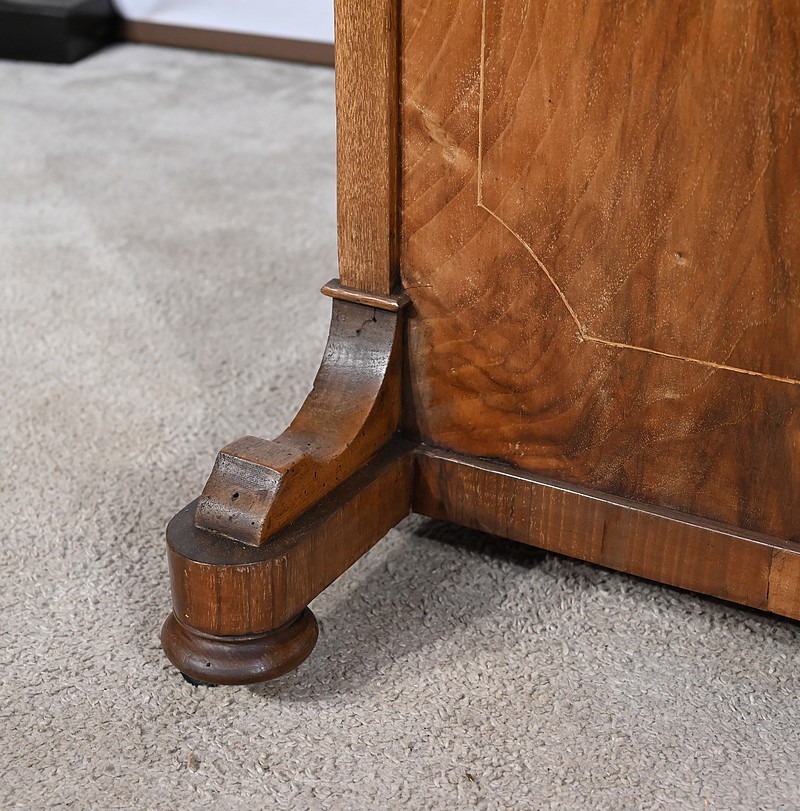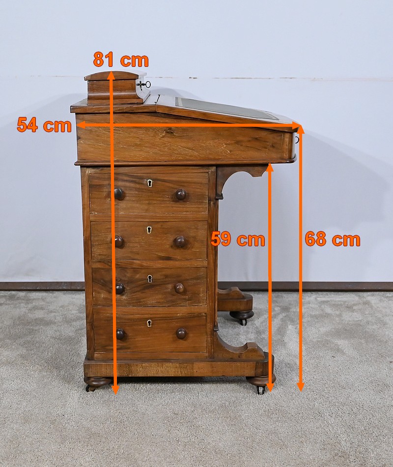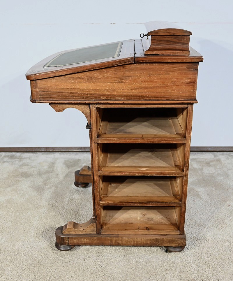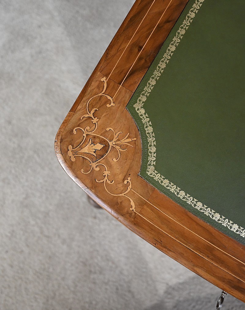 Charmant petit bureau de milieu en placage de noyer, composé en partie basse de quatre tiroirs aux dimensions identiques. Ses tiroirs situés en partie droite, s’ouvrent à l’aide de boutons de tirage en bois tourné. Ils se ferment grâce à une serrure d’origine avec clé rapportée et ajustée, en état de fonctionnement. Une entrée avec filet laiton souligne le passage de chaque clé. Chacun de ces tiroirs possède des côtés et des fonds en acajou. En partie gauche, la façade est habillée de quatre faux tiroirs dans le même esprit que leurs homologues. Ce mobilier repose sur quatre pieds galettes avec roulettes, permettant un déplacement facile dans la pièce de votre choix.