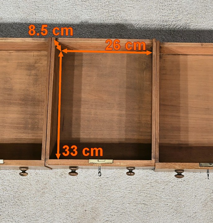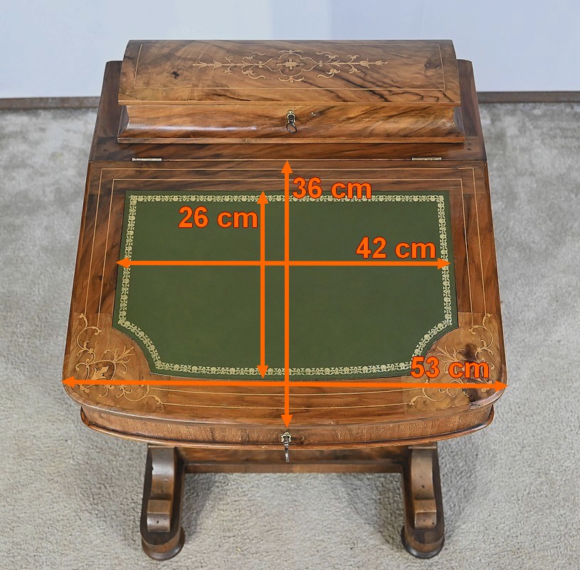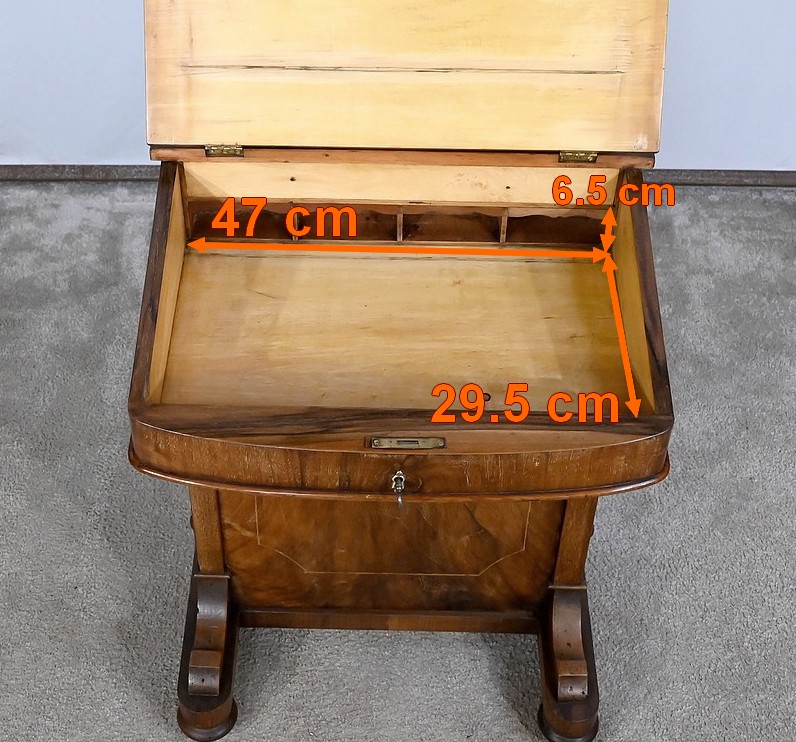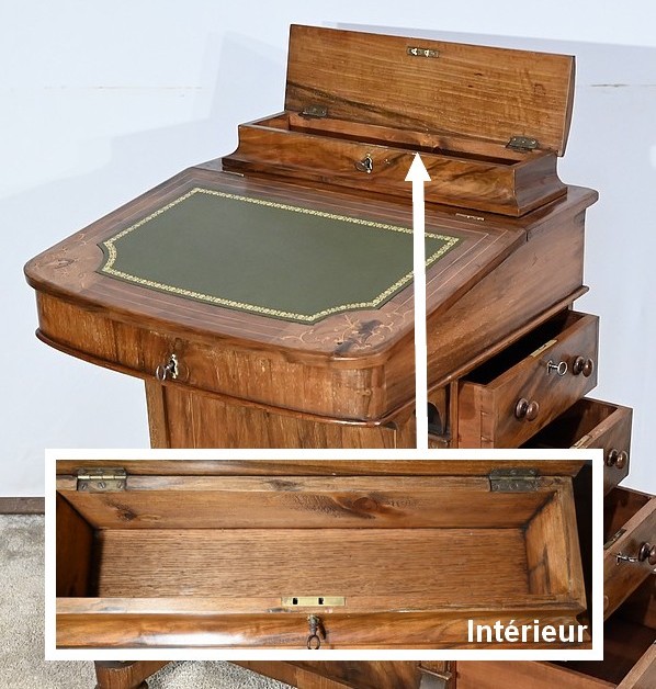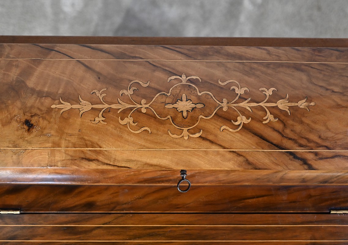 Ce meuble présente en partie haute un abattant incliné dont le pourtour est décoré de filets de citronnier. Aux angles des cet abattant, de belles marqueteries dans le goût Charles X forment des rinceaux fins et raffinés. Au milieu, un superbe cuir neuf de couleur vert est orné d’une vignette à froid et d’une vignette dorée. Une serrure d’origine à crochet latéral accompagnée de sa clé en état de fonctionnement, permet la découverte d’un espace de rangement fonctionnel. Celui-ci, en bois clair, est muni également de quatre petites niches. Au sommet, un compartiment avec façade et pourtour à défoncement possède un couvercle légèrement bombé, incrusté de filets et d’une composition d’inspiration végétale. Une serrure d’origine à double crochet permet de fermer cette espace de rangement.