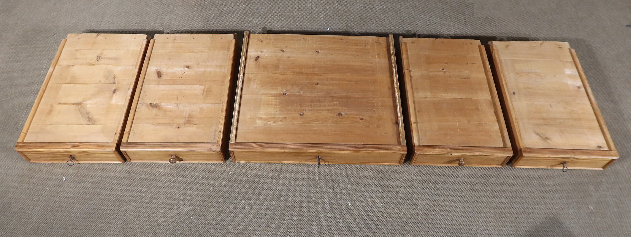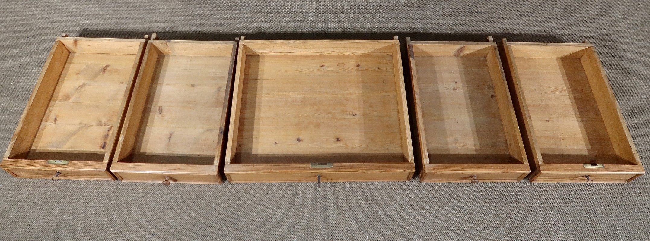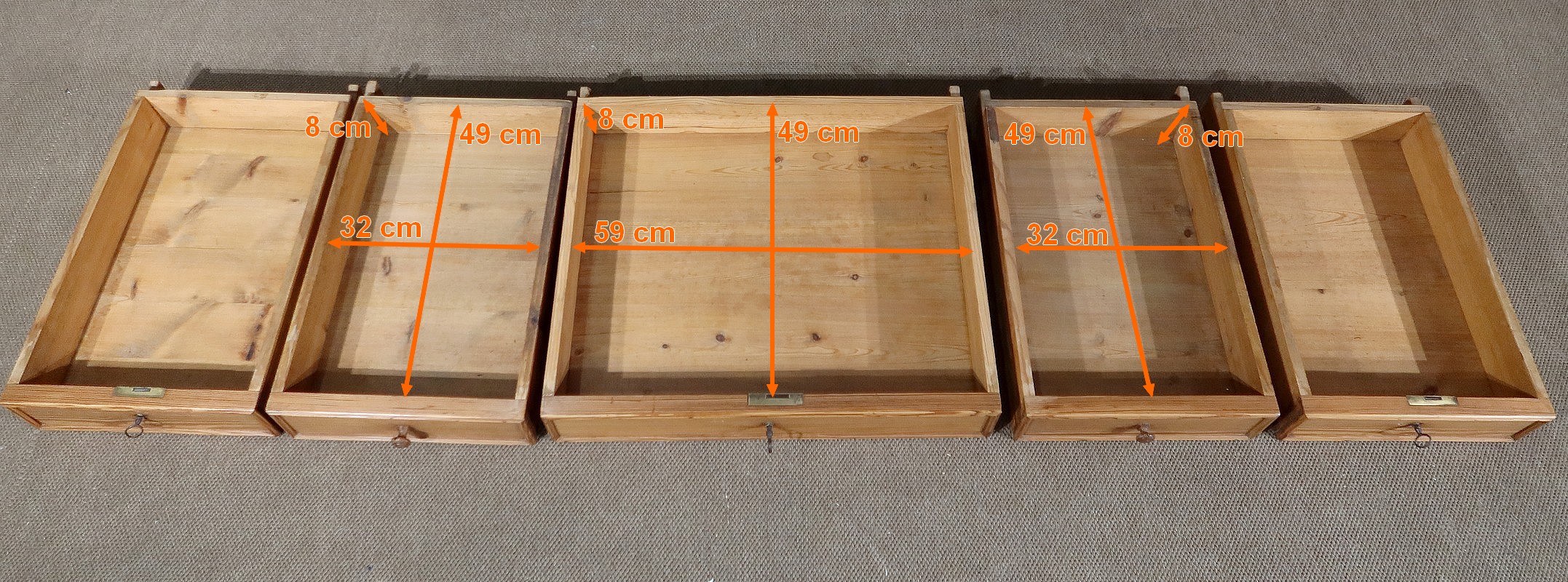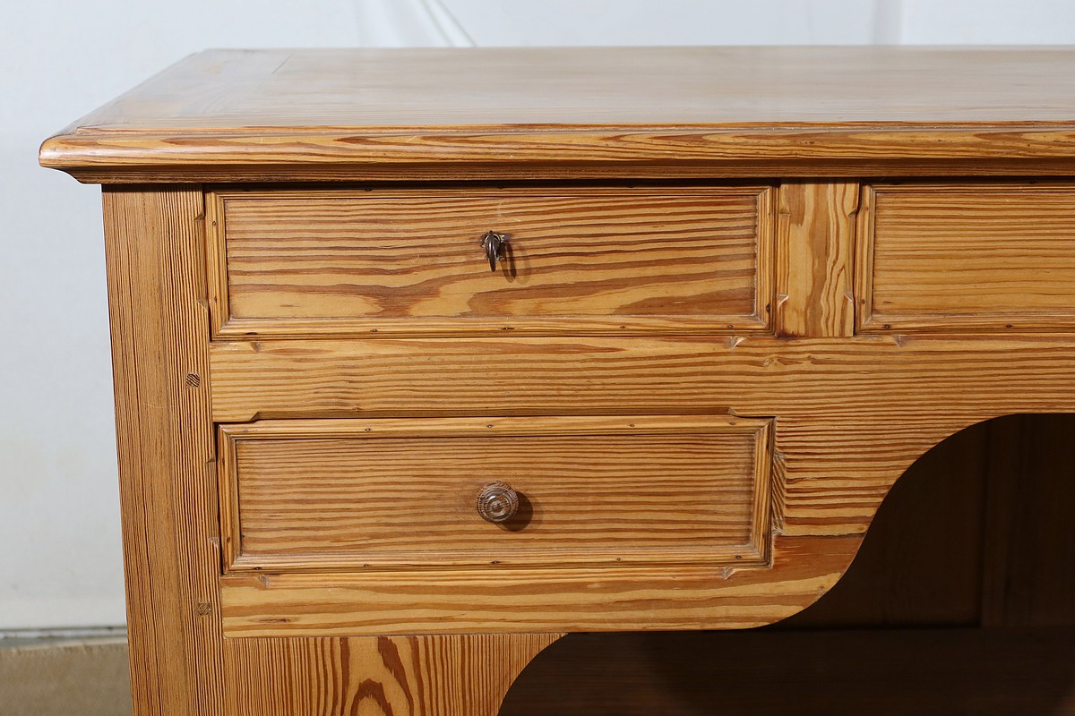 Les trois tiroirs en ceinture possèdent une serrure d’origine et une clé en état de fonctionnement. De chaque côté, un tiroir supplémentaire ouvrant par un bouton bois complète l’ensemble.