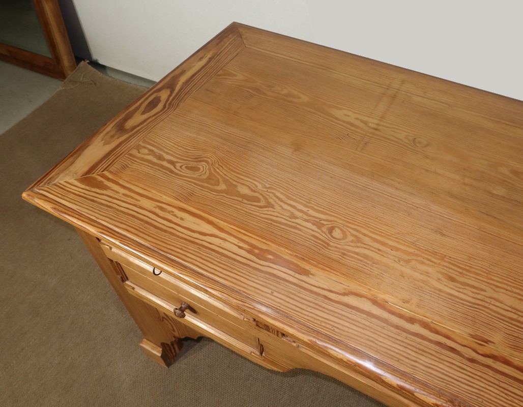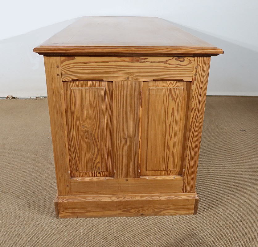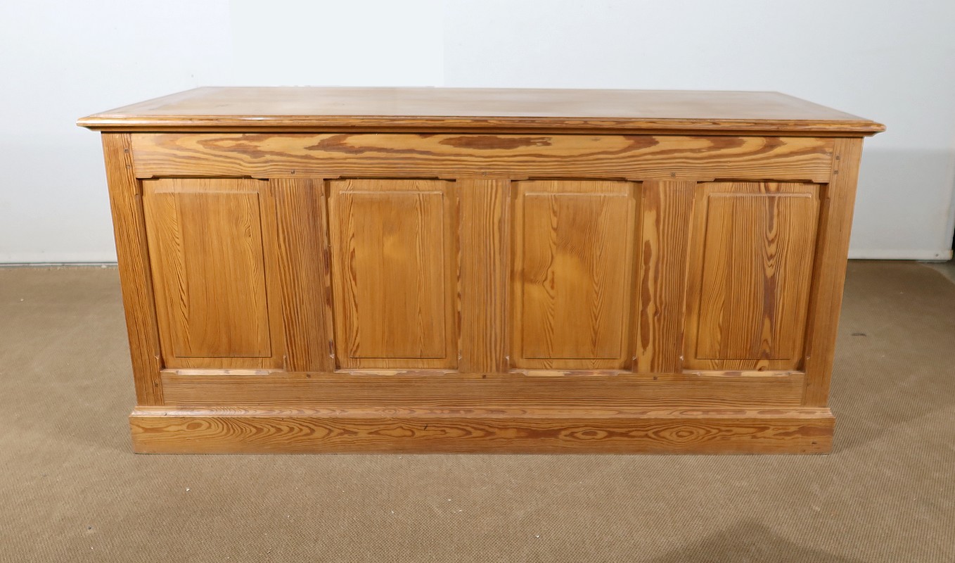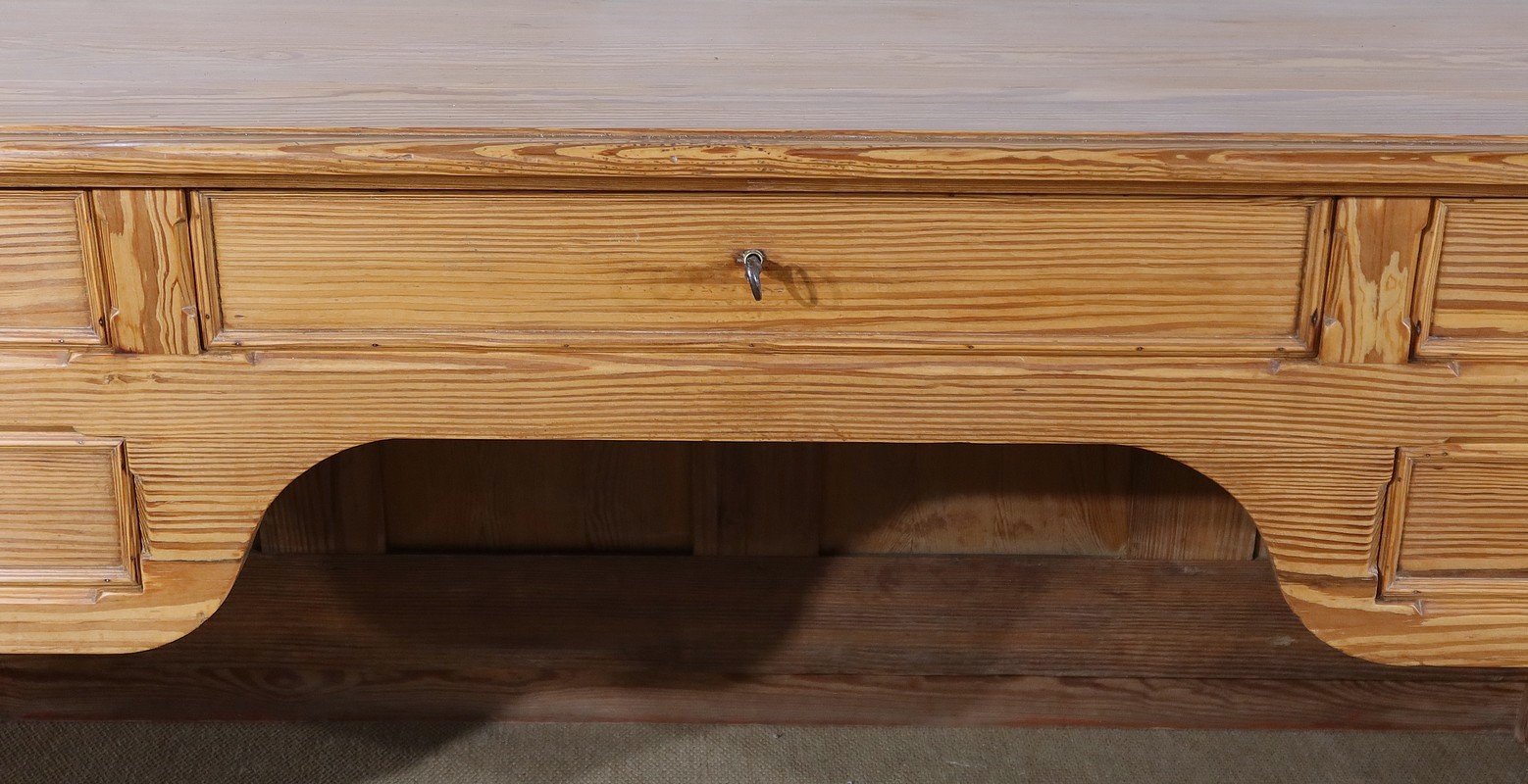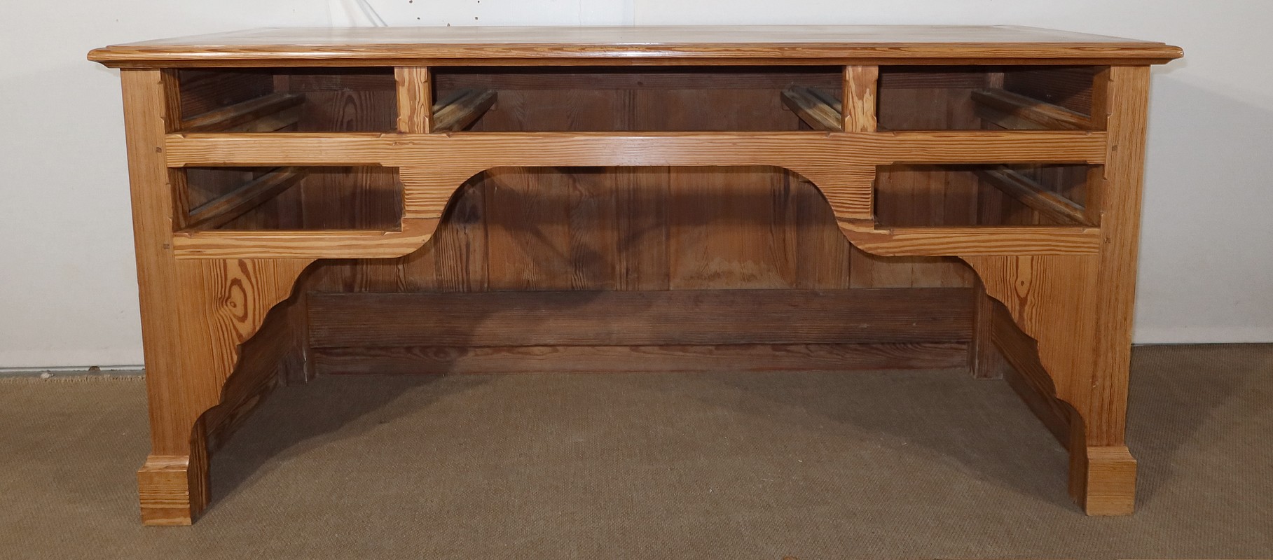 Grand bureau de communauté en pitchpin de qualité pourvu d’un fond panneauté.