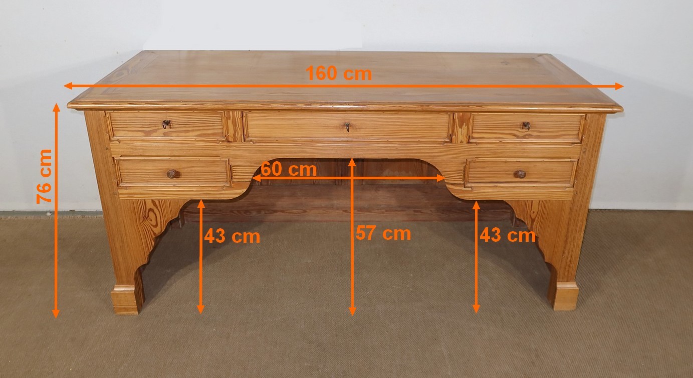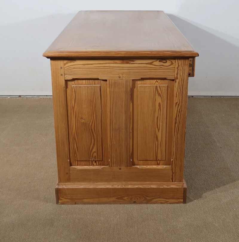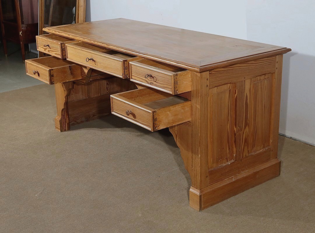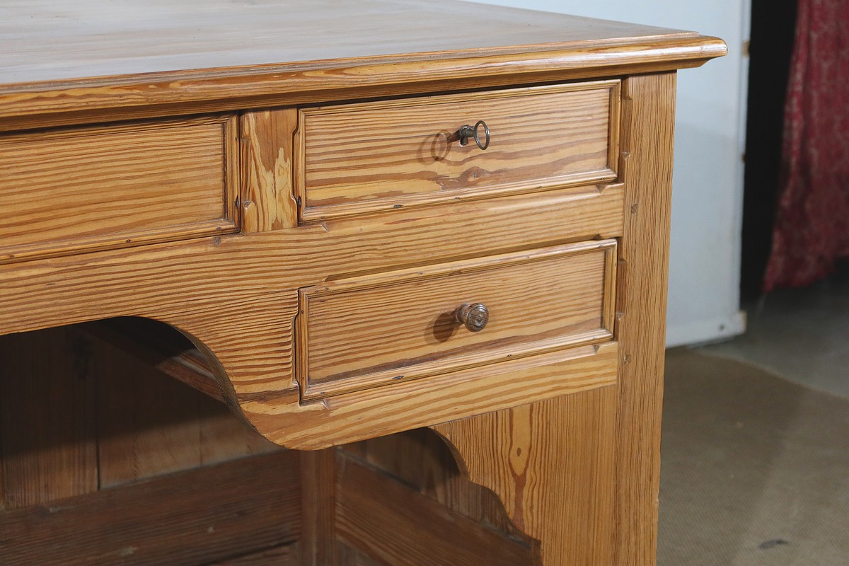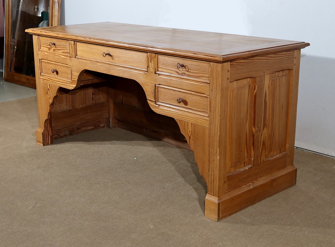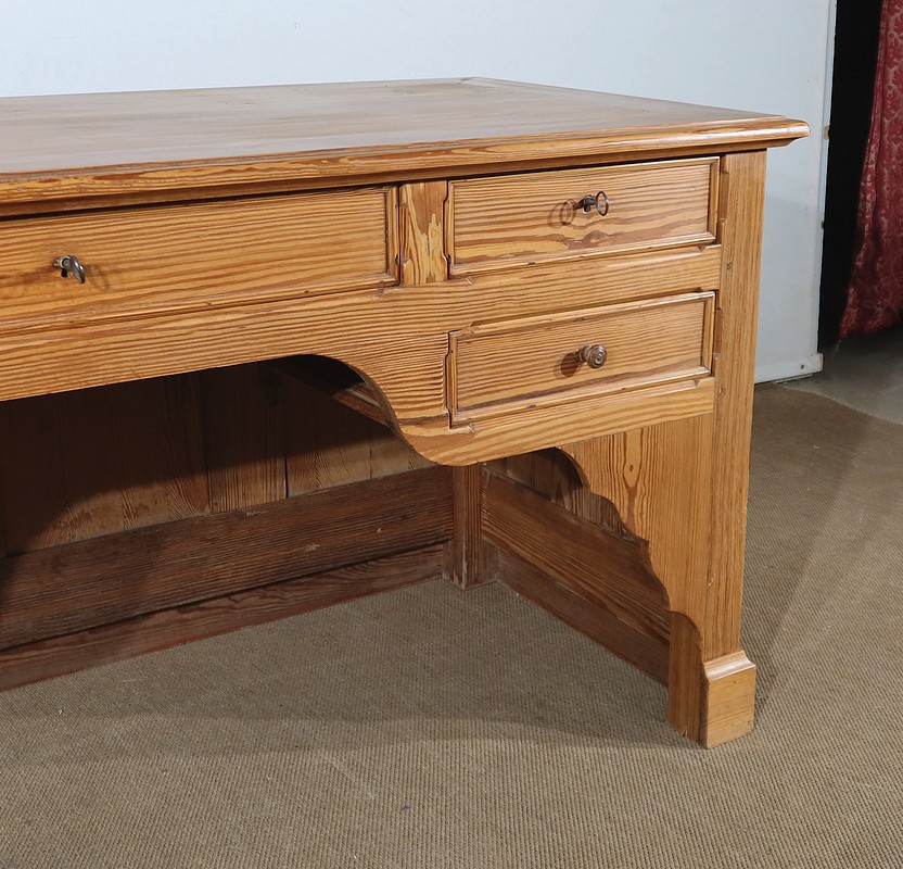 Grand bureau de communauté en pitchpin de qualité pourvu d’un fond panneauté.