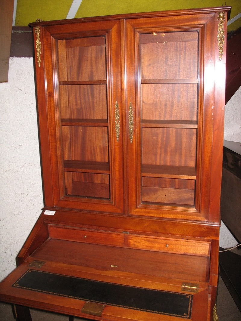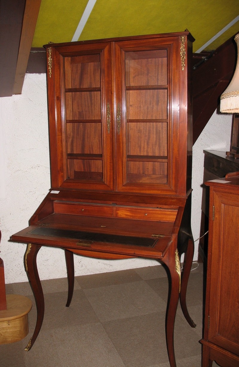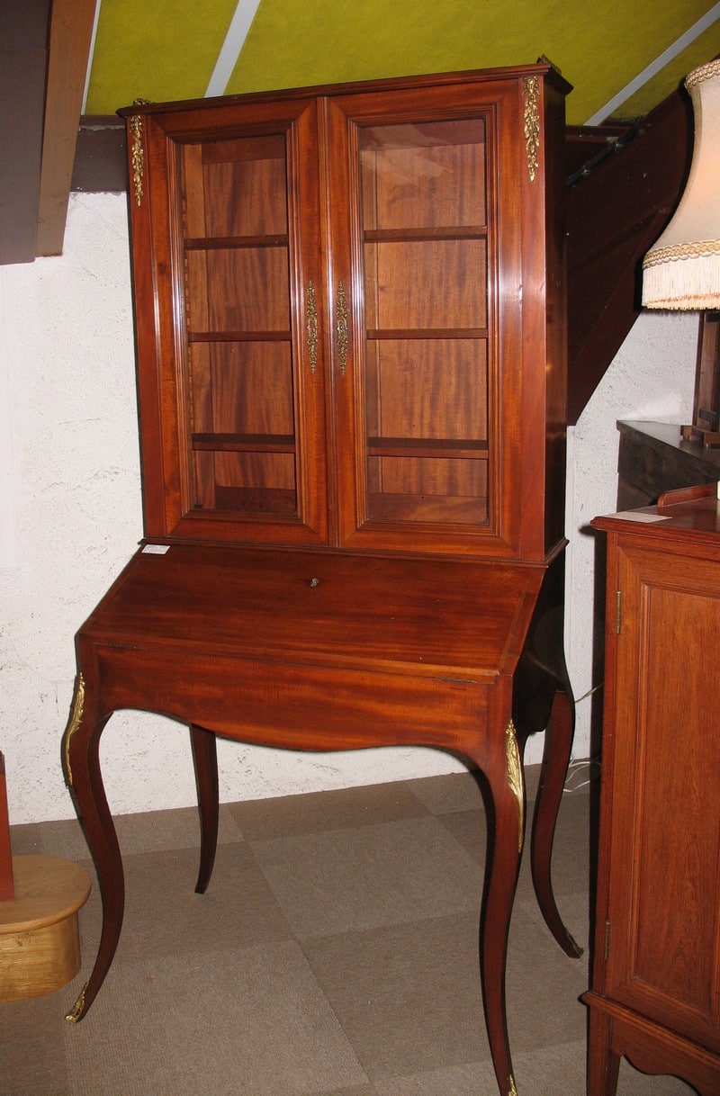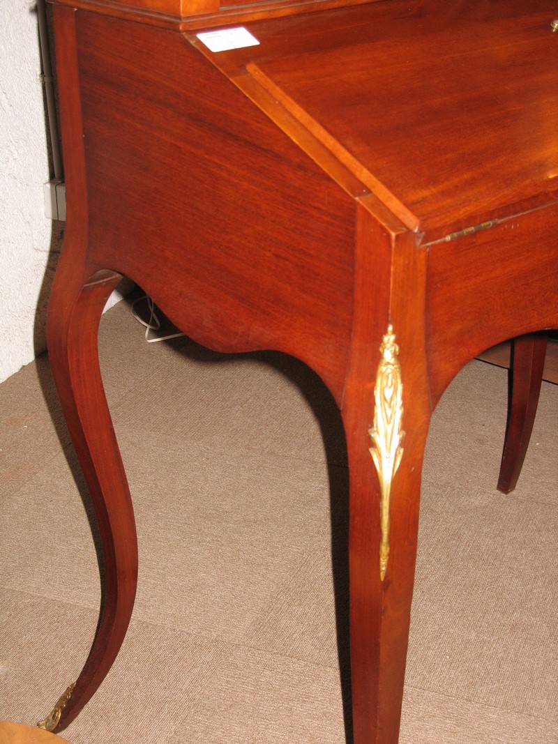 Petit bureau de Dame avec vitrine de style Louis XV en Acajou massif ouvrant par 2 portes vitrées en partie haute, un abattant renfermant 2 tiroirs et un compartiment secret. Il repose sur 4 pieds galbés avec sabots de bronze.