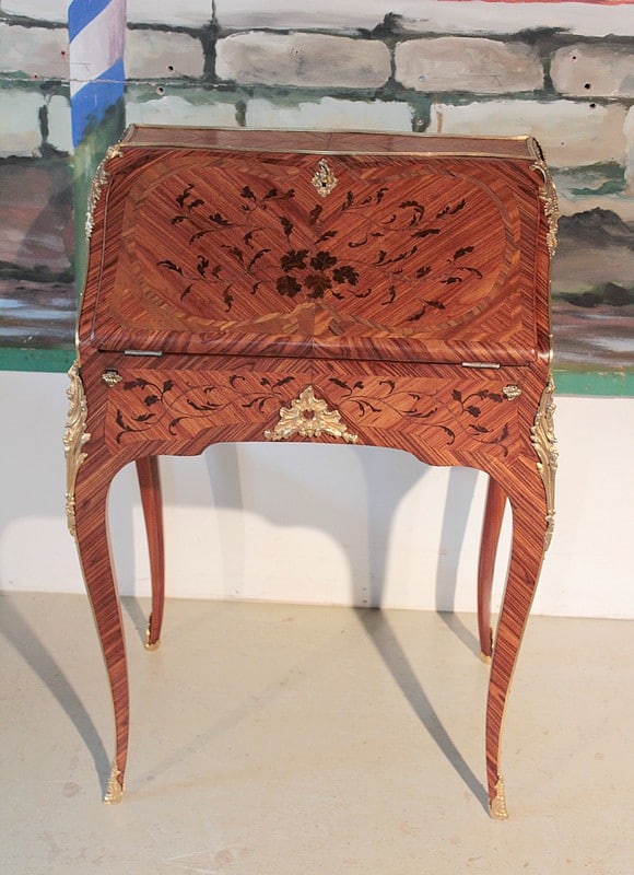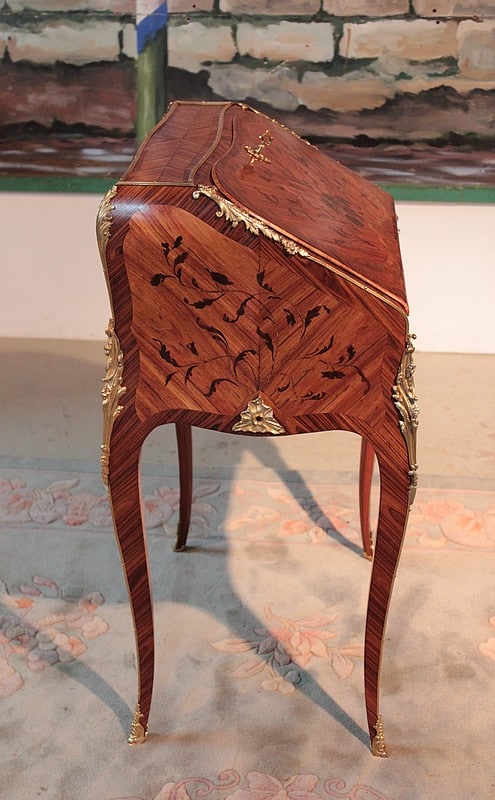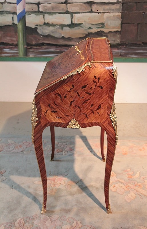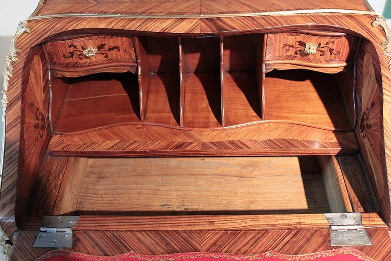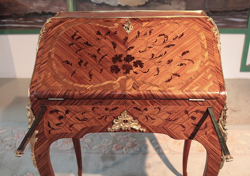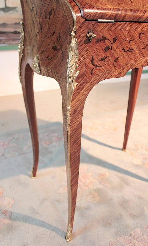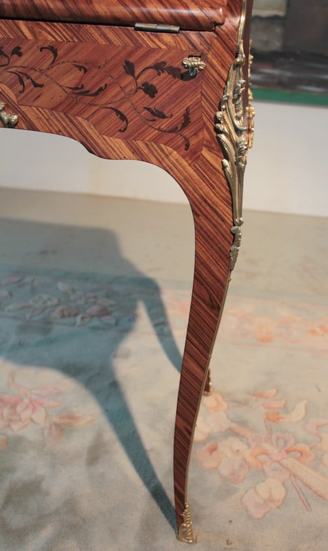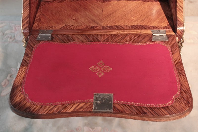 Petit bureau de pente de dame, de style Louis XV, en placage de bois de violette et bois de rose reposant sur 4 pieds galbés avec sabots de bronze. Il est marqueté sur 3 faces de branches fleuries. L’abattant découvre niches et tiroirs , le fond dissimule un compartiment secret. Il est orné de nombreuses garnitures en bronze doré.