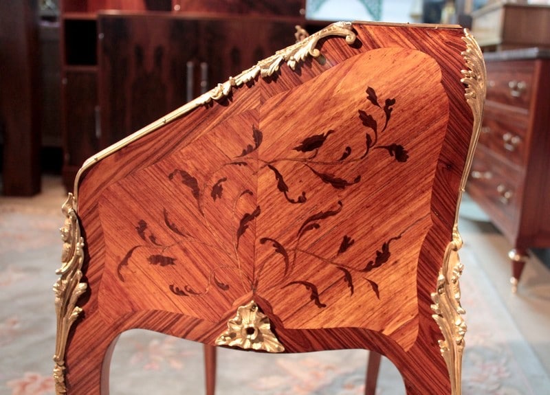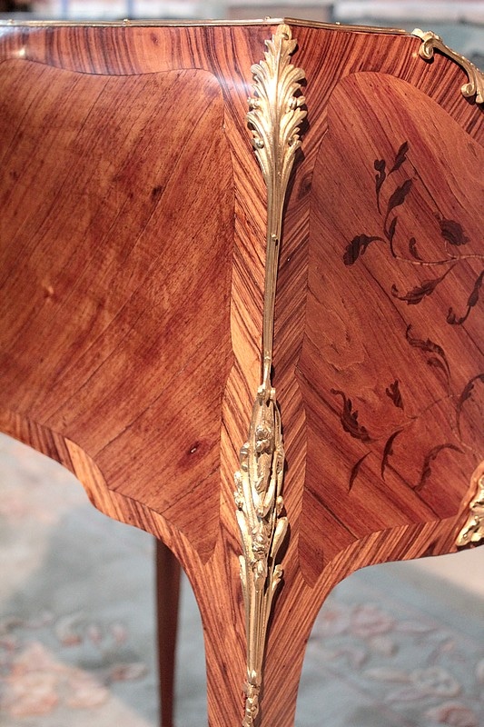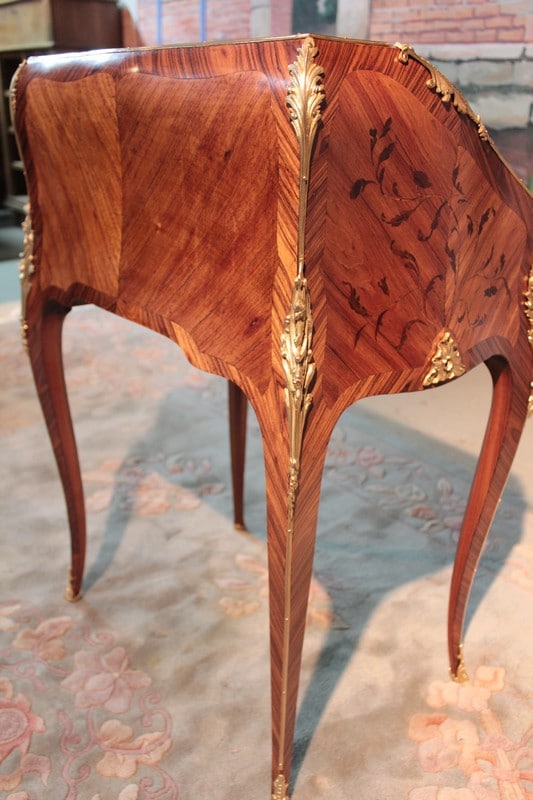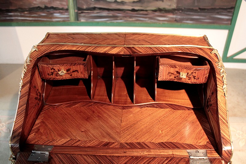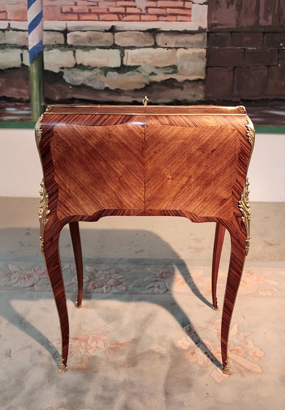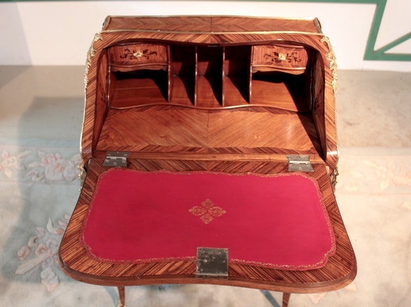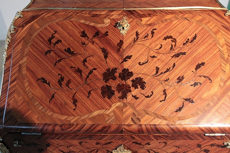 Petit bureau de pente de dame, de style Louis XV, en placage de bois de violette et bois de rose reposant sur 4 pieds galbés avec sabots de bronze. Il est marqueté sur 3 faces de branches fleuries. L’abattant découvre niches et tiroirs , le fond dissimule un compartiment secret. Il est orné de nombreuses garnitures en bronze doré.