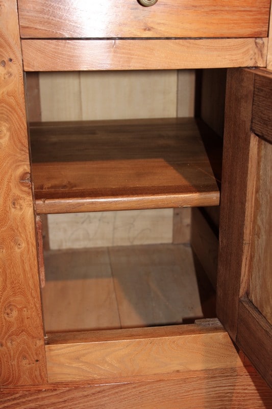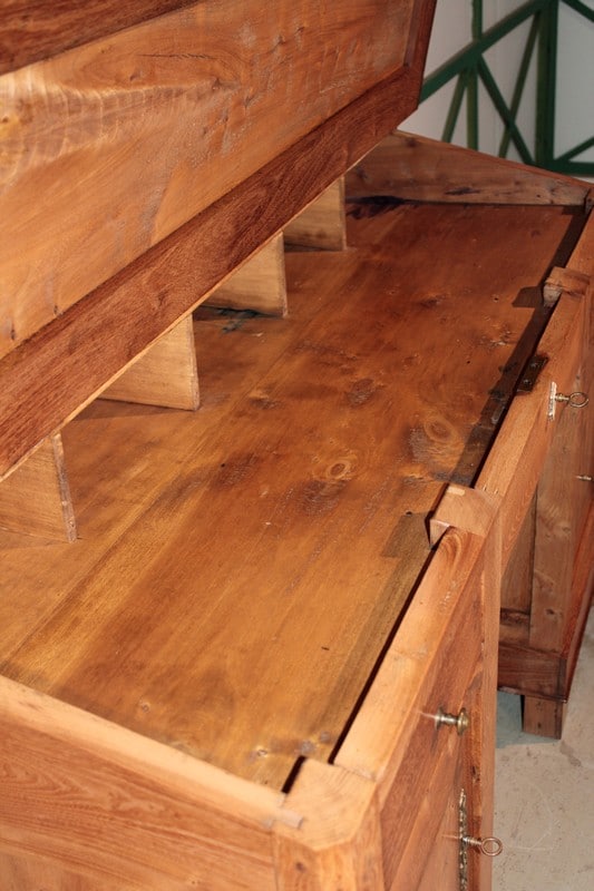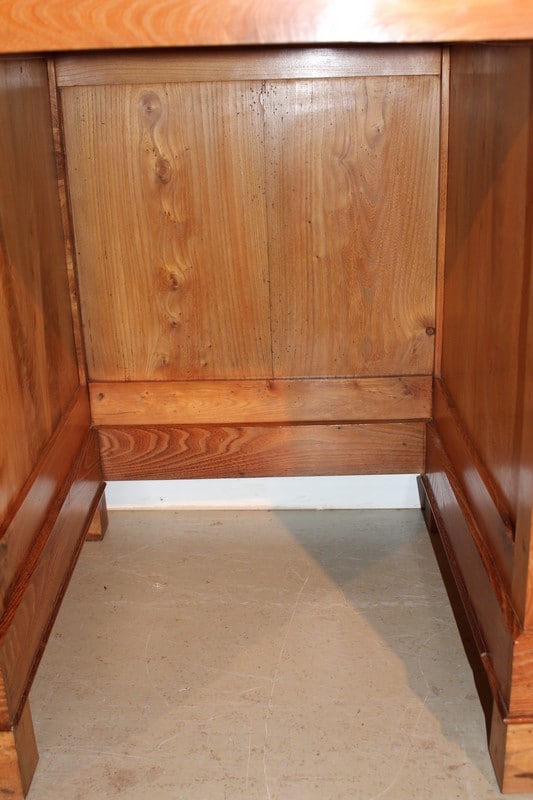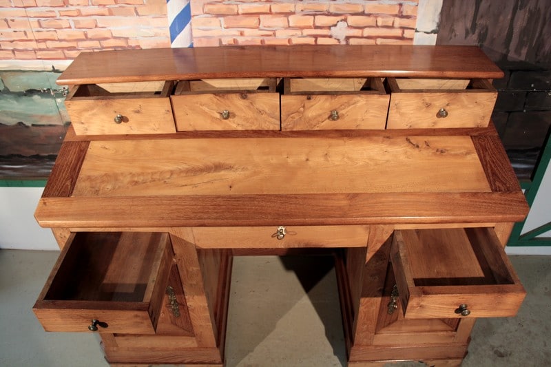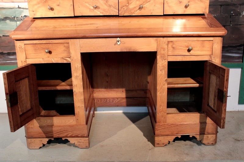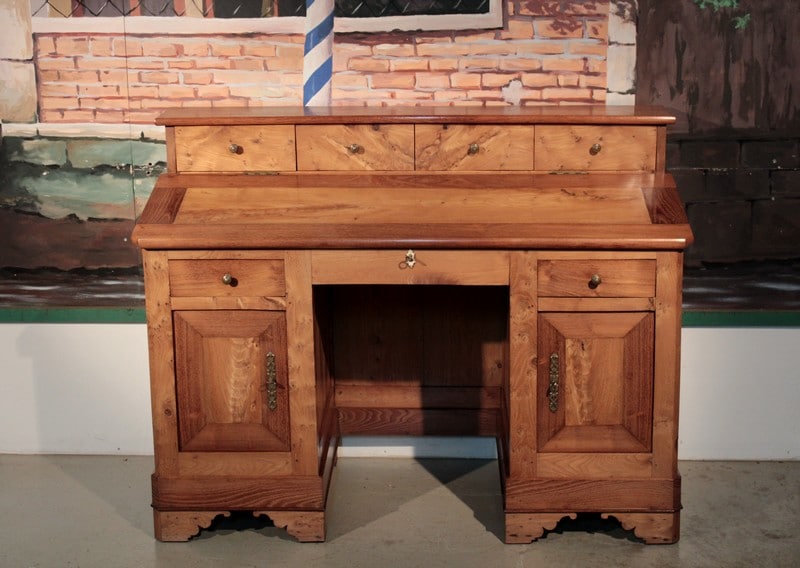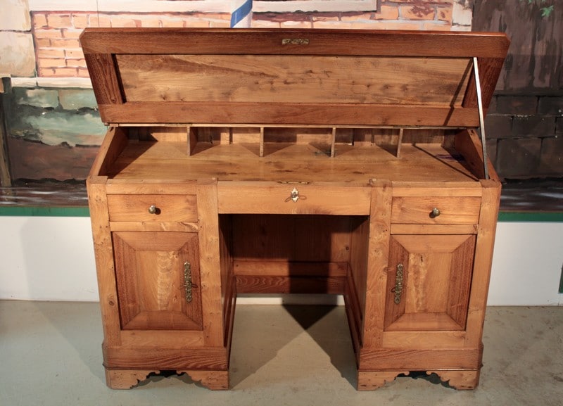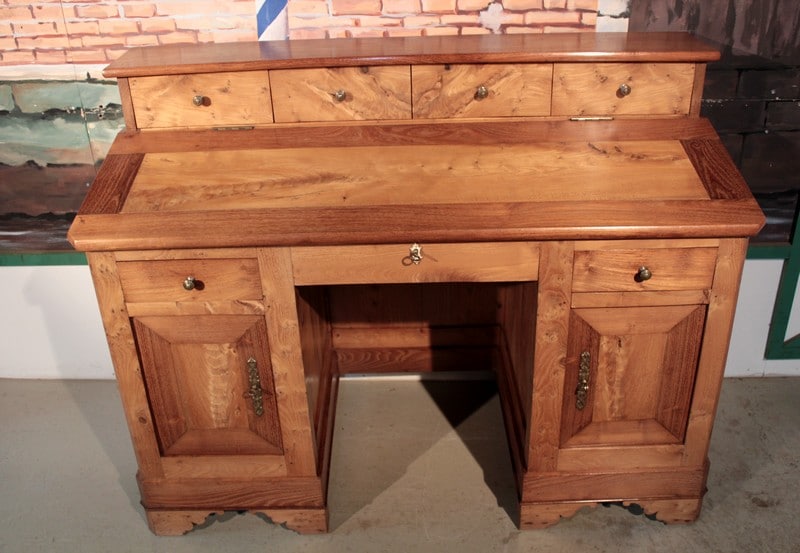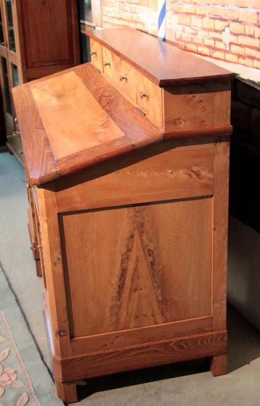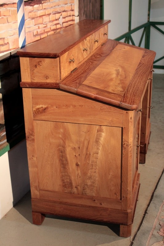 Bureau de pente à caissons en Frêne et acacia, surmonté d’un gradin ouvrant par 4 tiroirs. L’abattant renferme un espace plat avec 5 casiers. Quant à la partie basse, elle ouvre par 2 tiroirs et 2 portes. Le tiroir du milieu est un faux garni d’une entrée en os.