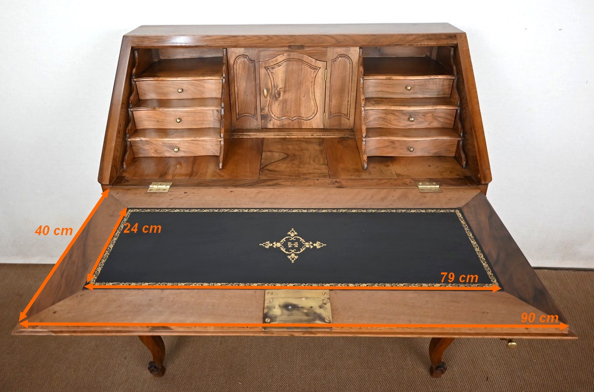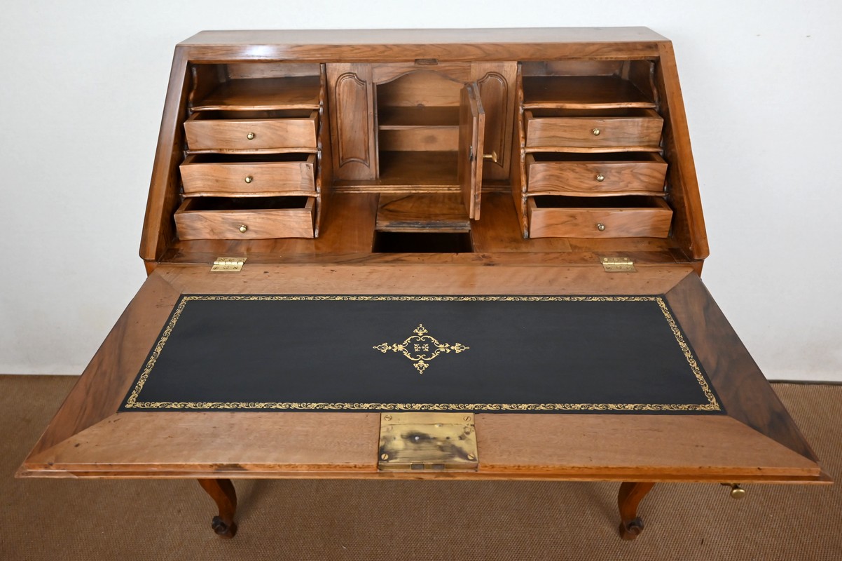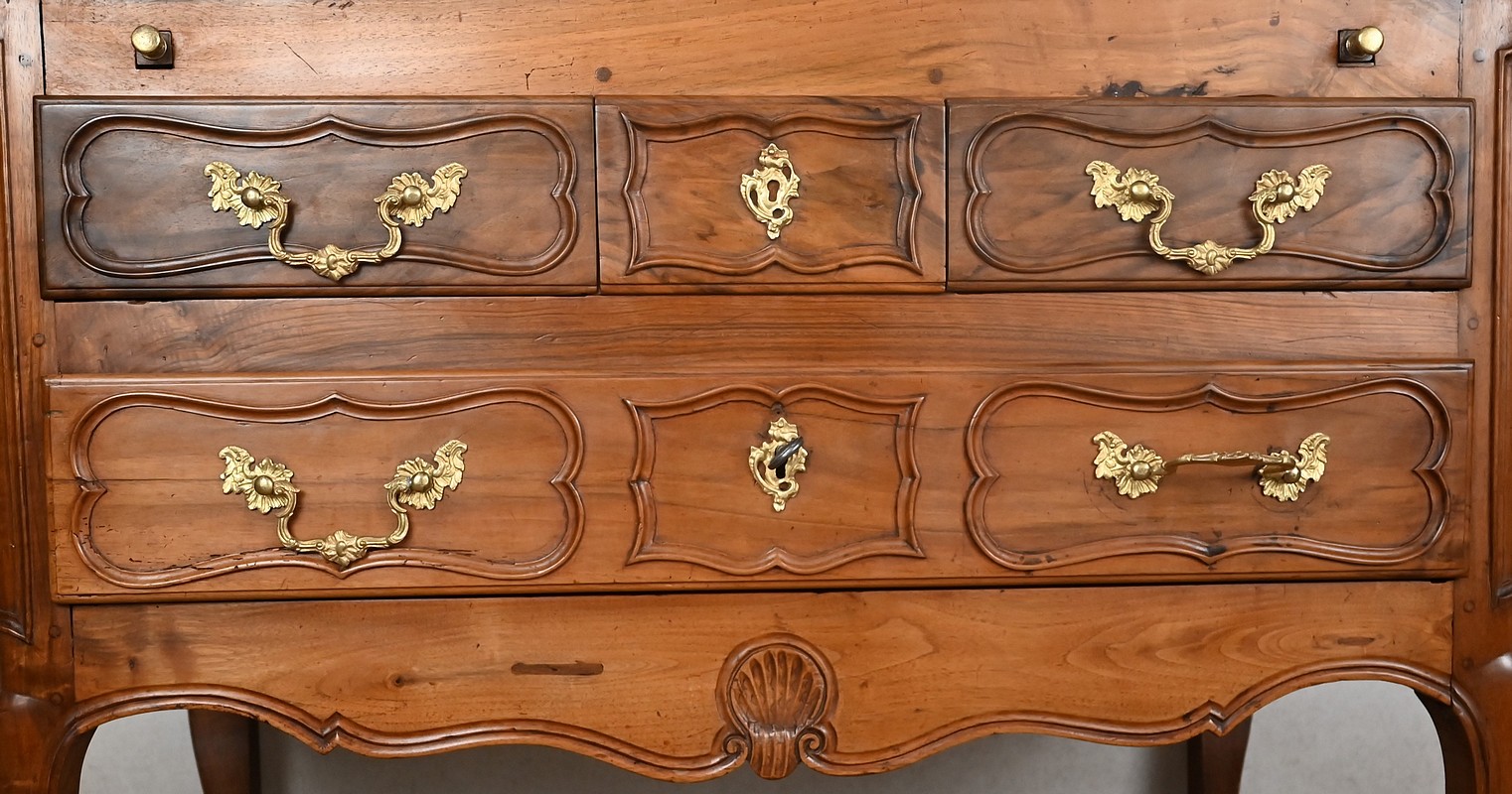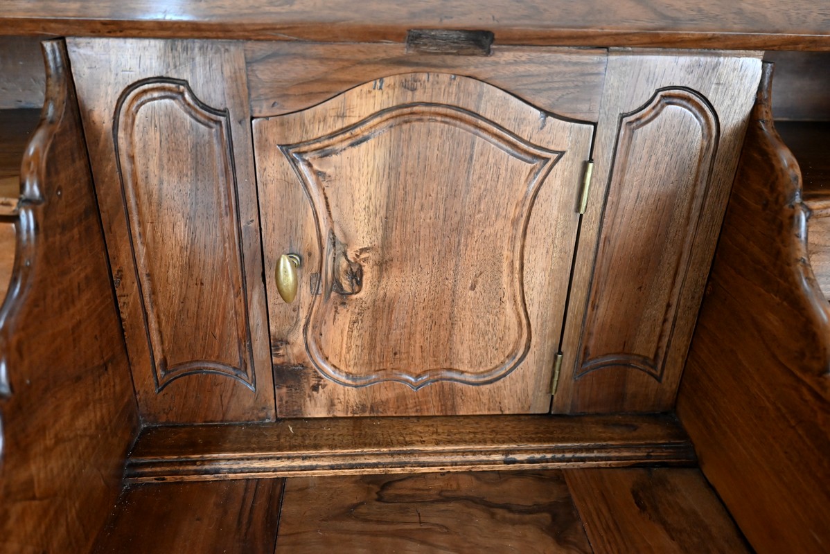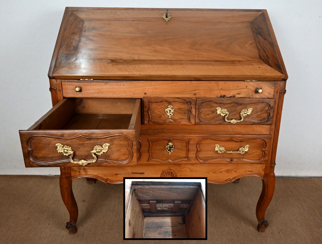 Ce meuble régional, entièrement en noyer massif, dispose d’un important abattant constitué d’un seul panneau au jointement parfait et d’un cadre à coupe d’onglet. Il est équipé d’une serrure d’origine fonctionnelle avec sa clé et son entrée bronze. Ouvert, il repose sur deux supports coulissants à boutons laiton. L’espace écritoire est foncé d’un cuir noir à vignette et motif central dorés. L’intérieur, dit à gradins, propose, de chaque côté, trois tiroirs en forme et, au centre, une porte formant tabernacle avec étagère. Particularité de ce meuble : sa niche, qui dissimule deux fermoirs. Ce système permet de condamner de façon alternée les deux petits tiroirs de la façade.