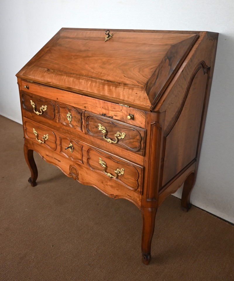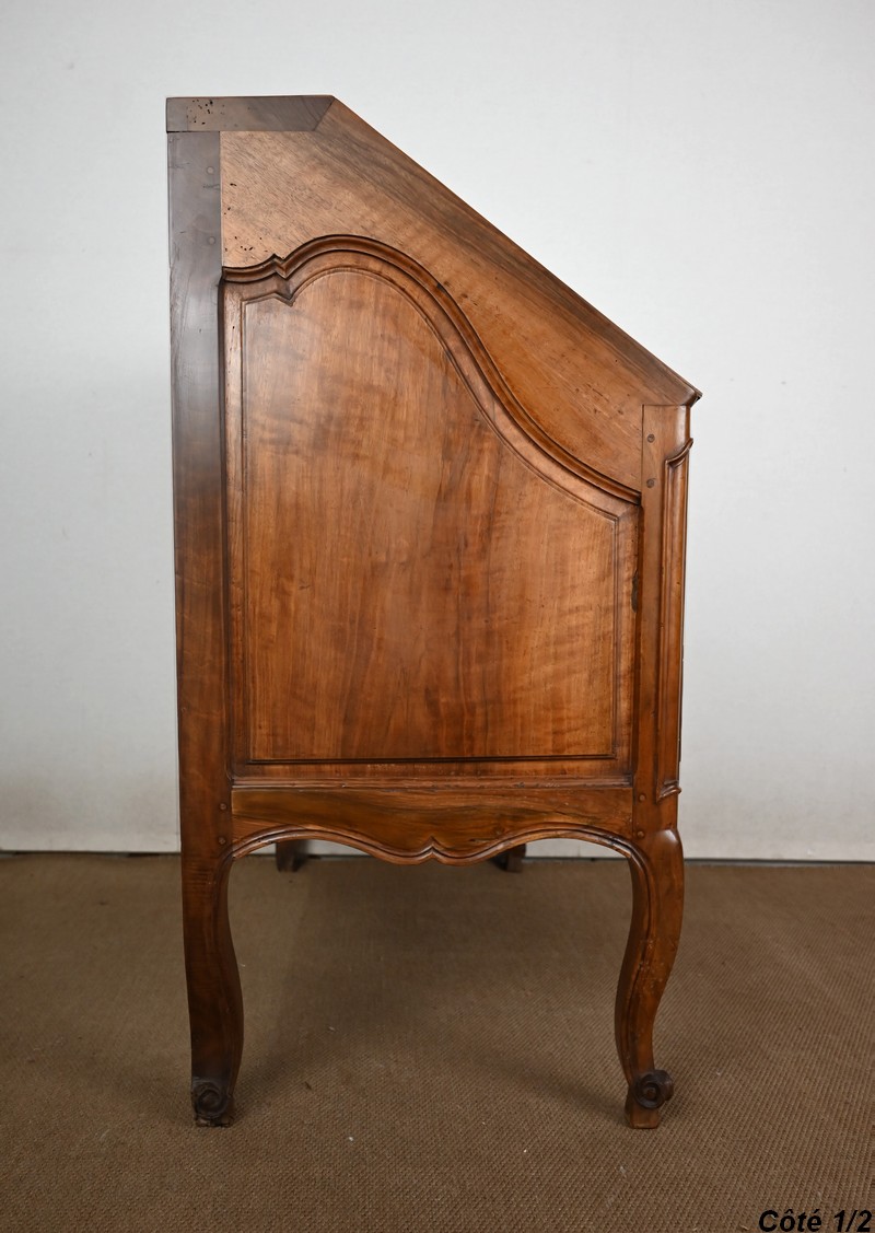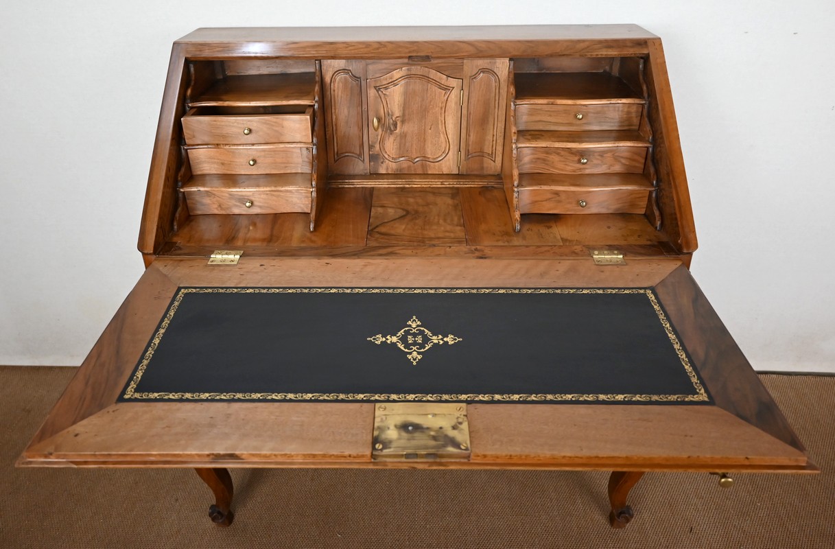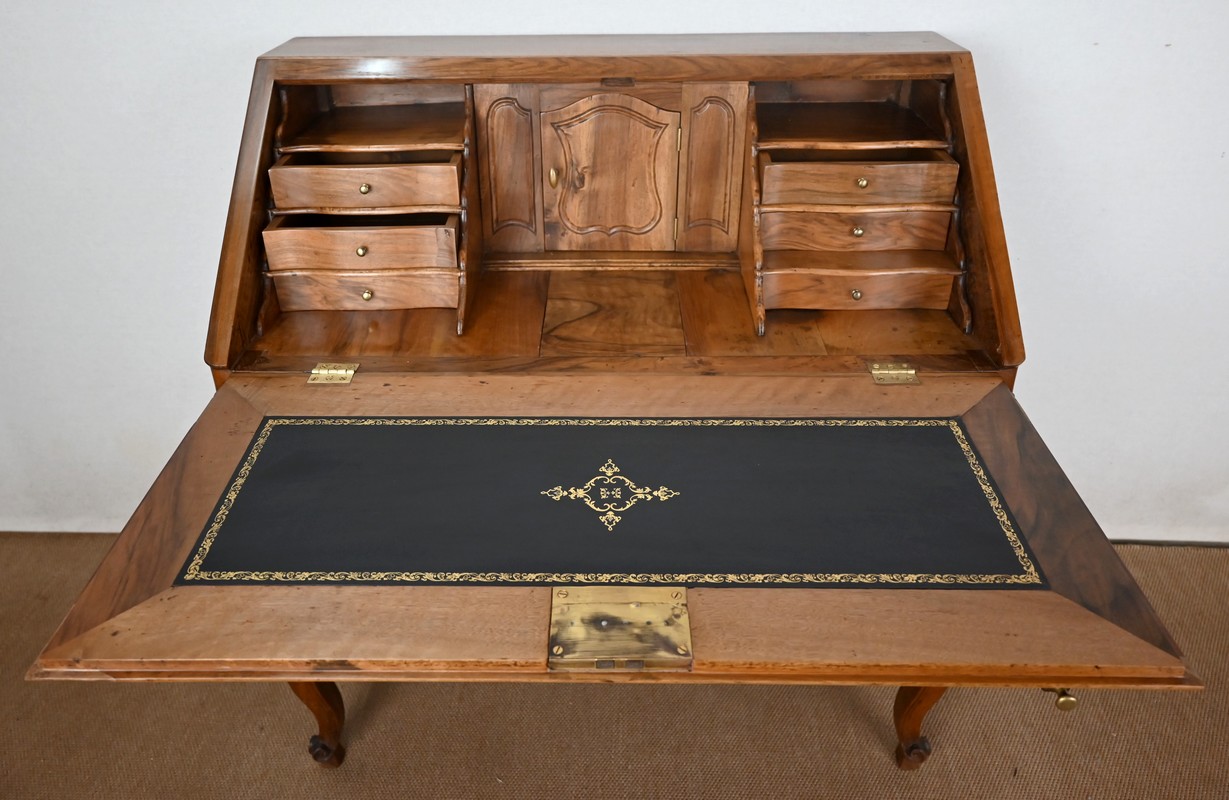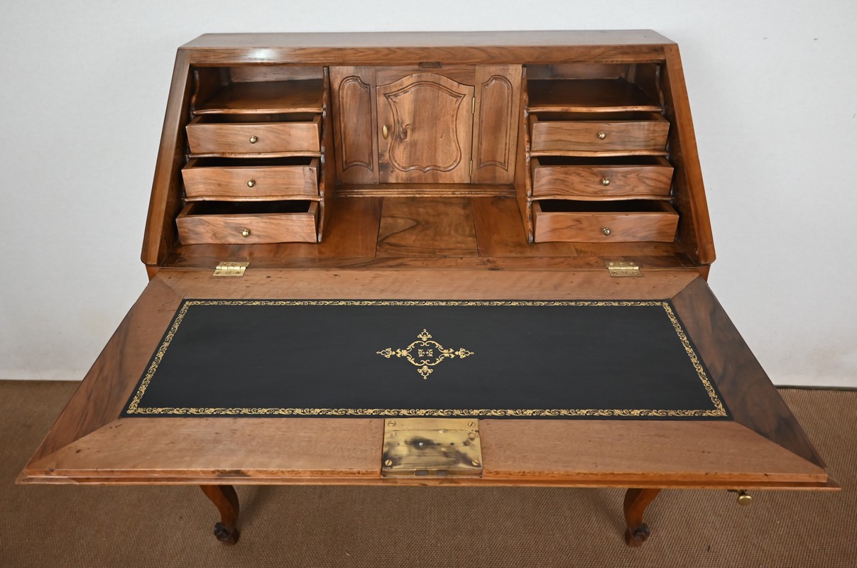 Ce meuble régional, entièrement en noyer massif, dispose d’un important abattant constitué d’un seul panneau au jointement parfait et d’un cadre à coupe d’onglet. Il est équipé d’une serrure d’origine fonctionnelle avec sa clé et son entrée bronze. Ouvert, il repose sur deux supports coulissants à boutons laiton. L’espace écritoire est foncé d’un cuir noir à vignette et motif central dorés. L’intérieur, dit à gradins, propose, de chaque côté, trois tiroirs en forme et, au centre, une porte formant tabernacle avec étagère. Particularité de ce meuble : sa niche, qui dissimule deux fermoirs. Ce système permet de condamner de façon alternée les deux petits tiroirs de la façade.