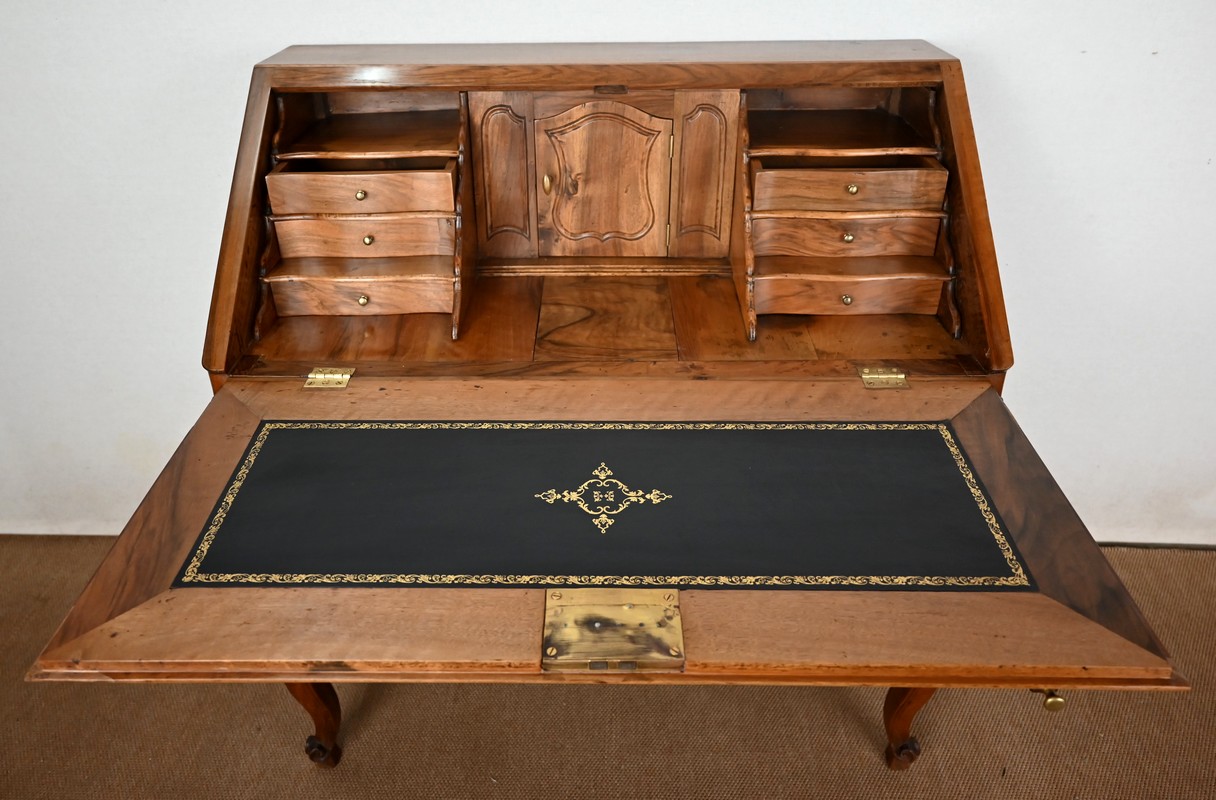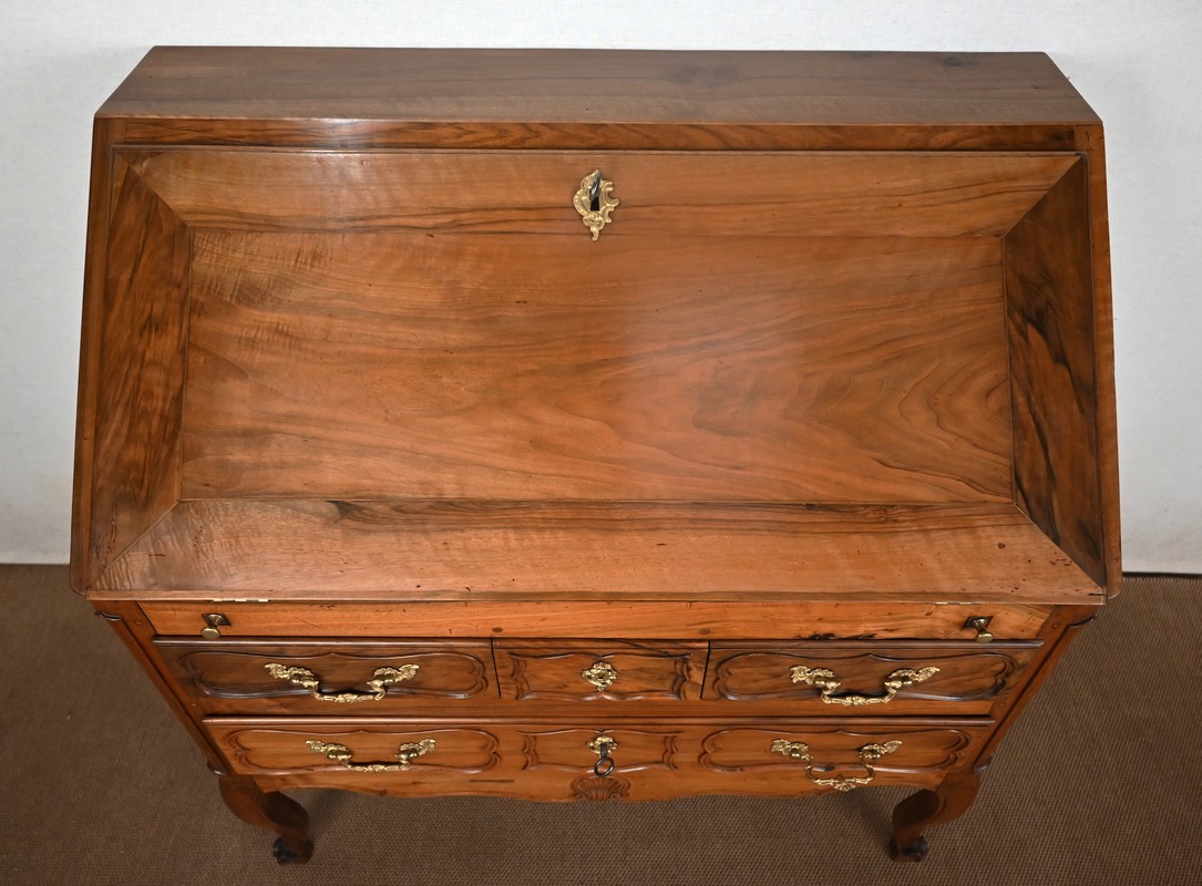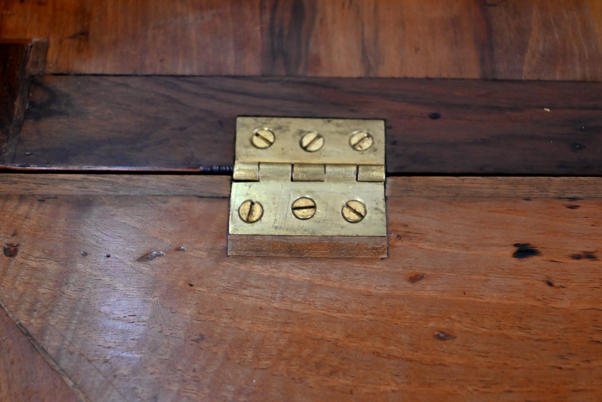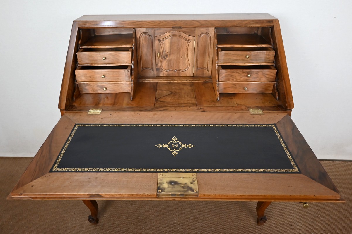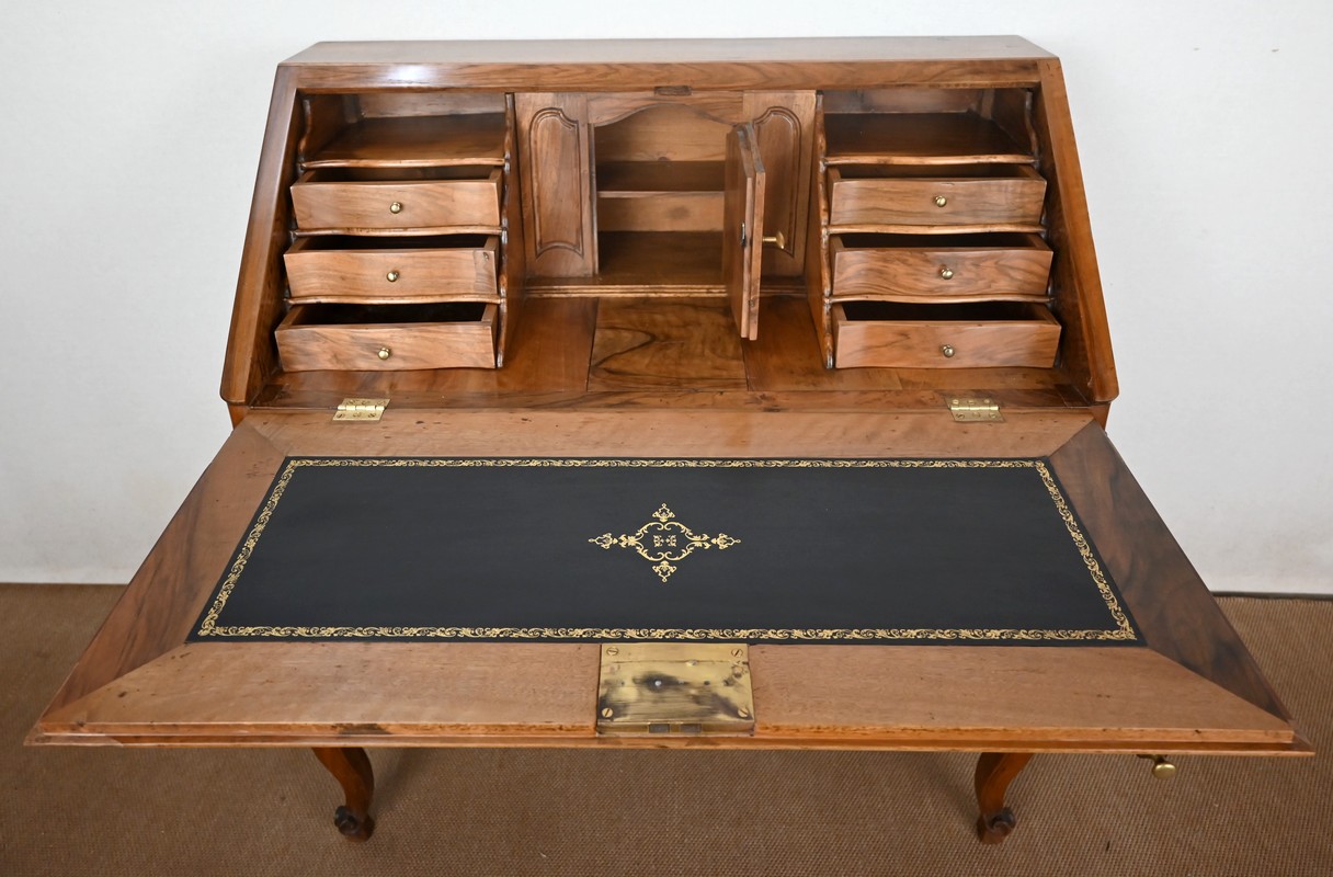 Ce meuble régional, entièrement en noyer massif, dispose d’un important abattant constitué d’un seul panneau au jointement parfait et d’un cadre à coupe d’onglet. Il est équipé d’une serrure d’origine fonctionnelle avec sa clé et son entrée bronze. Ouvert, il repose sur deux supports coulissants à boutons laiton. L’espace écritoire est foncé d’un cuir noir à vignette et motif central dorés. L’intérieur, dit à gradins, propose, de chaque côté, trois tiroirs en forme et, au centre, une porte formant tabernacle avec étagère. Particularité de ce meuble : sa niche, qui dissimule deux fermoirs. Ce système permet de condamner de façon alternée les deux petits tiroirs de la façade.