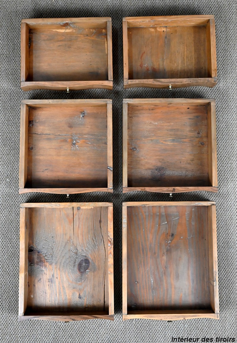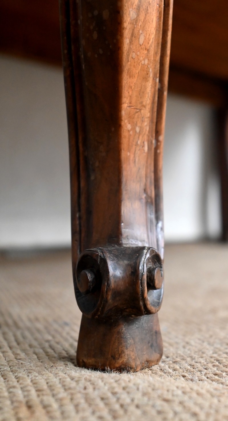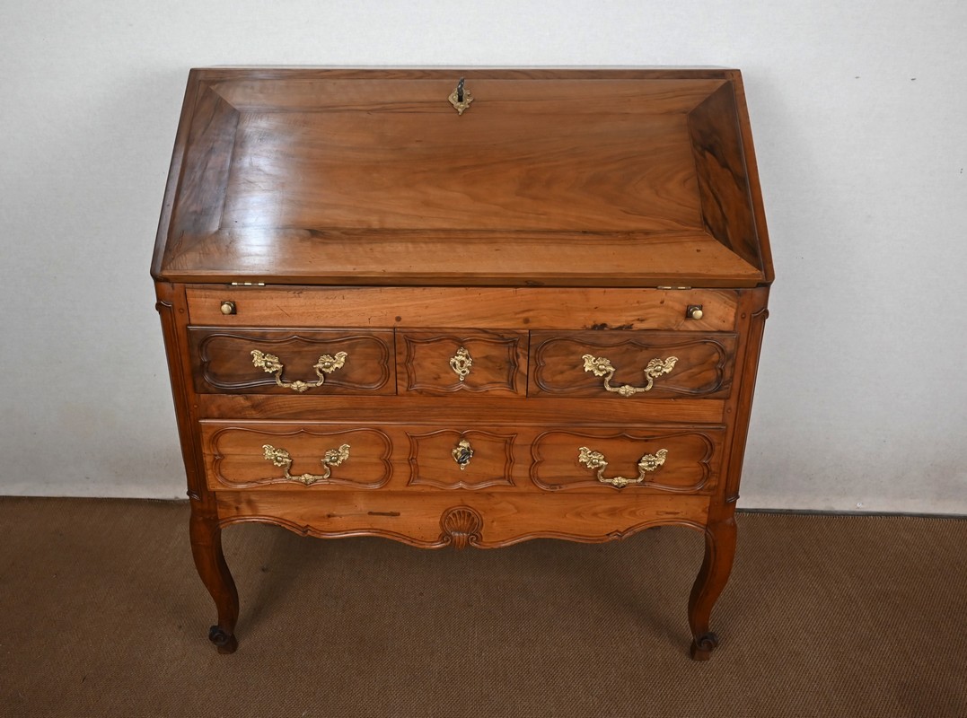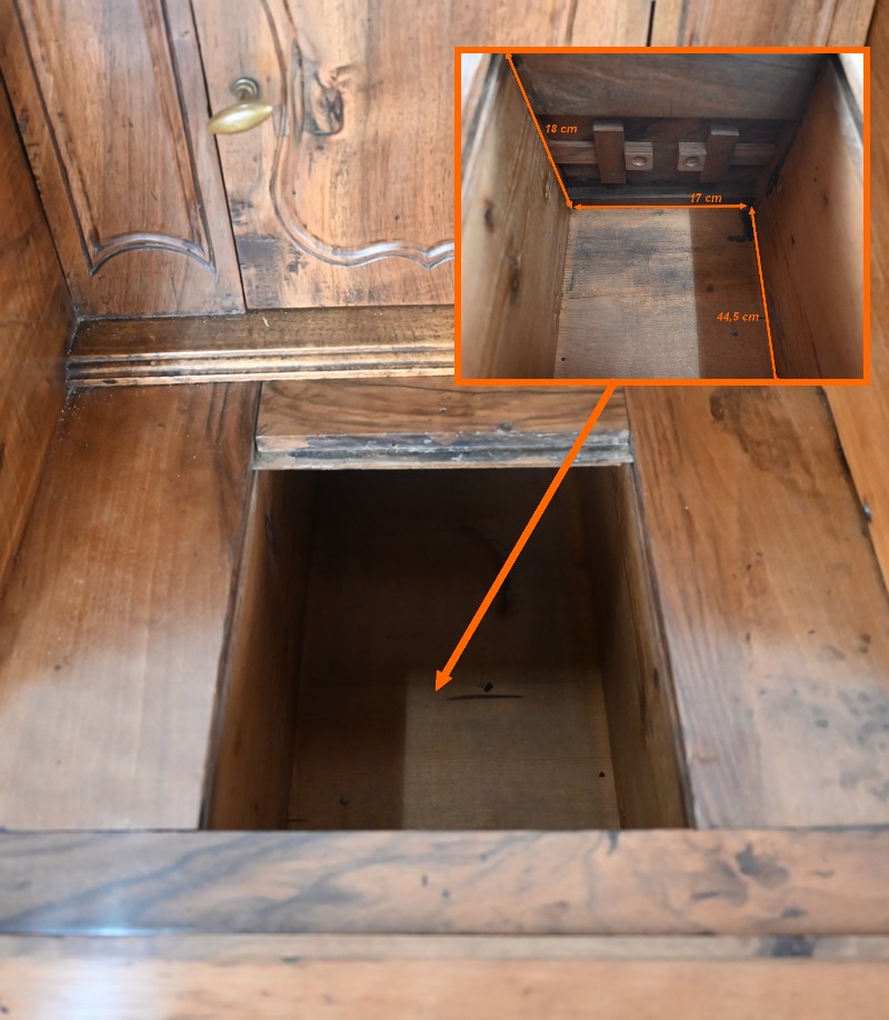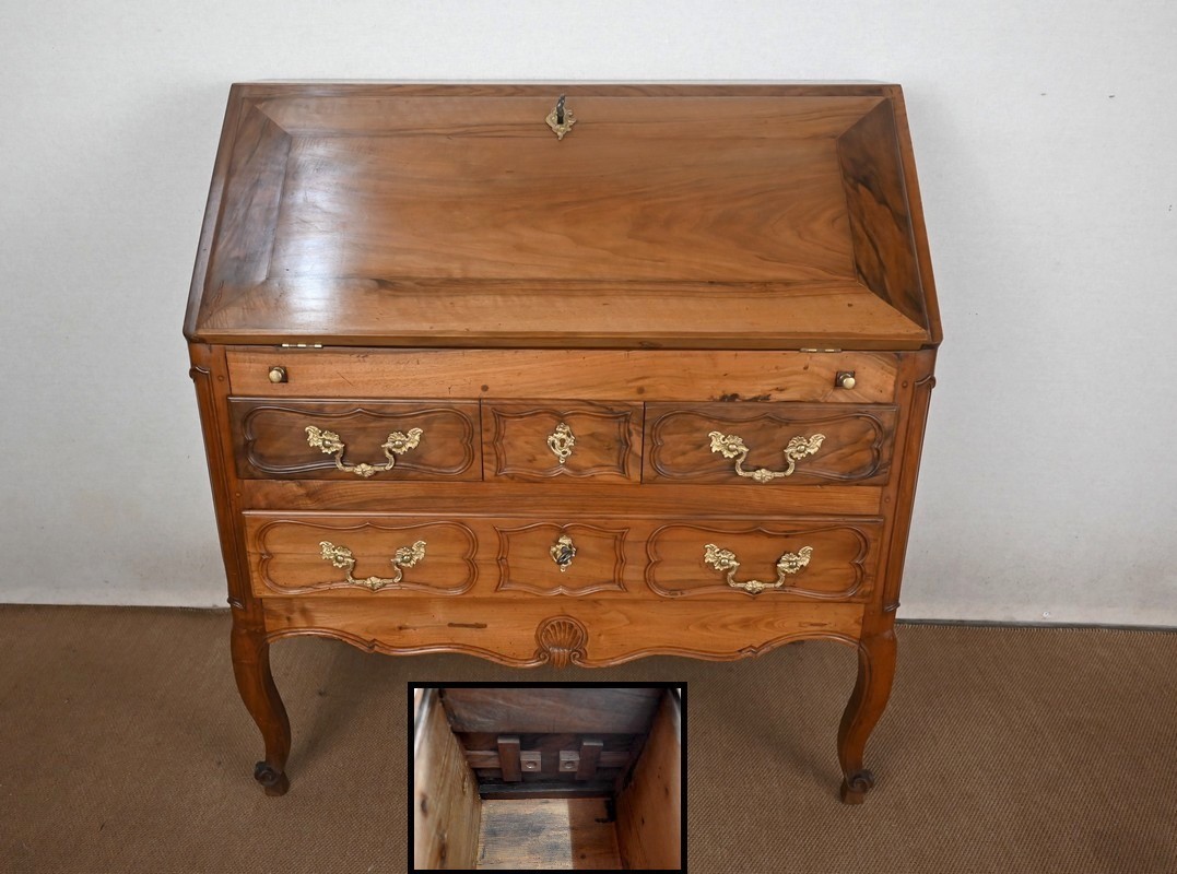 Ce meuble régional, entièrement en noyer massif, dispose d’un important abattant constitué d’un seul panneau au jointement parfait et d’un cadre à coupe d’onglet. Il est équipé d’une serrure d’origine fonctionnelle avec sa clé et son entrée bronze. Ouvert, il repose sur deux supports coulissants à boutons laiton. L’espace écritoire est foncé d’un cuir noir à vignette et motif central dorés. L’intérieur, dit à gradins, propose, de chaque côté, trois tiroirs en forme et, au centre, une porte formant tabernacle avec étagère. Particularité de ce meuble : sa niche, qui dissimule deux fermoirs. Ce système permet de condamner de façon alternée les deux petits tiroirs de la façade.