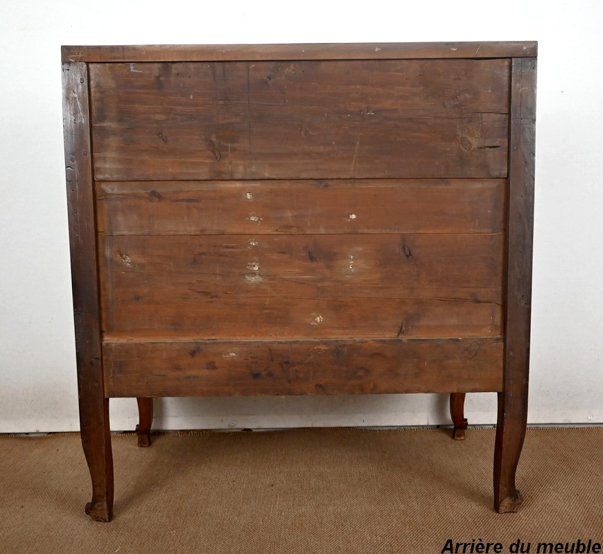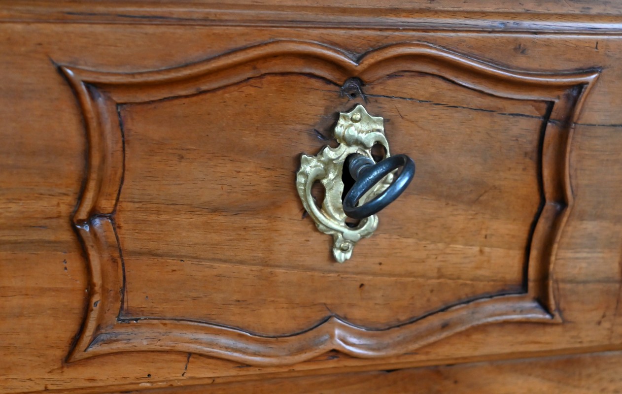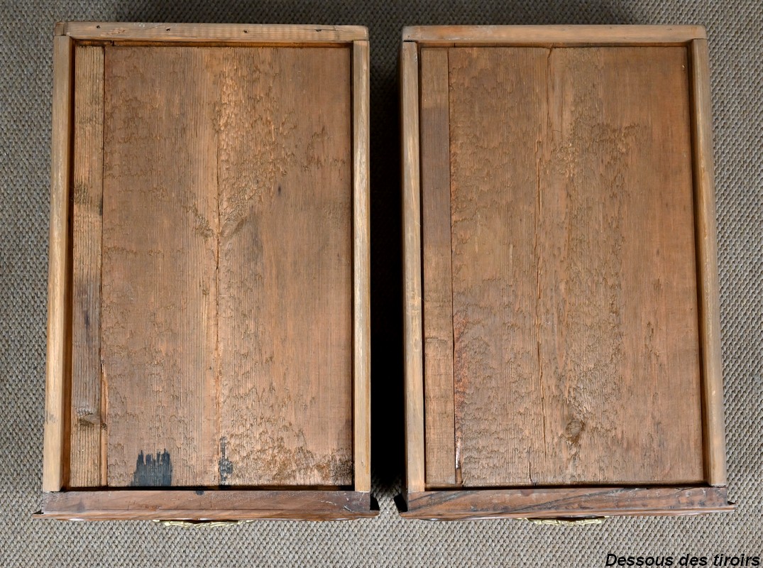 Sous ces derniers s’ouvre un grand tiroir muni d’une serrure d’origine en état de fonctionnement. Tous les trois sont à défoncement, moulurés, et habillés de poignées tombantes en bronze.