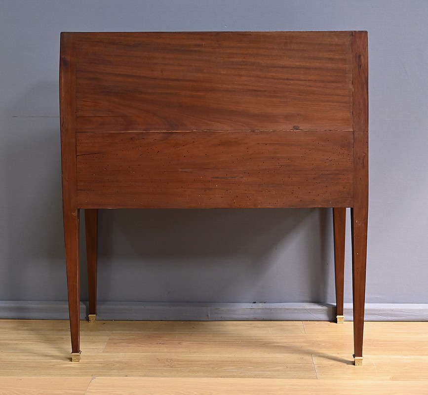 L’abattant, muni d’une serrure fonctionnelle avec entrée Louis XVI sommée d’un ruban, est accompagné de sa clé finement ciselée. Il découvre un intérieur soigneusement aménagé, composé de deux petits tiroirs à boutons lentilles de chaque côté, surmontés d’une large niche centrale. Un ingénieux mécanisme dissimulé permet l’accès à une cache secrète, habilement dissimulée sous une plaque coulissante. L’abattant est tapissé d’un cuir noir neuf, orné d’une vignette dorée et d’un motif central.