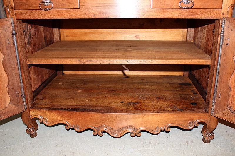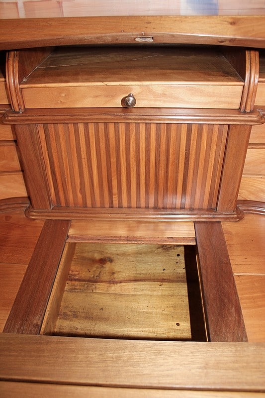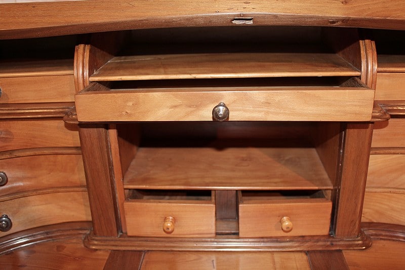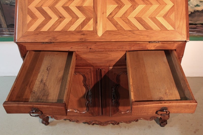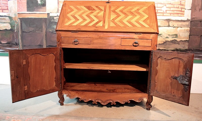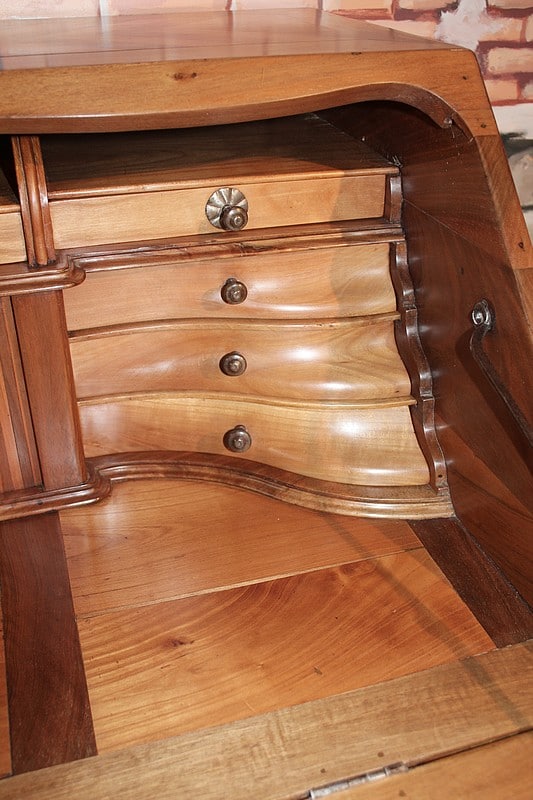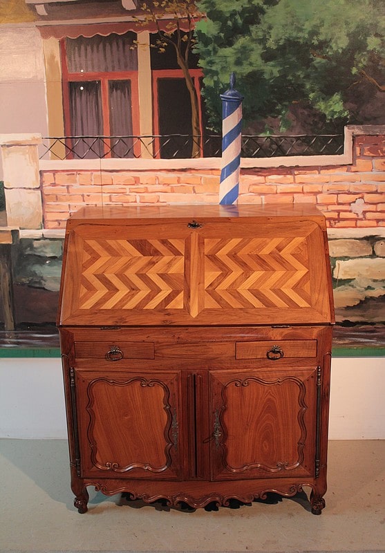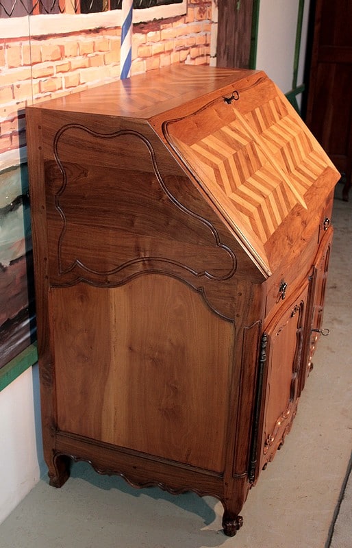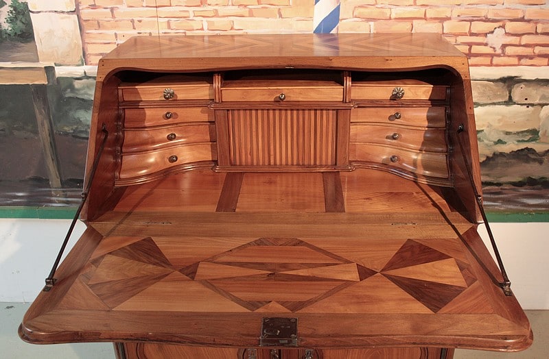 Bureau de pente Louis XV dans l’esprit des meubles de Port, en noyer et merisier marquetés. Il ouvre par un abattant, 2 tiroirs et 2 portes à médaillons. La traverse basse est chantournée et il repose sur des pieds à enroulement. L’abattant, marqueté, découvre 3 tiroirs droits et 6 tiroirs mouvementés en merisier et un rideau coulissant -alternant merisier et noyer- dont l’ouverture peut être bloquée grâce à un mécanisme secret. Sous ce rideau, qui renferme 2 petits tiroirs, une trappe permet l’accès à un casier. L’intérieur du corps bas est garni d’une étagère.